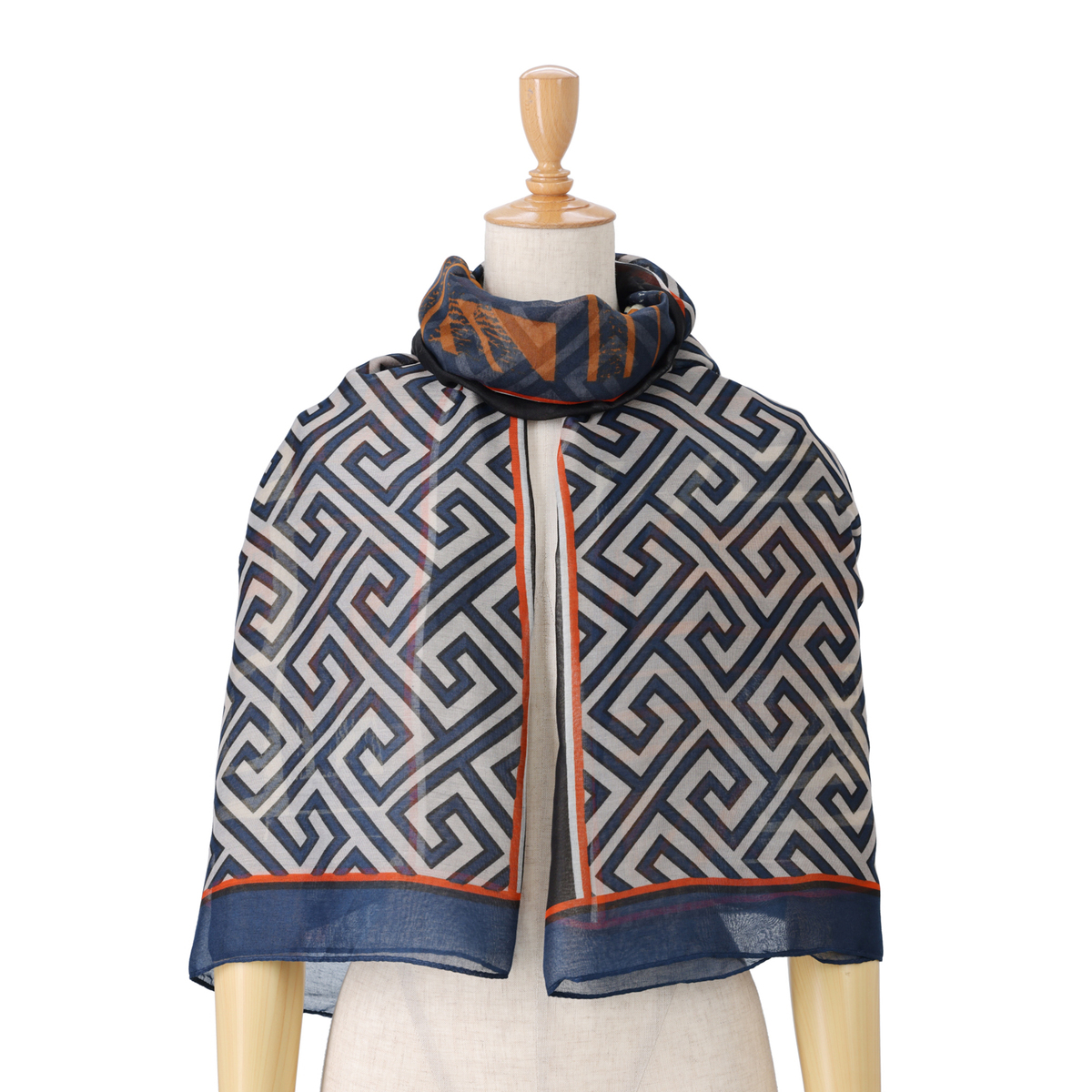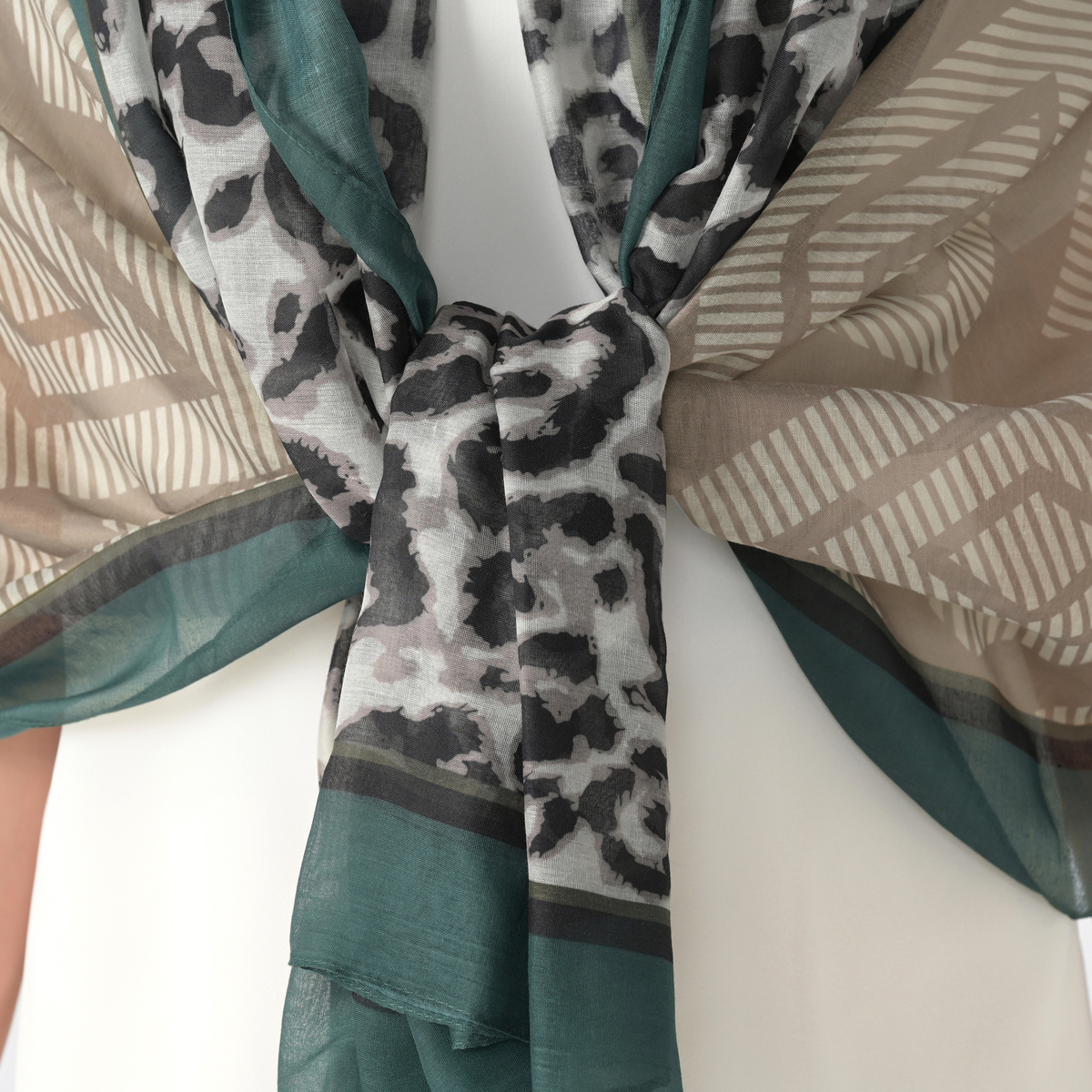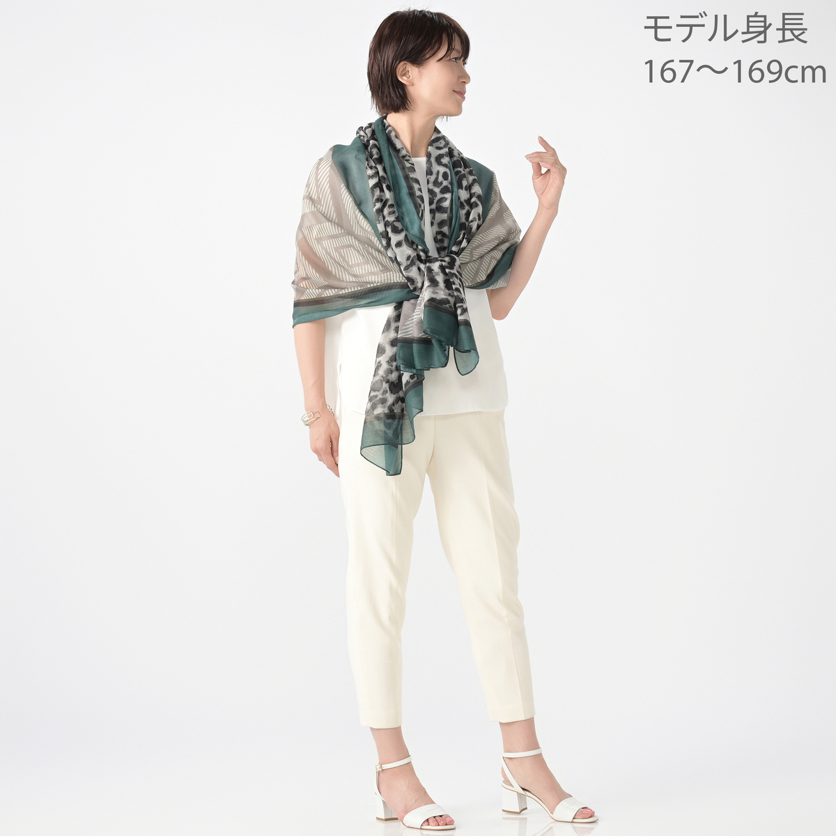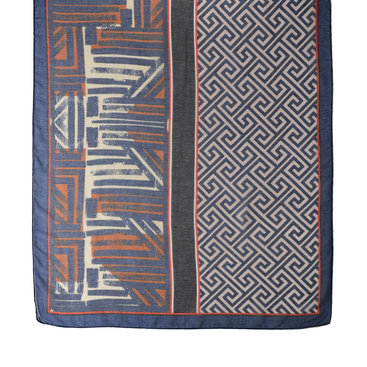 縦長に半分ずつ柄の違う大判ストール。折りたたんでそれぞれの柄だけ見せても、両方の柄感を見せても、お好きに使い分けられます。薄手のボイル素材で、軽くてしなやかな風合いです
