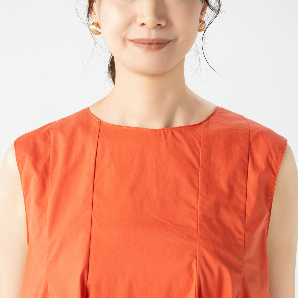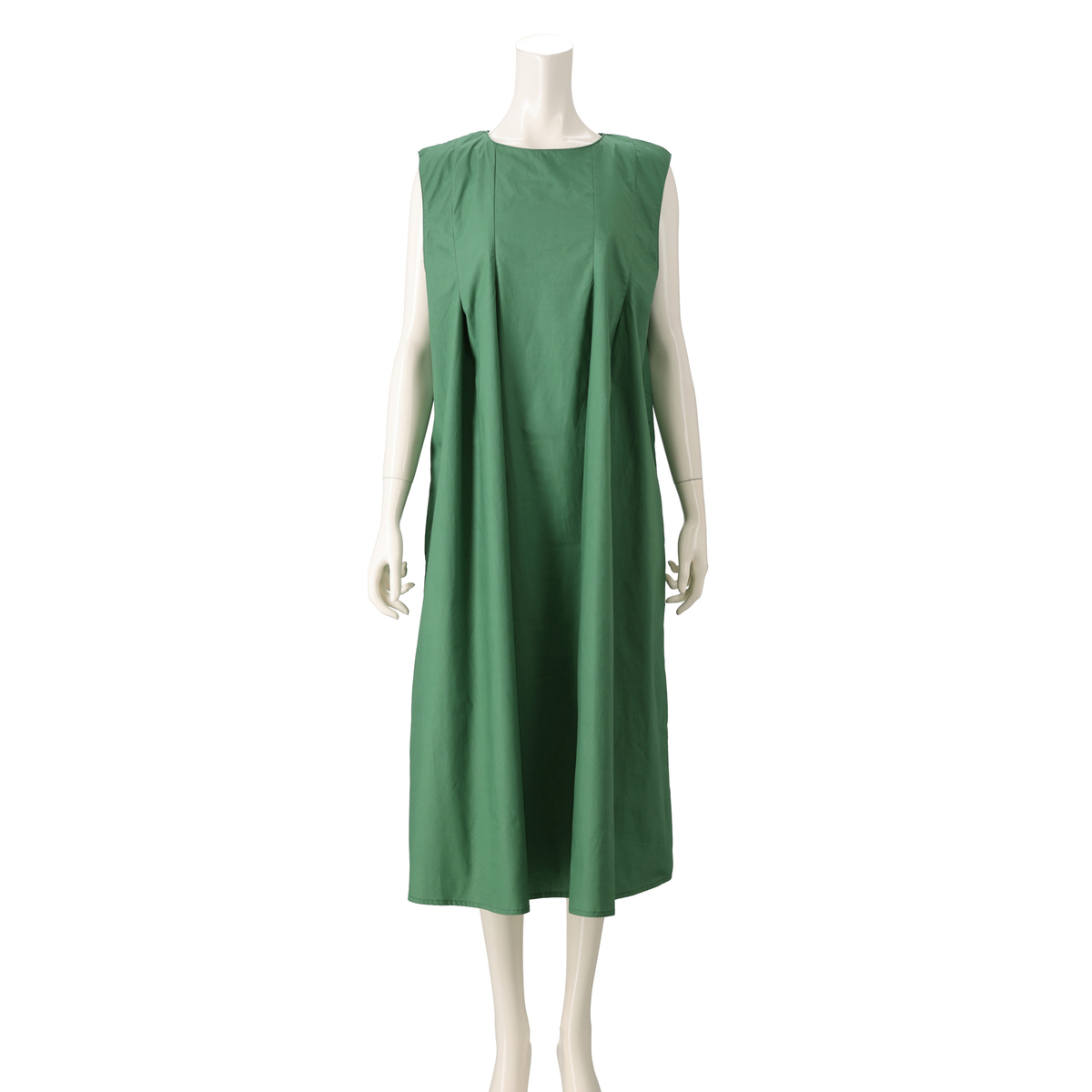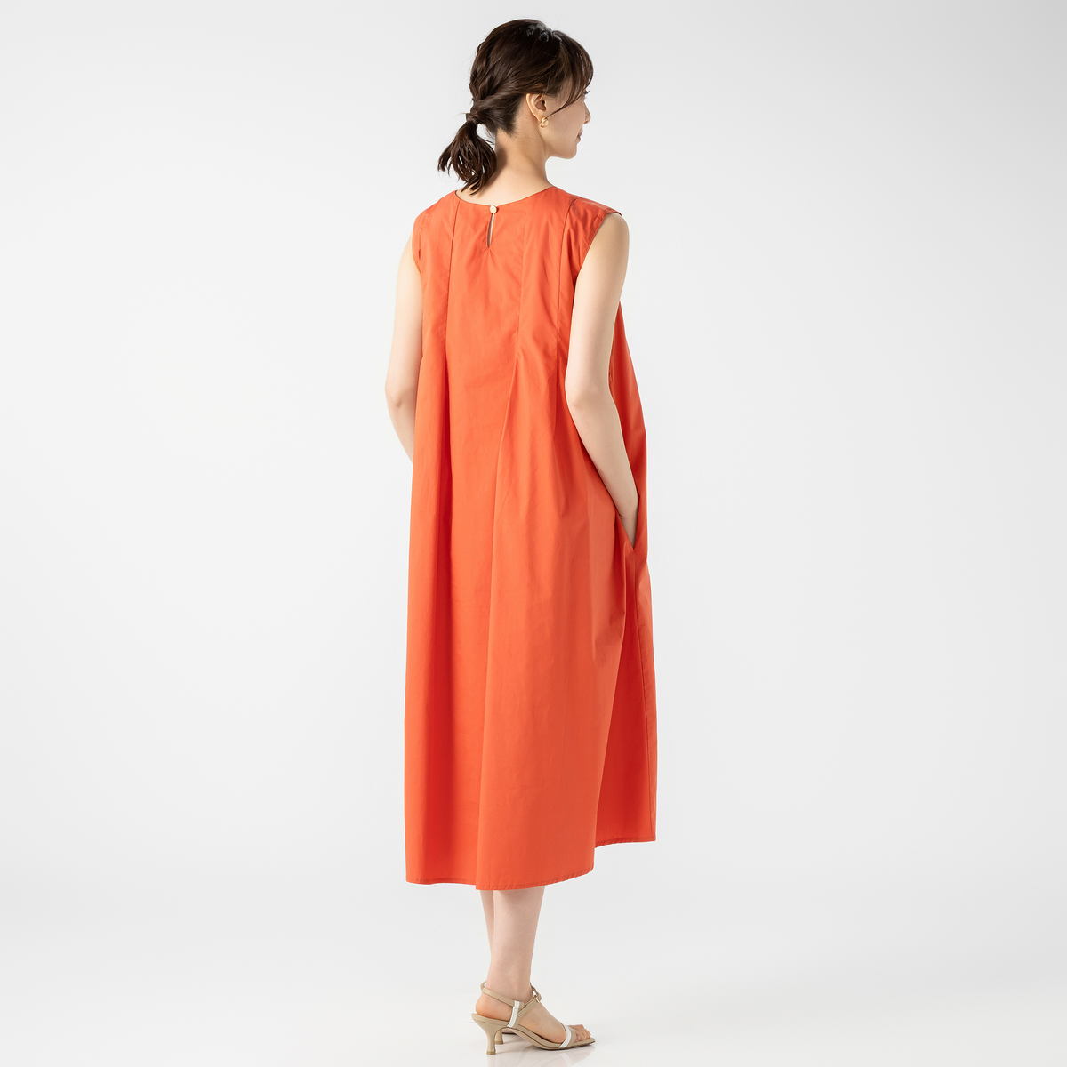 前中心のタックと、広がり過ぎないフレアなラインで、スタイルアップしながら体型カバー。夏はこれ1枚で、春秋はレイヤードスタイルでも活躍するノースリーブタックワンピースです。鮮やかな色目が美しく、さらりとして光沢のある素材を使用しています。両脇にはポケットを付けました