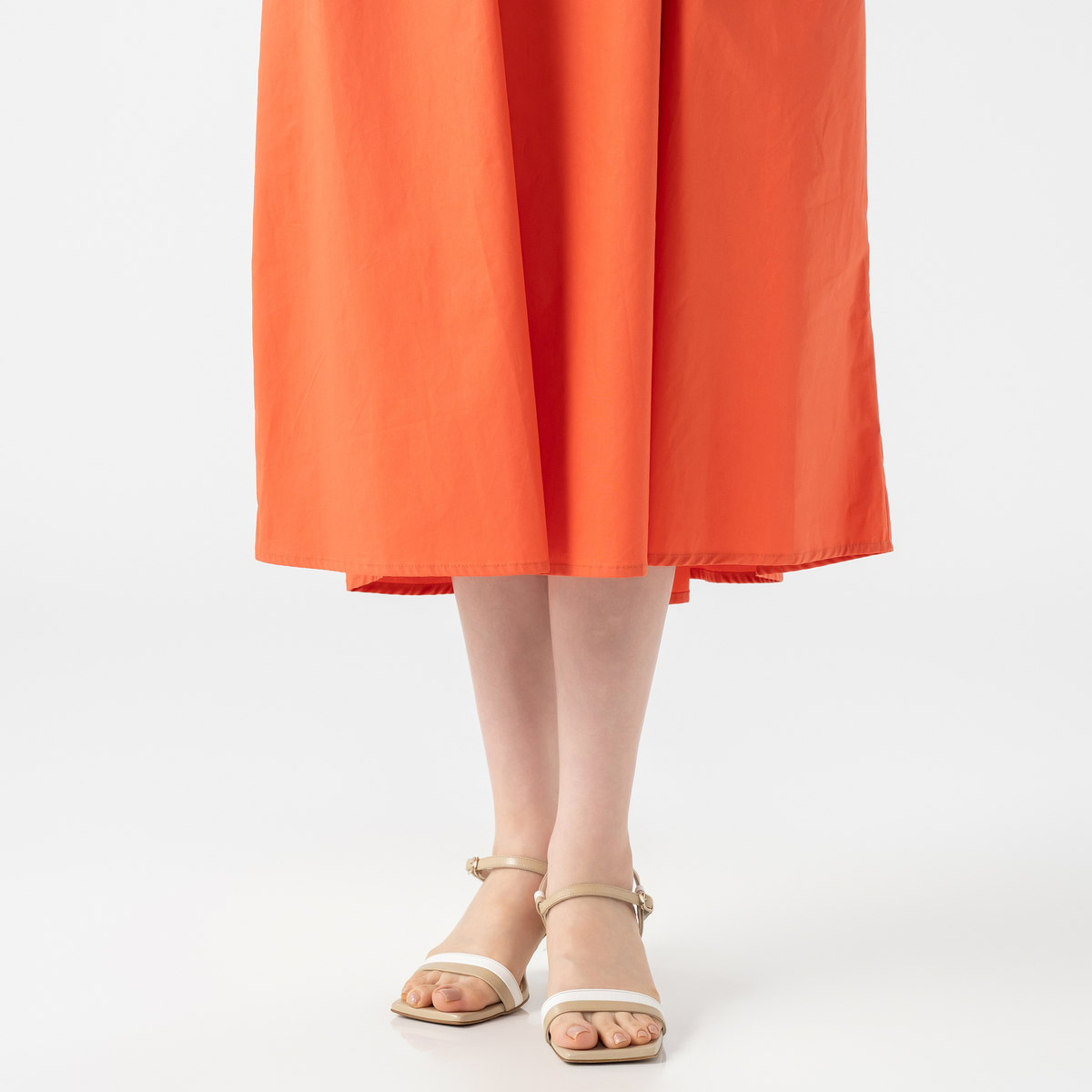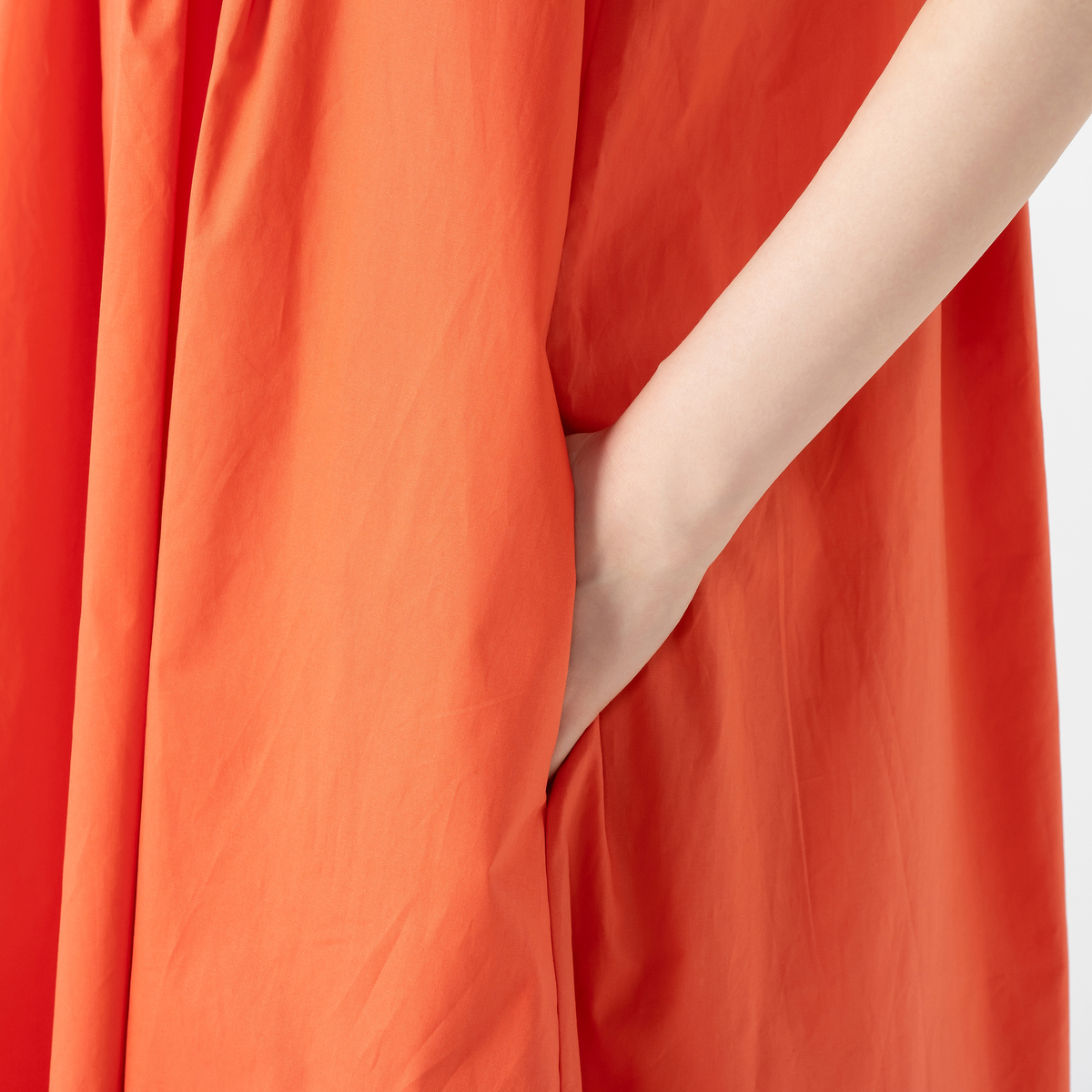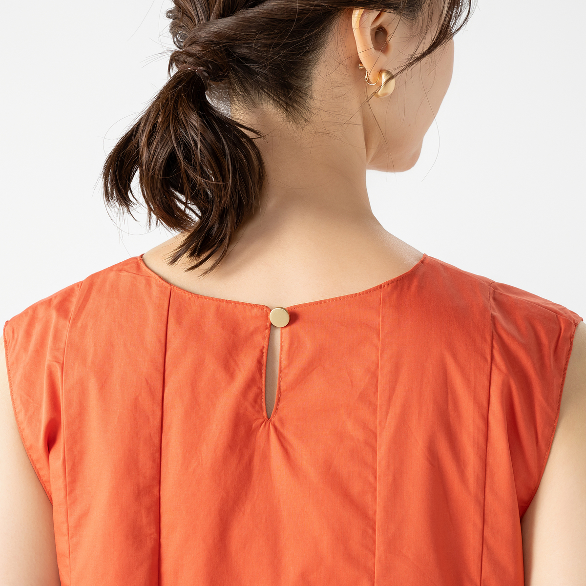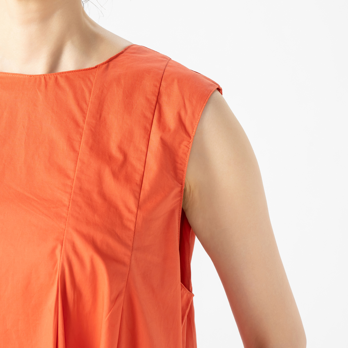 前中心のタックと、広がり過ぎないフレアなラインで、スタイルアップしながら体型カバー。夏はこれ1枚で、春秋はレイヤードスタイルでも活躍するノースリーブタックワンピースです。鮮やかな色目が美しく、さらりとして光沢のある素材を使用しています。両脇にはポケットを付けました
