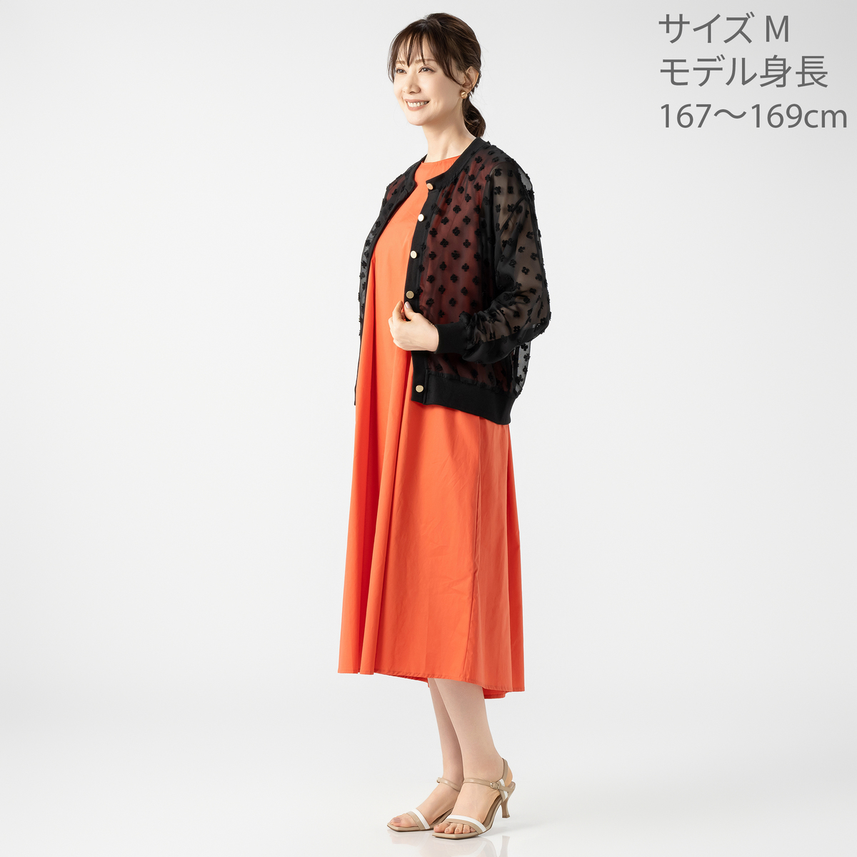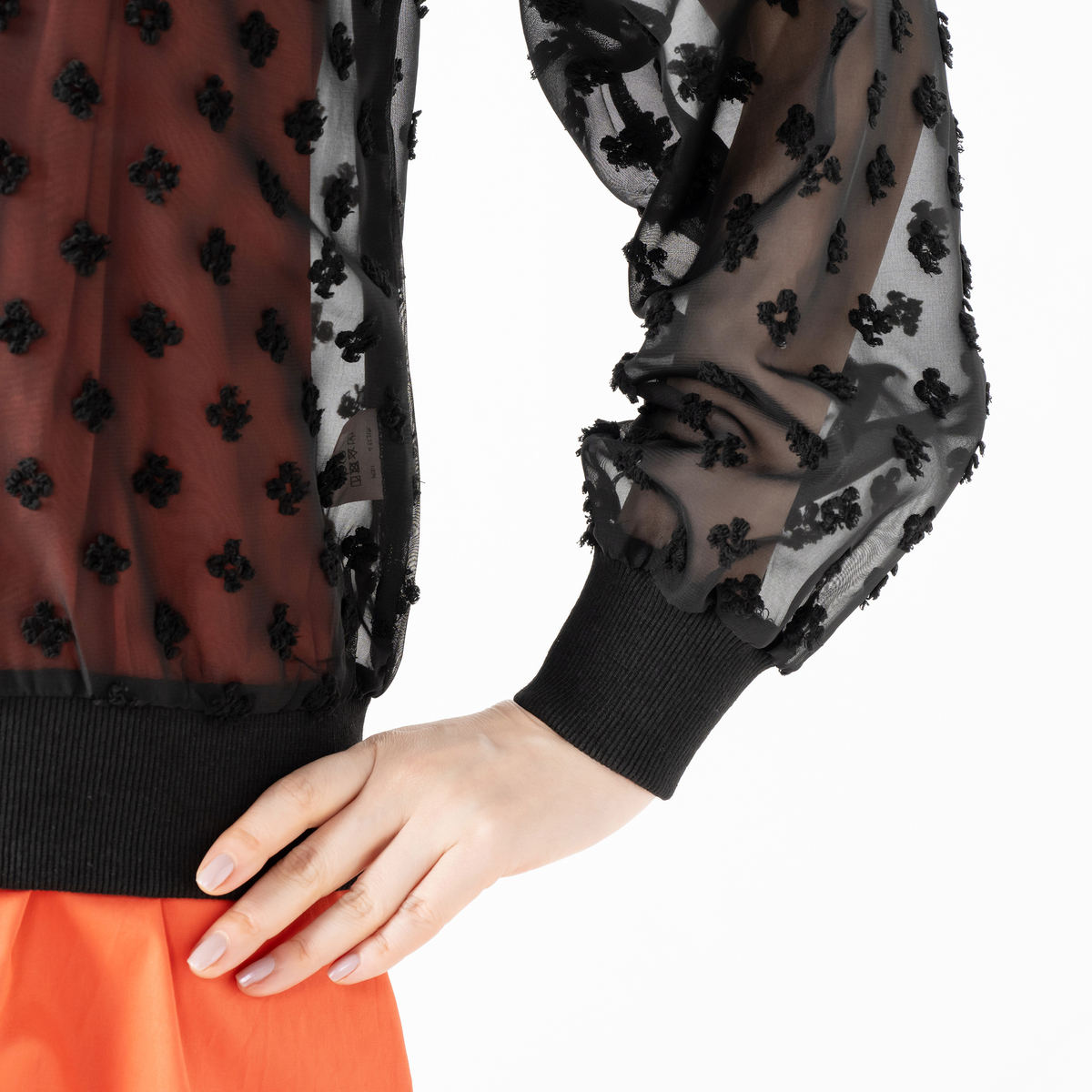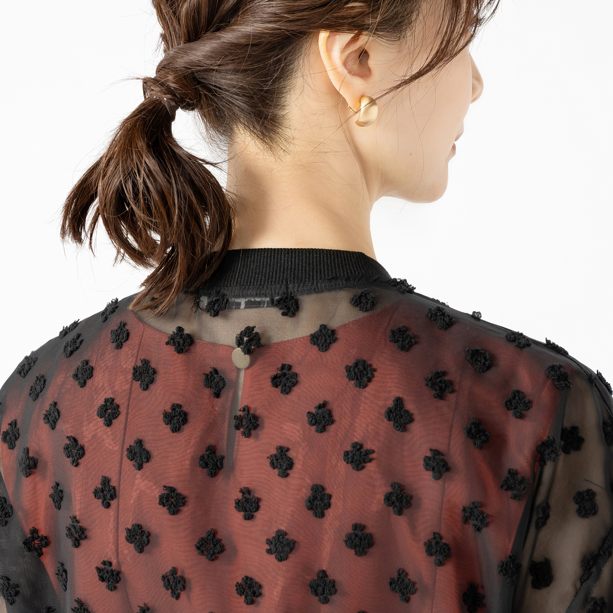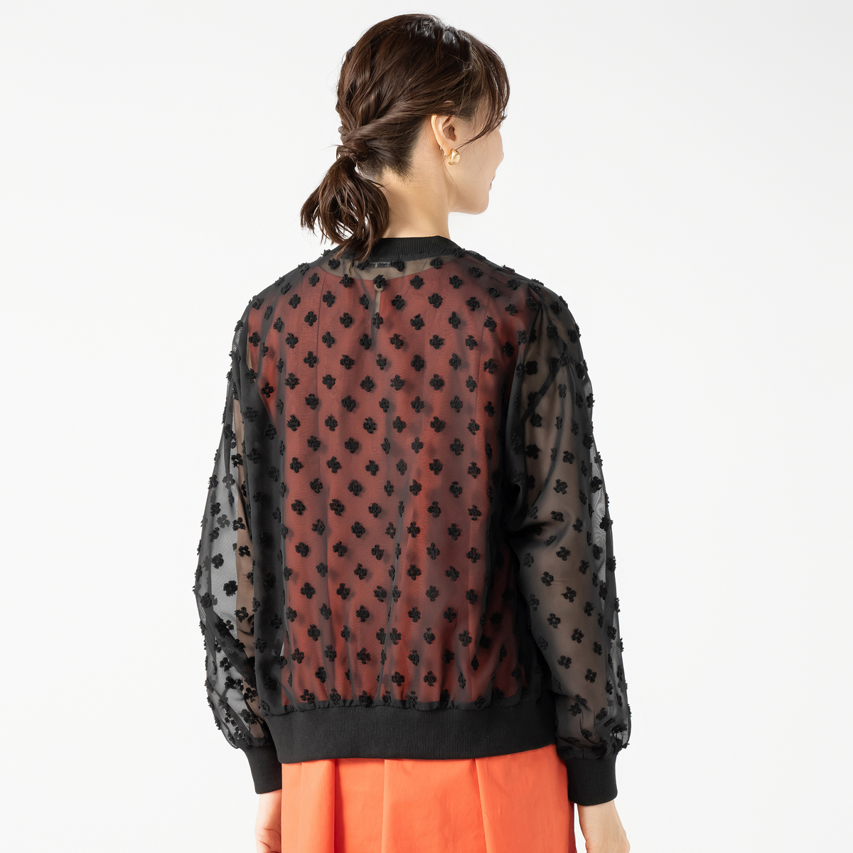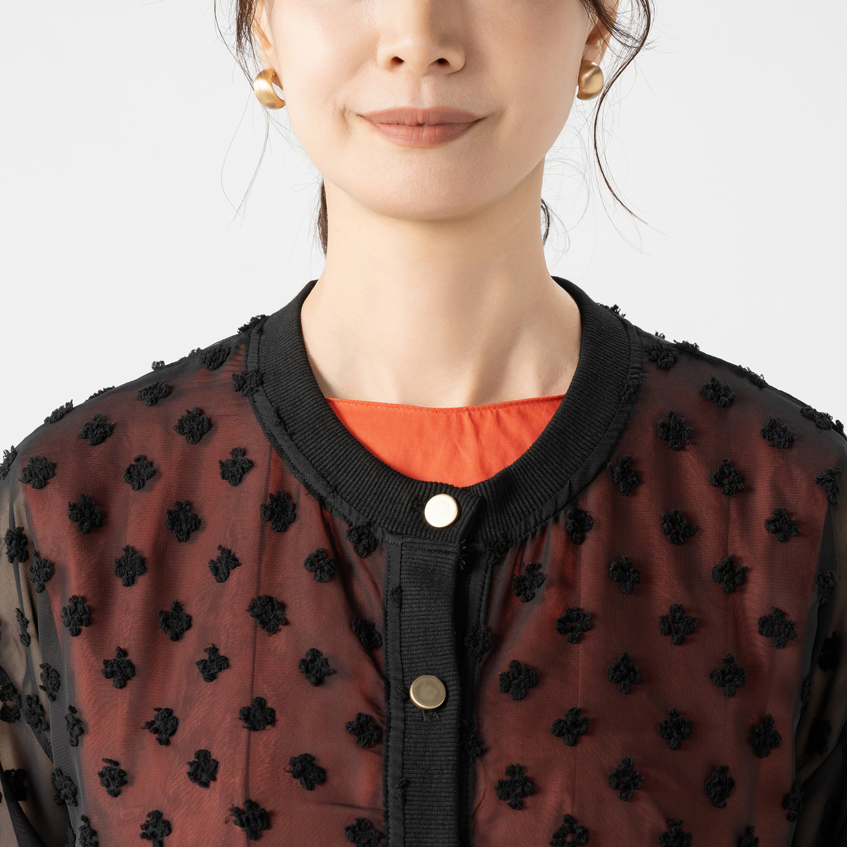 シアー素材に立体的な織り込みモチーフをあしらった、透け感の美しいブルゾン。軽やかなデザインと程よい落ち感も魅力です
