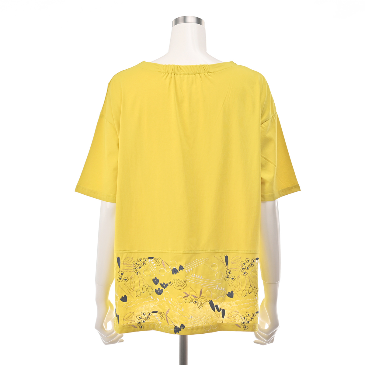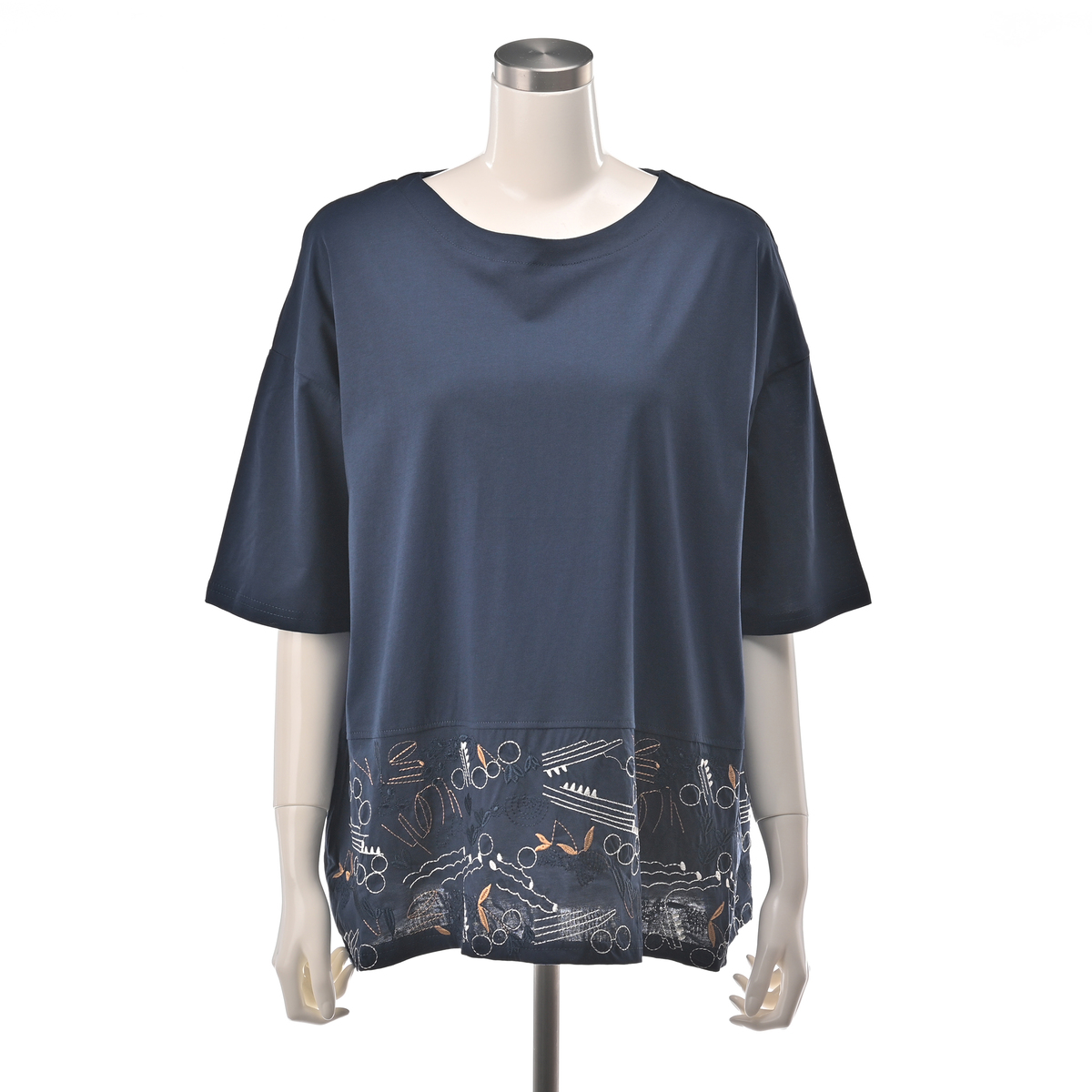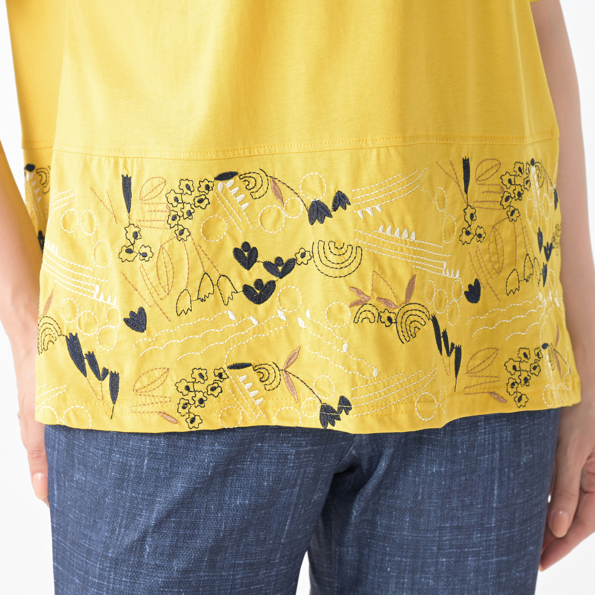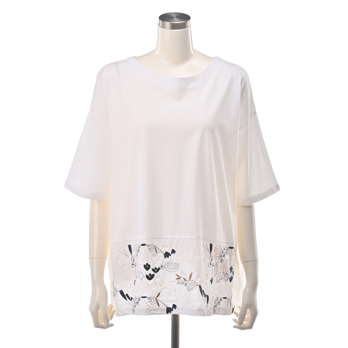 裾の刺繍でフェミニンで甘いスタイルに。シンプルなデザインに華やいだポイントを加えた、1枚で着こなしの主役になる、大人のブラウスのようなTシャツです