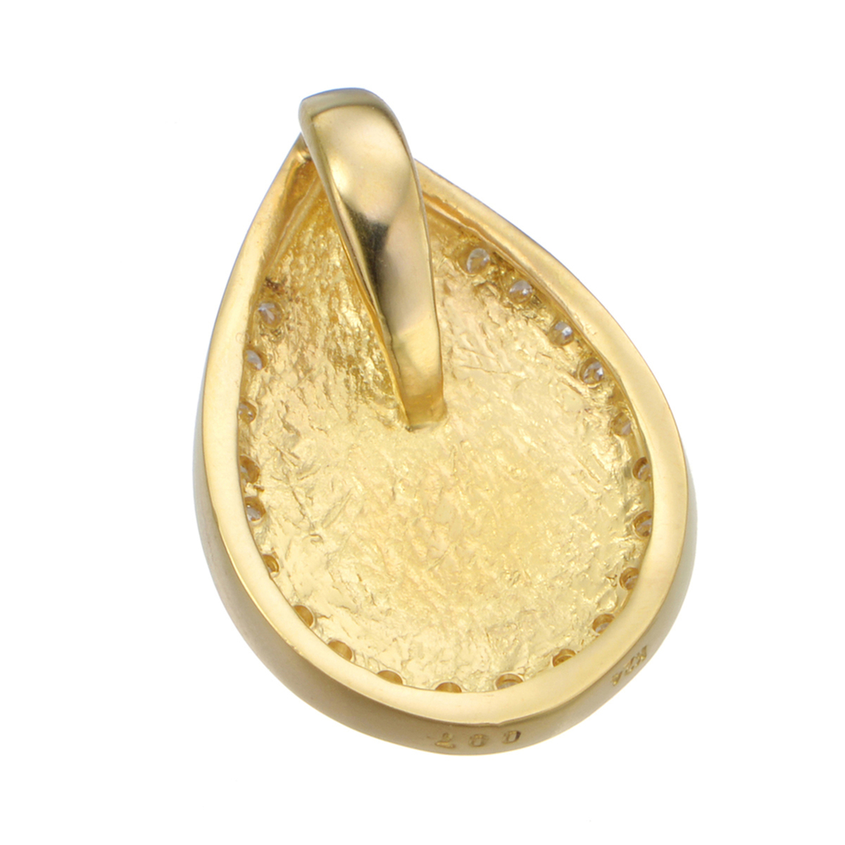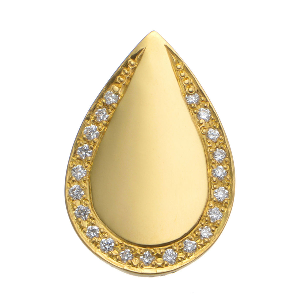 純金を使って、優しい印象を与える雫型フォルムのペンダントヘッドに仕立てました。縁に沿ってダイヤモンドを配した、華やかでおしゃれなデザインに仕上げています