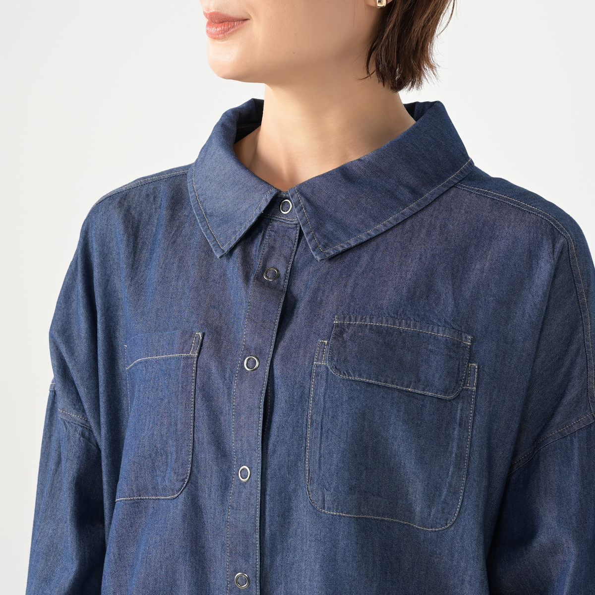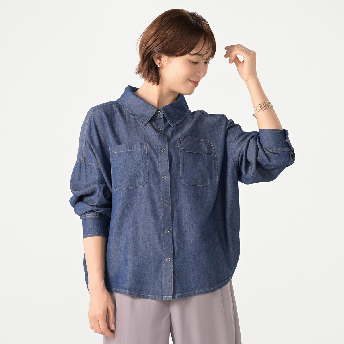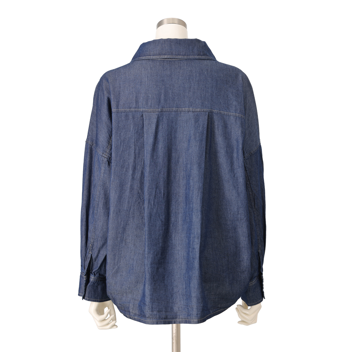 薄手の柔らかいデニム生地を使用。横に広がらず、縦に落ちてすっきりとした印象で着こなせます。前を開けて羽織りアイテムとしてもおすすめの1枚です