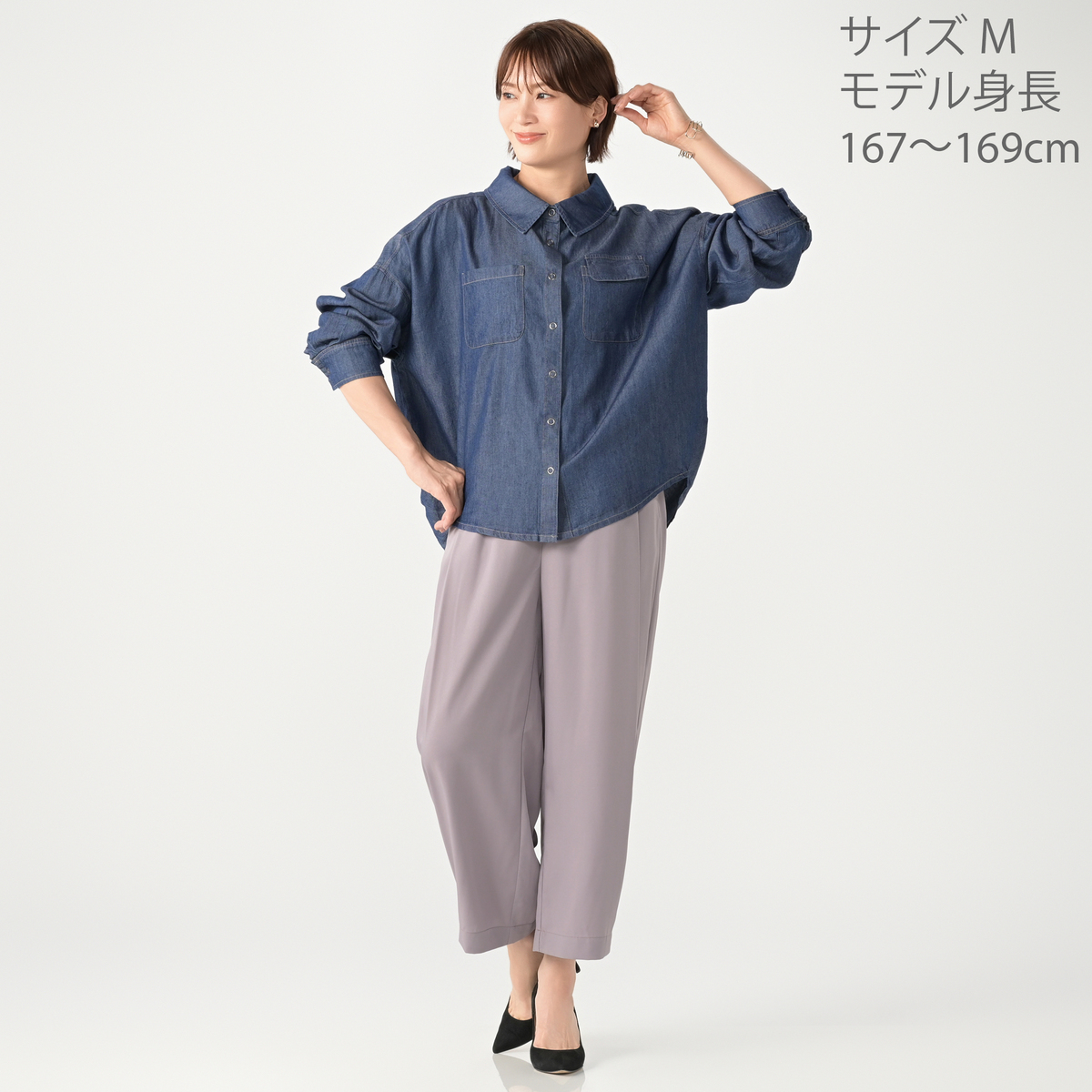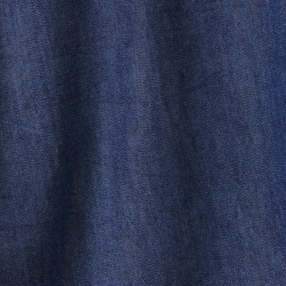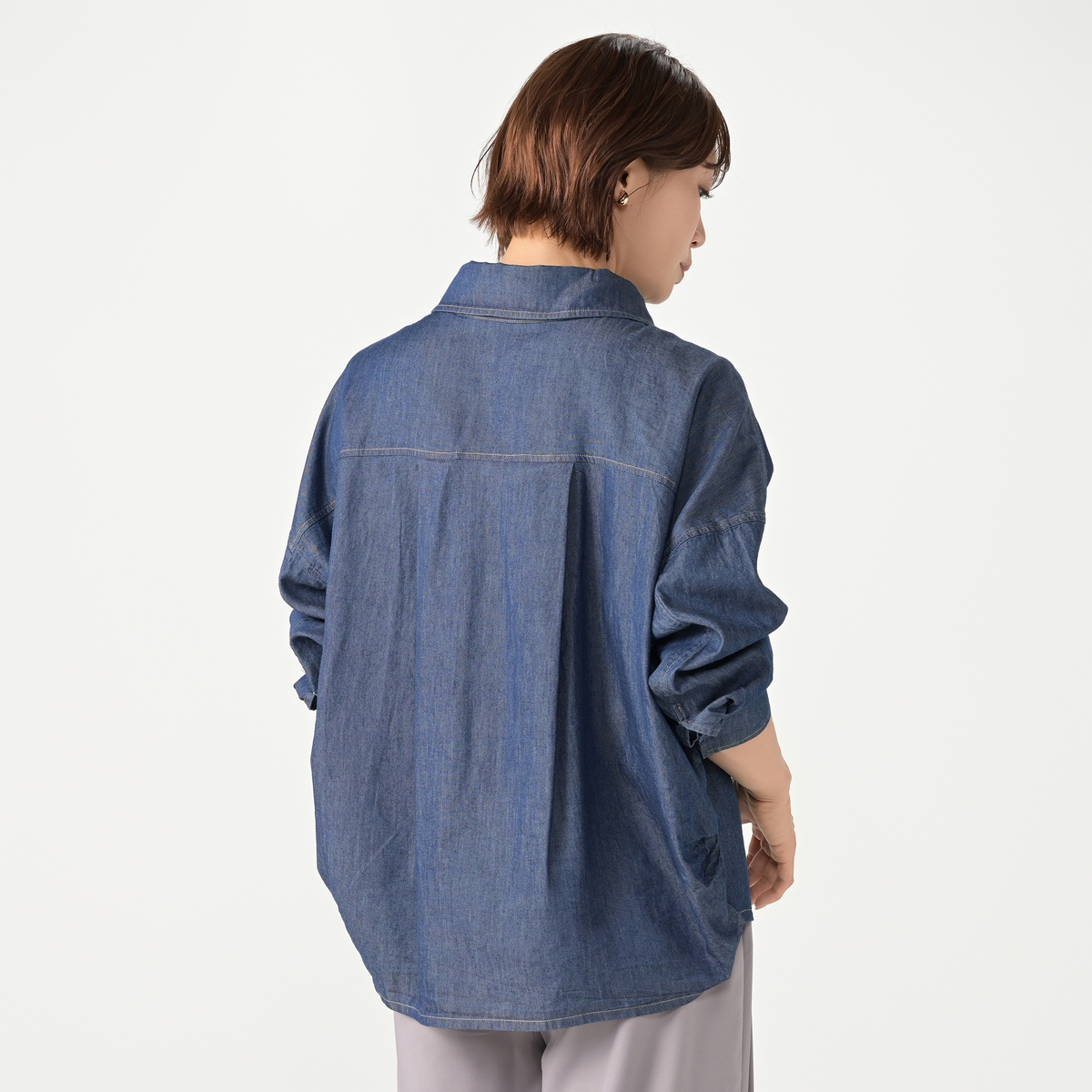 薄手の柔らかいデニム生地を使用。横に広がらず、縦に落ちてすっきりとした印象で着こなせます。前を開けて羽織りアイテムとしてもおすすめの1枚です