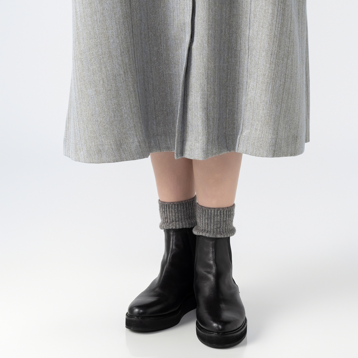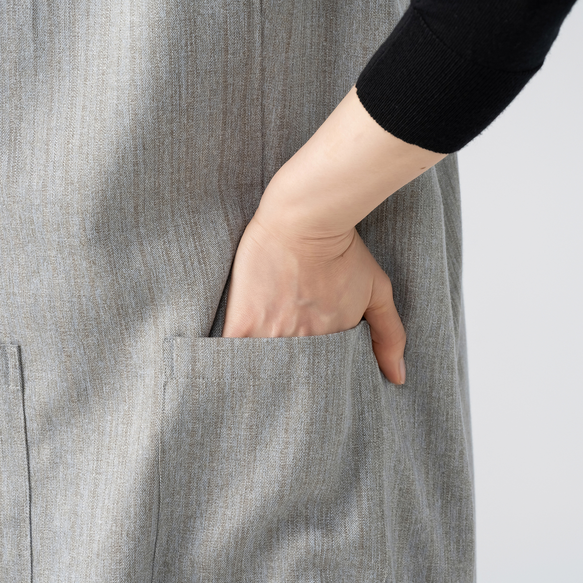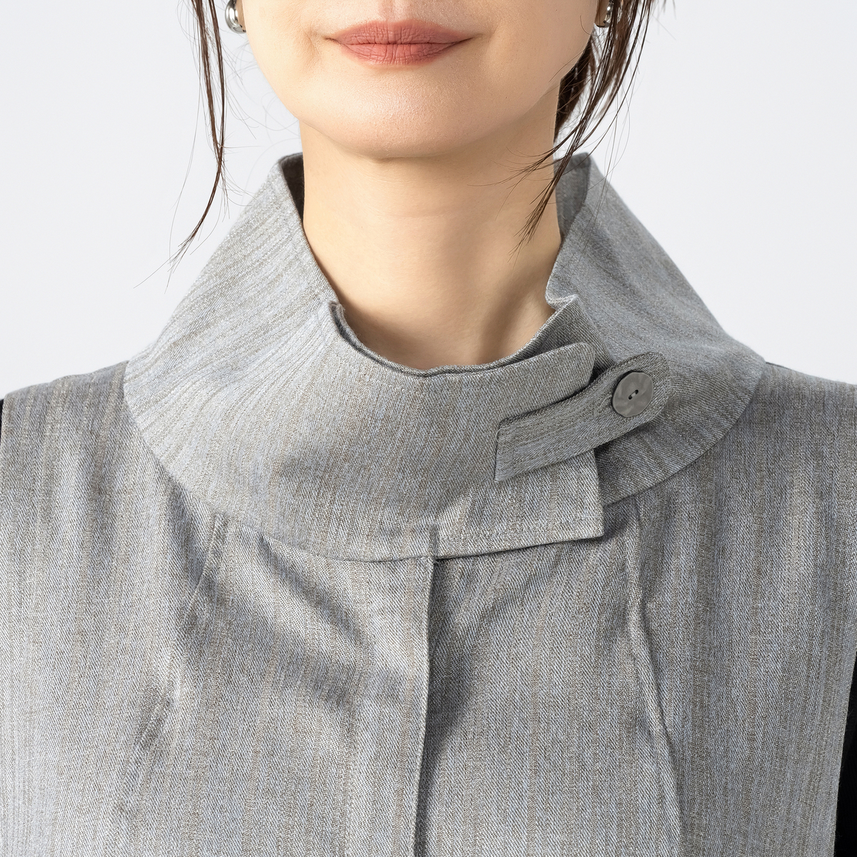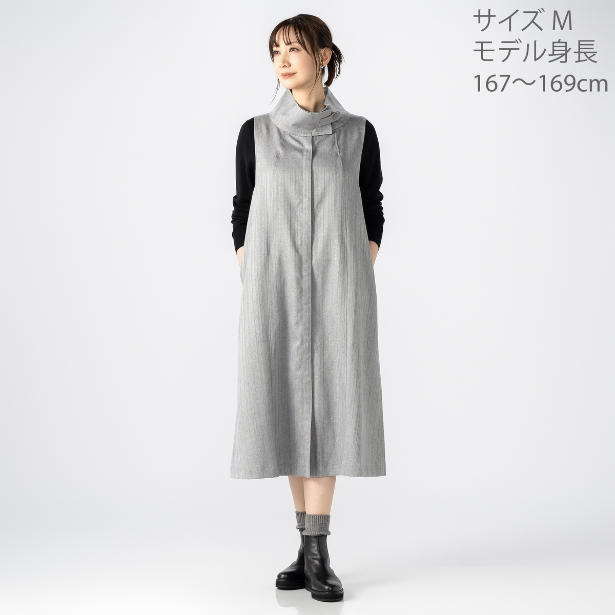 立体的な幅広スタンドカラーがポイントのジャンパースカート。モード感があり、小顔効果も期待できるデザインです