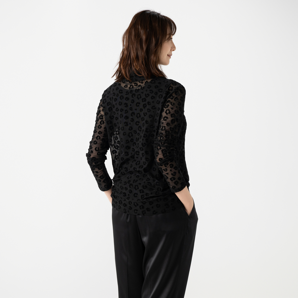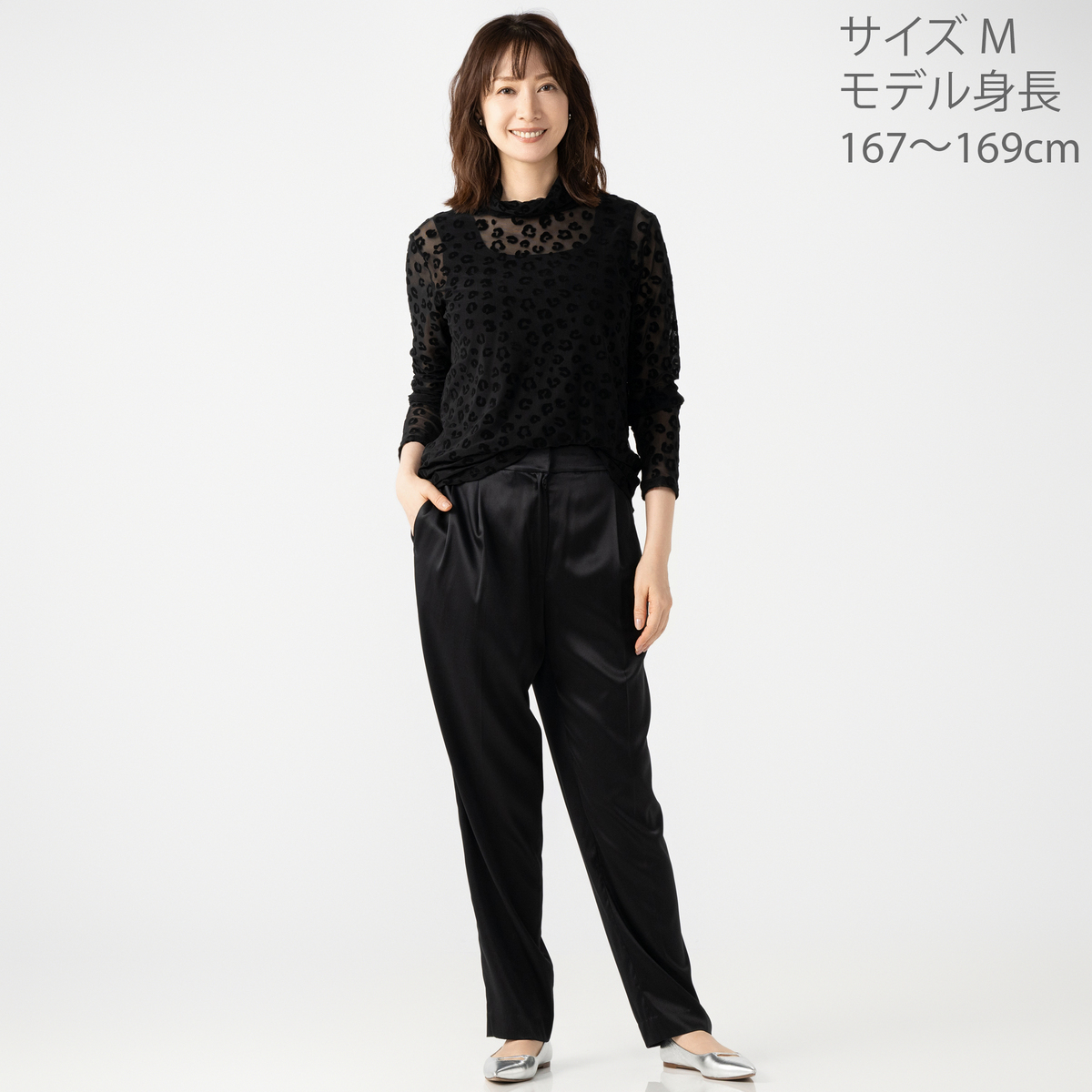 [商品寸法(ヌード)cm] サイズ バスト 着丈 S : 88(72〜80) 60 M : 92(79〜87) 60 L : 97(86〜94) 62 LL : 103(93〜101) 62 3L : 109(100〜108) 62 サイズ 肩幅 袖丈 S : 37 59 M : 38 59 L : 39 59.5 LL : 40 59.5 3L : 41 59.5 [素材] 基布部分:ポリエステル95%、ポリウレタン5% フロック部分:レーヨン、ポリエステル、ナイロン、綿 [お手入れ] 洗濯機洗い可 [注意事項] ※商品寸法の誤差は多少発生します。ご了承下さい ※洗濯の際には必ずネットを使用して下さい ※洗濯後はすぐに脱水し、形を整えて干して下さい。長時間水につけたままにしないで下さい ※洗濯・クリーニングの際、色落ちすることがありますので他の物と分けて洗って下さい ※濃色製品は着用中の摩擦により色移りすることがあります。また、雨や汗等で濡れた状態で着用すると色移りすることがあります。その際はお早めに洗濯をして下さい ※直射日光や蛍光灯の影響で変色することがありますのでご了承下さい ※素材の特性上、着用や洗濯・クリーニング時の摩擦により毛羽立ち、毛玉が発生します。その際はお早めに毛玉取り器等で手入れをして下さい ※デリケートな素材を使用していますので、爪やアクセサリーなどの引っ掛かりによりキズがつきやすくなっております。縫目や生地を強く引っ張らないよう注意して下さい ※アイロンの際は、あて布をご使用下さい 【中国製】