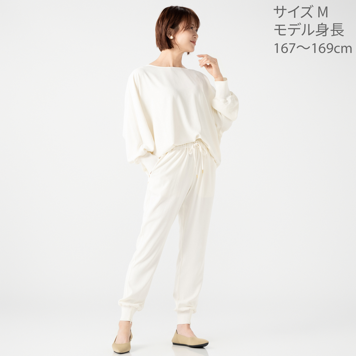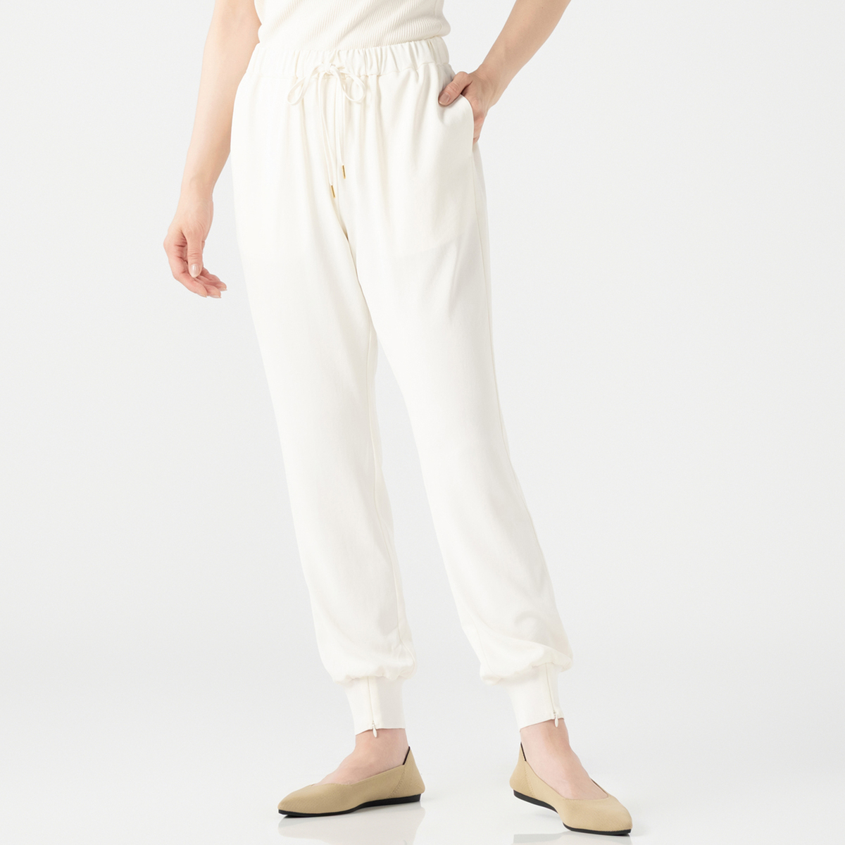 ウエストは総ゴムのプルオンタイプ。裾はリブを編立てたジョッパーズシルエットで、裾リブのセンターフロントはファスナーで、開閉可能です