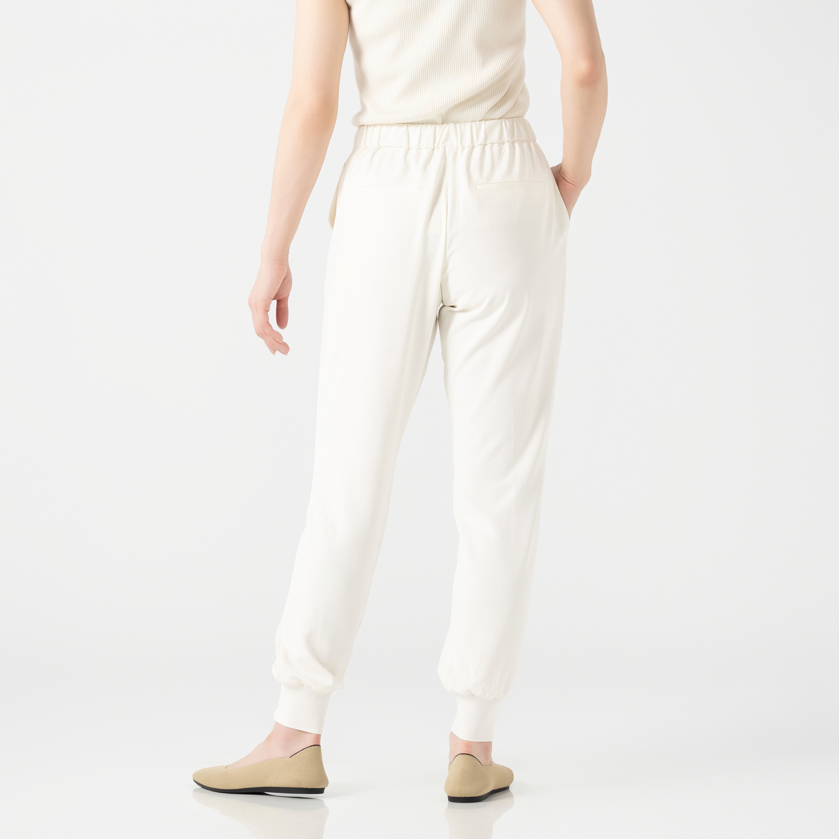 とろみ感のあるバックサテンジョーゼットのジョガーパンツ。あえてサテン目を表面に使用することで、絶妙な光沢が高級感を演出しています