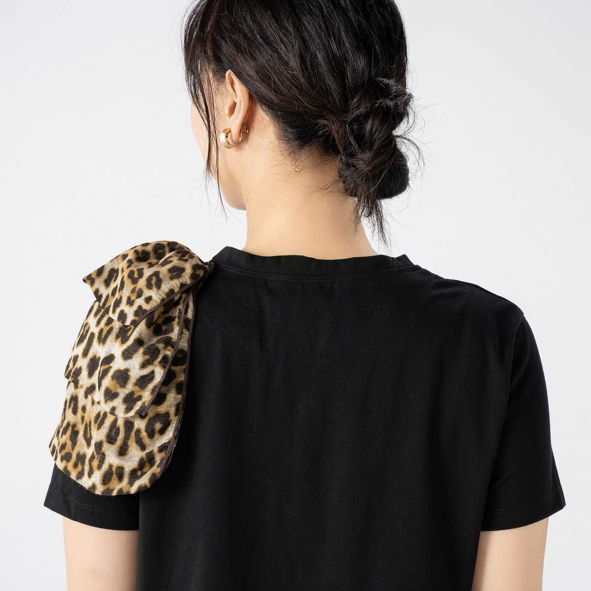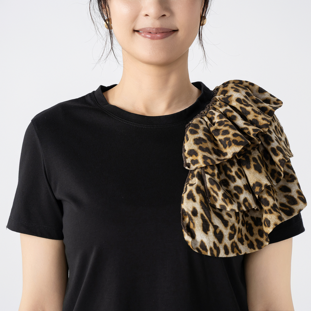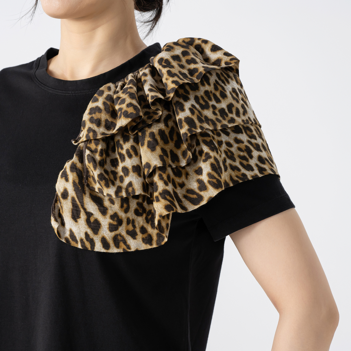 左肩だけに施したアシンメトリーな3段フリルが遊び心あふれる半袖Tシャツです。ふんわりとしたフリルが視線を集め、コーディネートの主役に。シンプルなTシャツにアクセントを効かせています