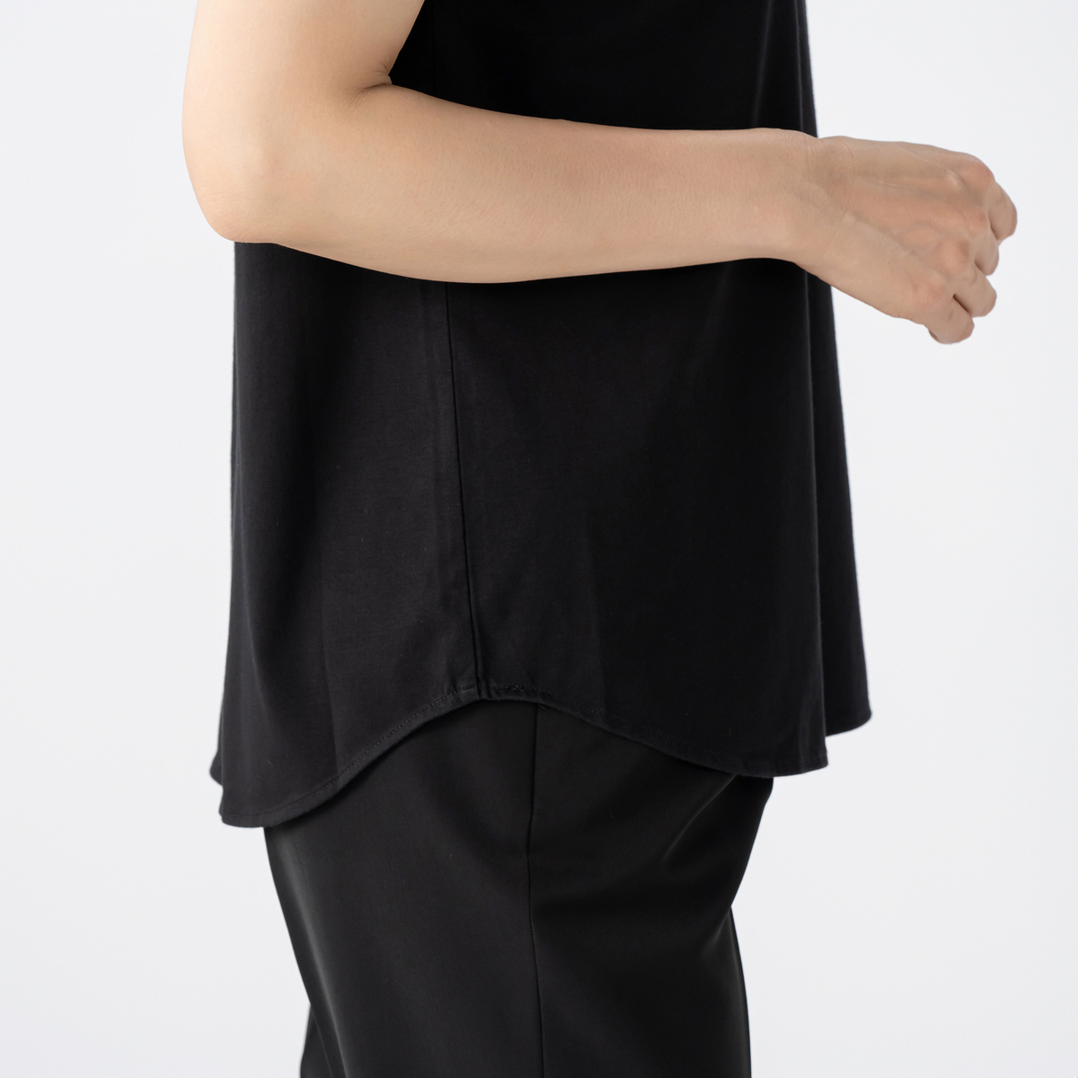 本体は、レーヨンと綿が調和した手触りの良い綿混素材を使用。ヒップをカバーするゆるやかなラウンドヘムで、タックインもアウトも自在。デニムやワイドパンツと合わせて、日常からお出かけまで幅広く楽しめます