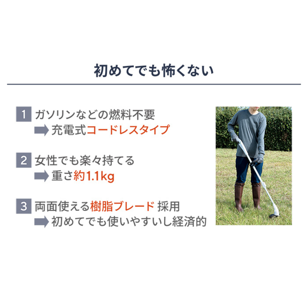 場所を選ばず使える充電式のコードレス草刈機。約1.1kgの軽量設計で、女性でも無理なく作業できます