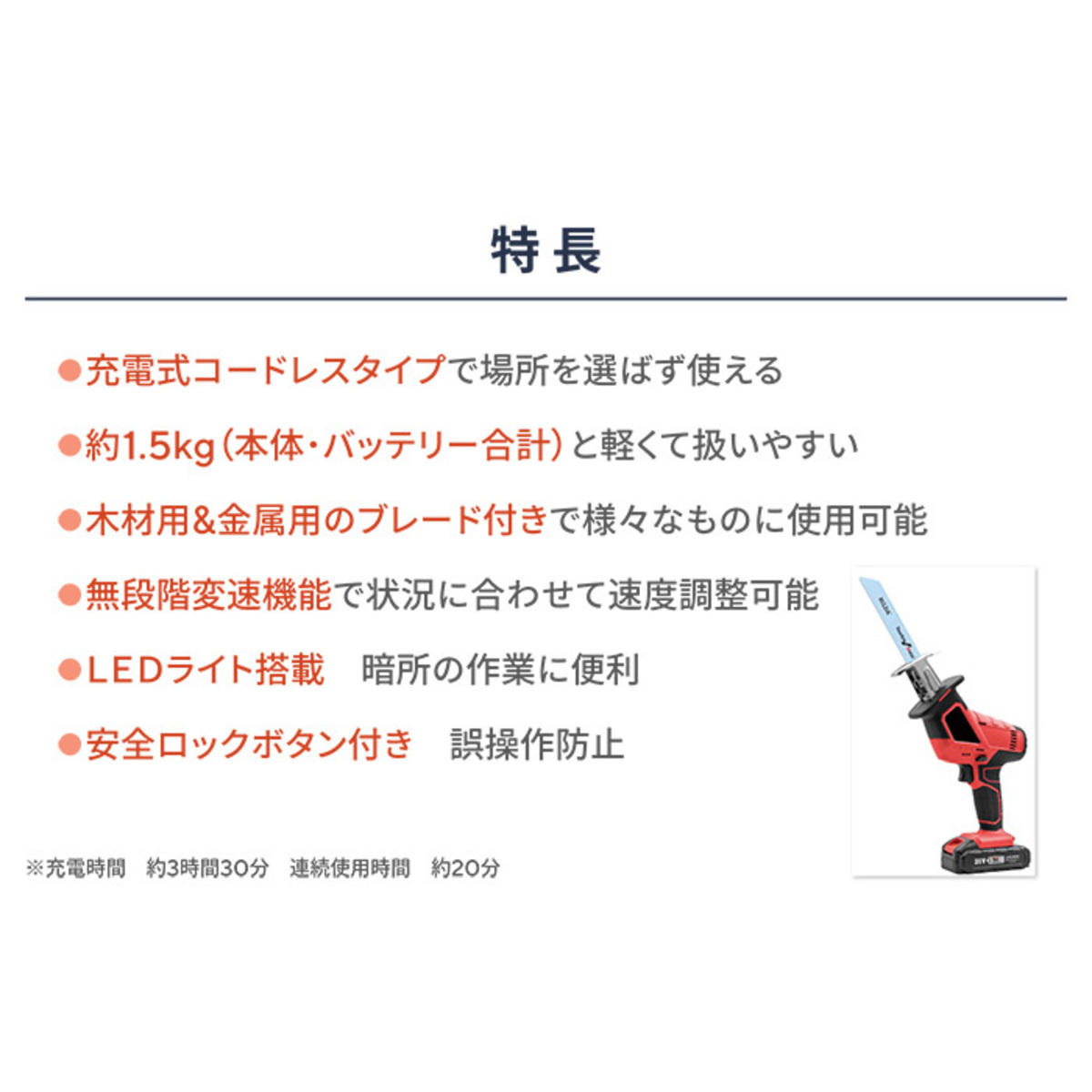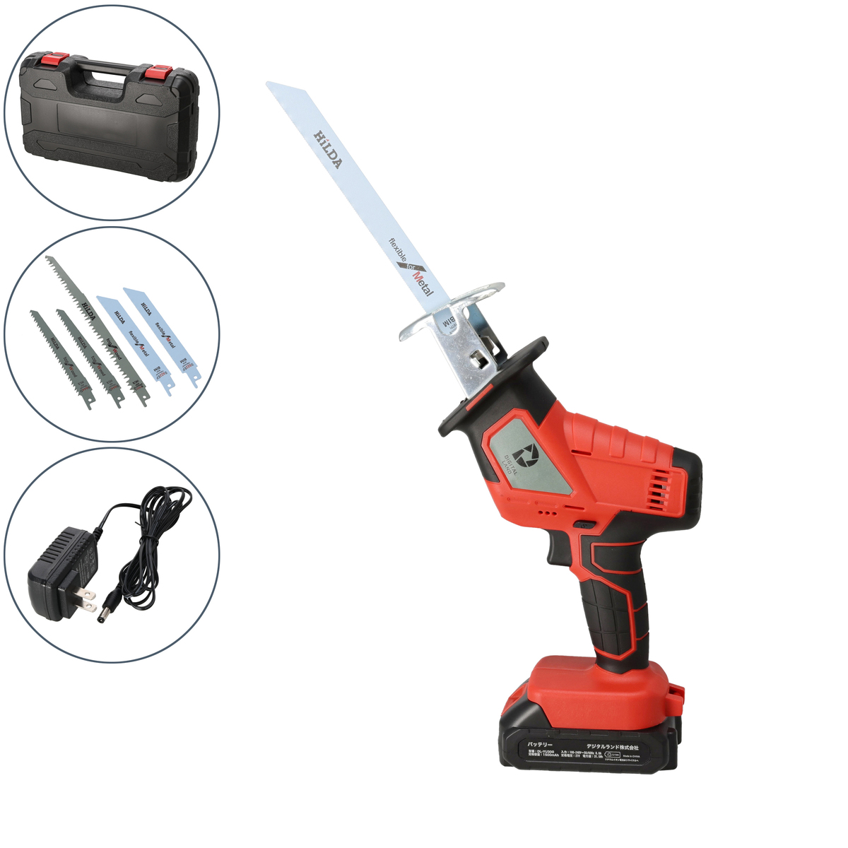 [商品内容] ・本体 ・バッテリー ・アダプター ・専用ケース ・木工用ブレード ・金属・プラ用ブレード ・替え刃4枚組 ※組み立て式 [サイズ] 7×19×28cm [サイズ詳細(約)] 木工用ブレード:15cm 金属・プラ用ブレード:15cm <替え刃4枚組> 金属用1:22cm 金属用2:15cm 木工用1:24cm 木工用2:15cm [重量] 約1.1Kg [充電時間] 約3.5時間充電で約20分使用可能 [安全装置] 過充電保護 過放電保護 過電流保護 温度保護 [仕様詳細] ACアダプター電源 100V〜240V バッテリー容量 1500mAh バッテリー入力電圧 21V/0.75A バッテリー重量 (約)324g 定格電圧 21V 定格容量 1500mAh(リチウムイオン電池) ■組み立て式 所要時間:約10分 ■取り扱い説明を充分にご確認の上、ご使用下さい 【中国製】 [注意事項] ※バッテリー水濡れ厳禁バッテリーやアダプターが濡れた状態で使用や充電をしないでください。発熱、破裂、発火、火災、感電の原因になります。万が一、充電中に濡れてしまった場合は、速やかにアダプターをコンセントから抜いてください ※バッテリーの充電が完了し、ランプが緑色に点灯したらアダプターから外して保管してください ※電子機器や暖房器具の近く、高温多湿の場所での充電はしないでください ※異常時や故障時は、直ちに使用や充電を中止してください ・充電時にアダプターのランプが満充電時の緑点灯、充電中の赤点灯以外の点滅や消灯などが確認された場合 ・使用時や充電時にバッテリーやアダプターが触れない程の高温になった場合 ※商品仕様の表示入力電圧を超える充電はおやめください。発熱、発火、発煙、故障の原因になります ※本来の目的以外でのご使用、改造はしないで下さい ※本製品を使用して起こる事故や怪我は一切責任を負いかねます ※刃物の取り扱いには十分に注意してください ※刃を直接触らないでください ※使用時は服やアクセサリーが巻き込まれる可能性がありますのでご注意下さい ※落としたり強い衝撃を与えないでください ※本製品に熱や異音、異臭などの以上が認められた場合は直ちに使用を中止してください ※対象の厚さ、固さにより切れ味が変化します。固いものや、厚みのあるものを無理に切らないでください ※本製品をご利用において生じる物品の破損は、補償の対象外となります ※小さなお子様の手に届くところで保管、使用しないでください ※工具は雨ざらしにしたり、湿った、または濡れた場所で使用しないでください ※粉じんの多い作業では防じんマスクを着用してください ※本製品を使用して発生した傷害又は物的損害に対して当社は一切の責任を負いません