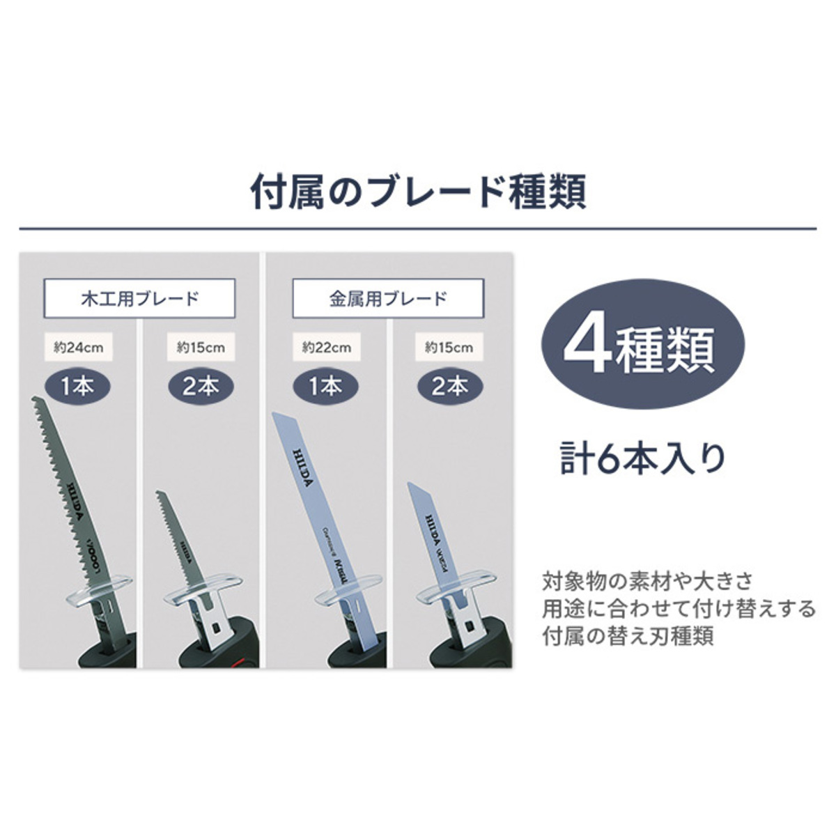 木工用、金属・プラ用それぞれ、長さの異なる替え刃が2枚ずつ付属。合計6枚のブレードで太さや厚みの異なる材料にも対応します。ブレードは工具無しで簡単に交換できます(*2)