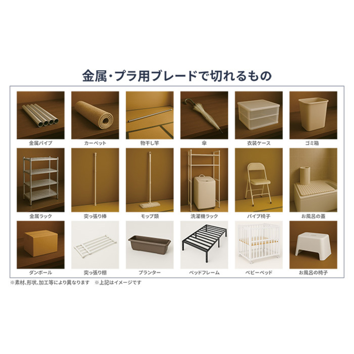 ブレードを交換することで、様々な物をラクに切断可能。木材には木工用ブレード、金属やプラスチックには金属・プラ用ブレードをお使いください