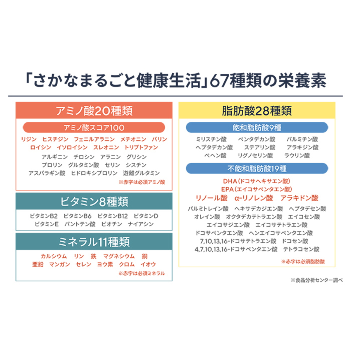 1包(1.5g)あたりにカルシウム約22.2mg、EPA(エイコサペンタエン酸) 約4.65mg、DHA(ドコサヘキサエン酸) 約8.4mgを含み、8種のビタミン(*2)と11種のミネラル(*3)、さらに28種の脂肪酸(*4)と20種のアミノ酸(*5)を摂取できます。アミノ酸スコアは100。たんぱく質(中性)に関わる酵素の活性も20単位/g維持しています(*6)