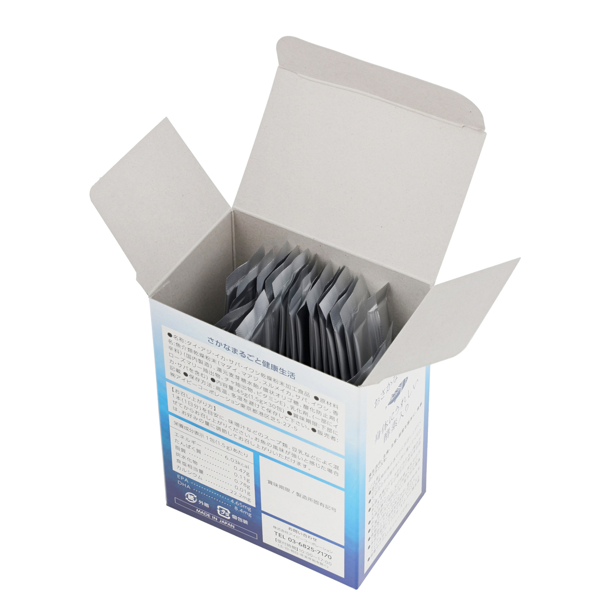 [アレルギー物質特定原材料8品目] なし [内容量] 1.5g×30包 [目安量] 1日1本 [お召し上がり方] 1本(1日分)を目安に、味噌汁などのスープ類、豆乳などによく混ぜてからお召し上がりください。お魚の風味が強いと感じた場合は、お好みの量に調節してお召し上がりいただけます [保存方法] 高温、多湿を避けて保存して下さい [栄養成分表示/1包(1.5g)あたり] エネルギー:6.03kcal たんぱく質:0.47g 脂質:0.11g 炭水化物:0.78g 食塩相当量:0.01g カルシウム:22.2mg EPA:4.65mg DHA:8.4mg [注意事項] ※疾病治療中の方、及び妊娠・授乳中の方は、 医師にご相談の上ご利用ください ※個包装開封後は速やかにお召し上がりください ※乳幼児の手の届かない所に置いてください ※体調・体質により、まれに合わない場合がありますので、その場合はご使用をお控えください ※疾病治療中の方、及び妊娠・授乳中の方は、 医師にご相談の上ご利用ください ※水濡れや汚れのつかない衛生的な環境でお取り扱いください ※食物アレルギーのある方は、原材料名をご確認の上ご使用をお決めください ※本品で使用しているマダイ、マアジ、スルメイカ、サバ、イワシは、えび・かに類を食べています [原料原産地] 魚介類乾燥粉末(マダイ、マアジ、スルメイカ、サバ、イワシ、香辛料)(国内製造) [原産国] 日本 [原材料]魚介類乾燥粉末(マダイ、マアジ、スルメイカ、サバ、イワシ、香辛料)(国内製造)、還元麦芽糖水飴/環状オリゴ糖、酸化防止剤(ローズマリー抽出物、チャ抽出物、ビタミンE)、乳化剤、(一部にイカ・サバを含む)
