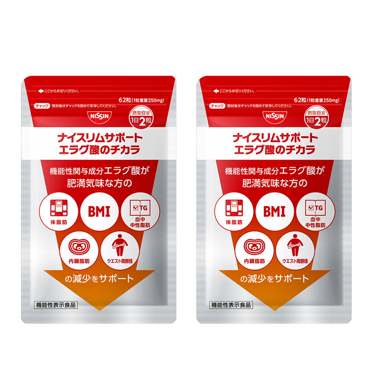 [アレルギー物質特定原材料8品目] なし [内容量]62粒×2袋/計124粒 [賞味期限]出荷時点で賞味期限まで240日以上ある商品をお届けします [目安量]一日2粒 [お召し上がり方] 一日2粒を目安に水などと一緒にかまずにお召し上がりください [栄養成分表示]2粒(0.5g)あたり 熱量1.8kcal/たんぱく質0〜0.02g/脂質0〜0.03g(飽和脂肪酸0〜0.02g)/炭水化物0.46g(糖質0.38g/食物繊維0.08g)/食塩相当量0〜0.002g 機能性関与成分:エラグ酸3mg [保存方法] 直射日光、高温、多湿をさけ、常温で保存してください [届出番号]I960 [届出表示] 本品にはエラグ酸が含まれます。エラグ酸は肥満気味の方の体脂肪、血中中性脂肪、体重、ウエスト周囲径、内臓脂肪の減少をサポートし、高めのBMI値の改善に役立つことが報告されています。 [注意事項] ※本品は、疾病の診断、治療、予防を目的としたものではありません ※疾病に罹患している場合は医師に、医薬品を服用している場合は医師、薬剤師に相談してください ※本品は、疾病に罹患している者、未成年者、妊産婦(妊娠を計画している者を含む)及び授乳婦を対象に開発された食品ではありません ※本品は、事業者の責任において特定の保健の目的が期待できる旨を表示するものとして、消費者庁長官に届出されたものです。ただし、特定保健用食品と異なり、消費者庁長官による個別審査を受けたものではありません ※食生活は、主食、主菜、副菜を基本に、食事のバランスを ※体調に異変を感じた際は、速やかに摂取を中止し、医師に相談してください ※一日摂取目安量をお守りください ※乳幼児の手の届かないところに保管してください ※開封後はお早めにお召し上がりください ※食べ過ぎると一時的におなかがゆるくなることがあります ※表面に黒い粒が見られますが、成分由来のものであり品質には問題ありません ■機能性表示食品 ※機能性関与成分:エラグ酸3mg [原料原産地] アフリカマンゴノキエキス(アメリカ製造) [原産国]日本 [原材料] アフリカマンゴノキエキス(アメリカ製造)、還元麦芽糖水飴、乳酸菌乾燥粉末(殺菌)/結晶セルロース、ステアリン酸Ca、二酸化ケイ素