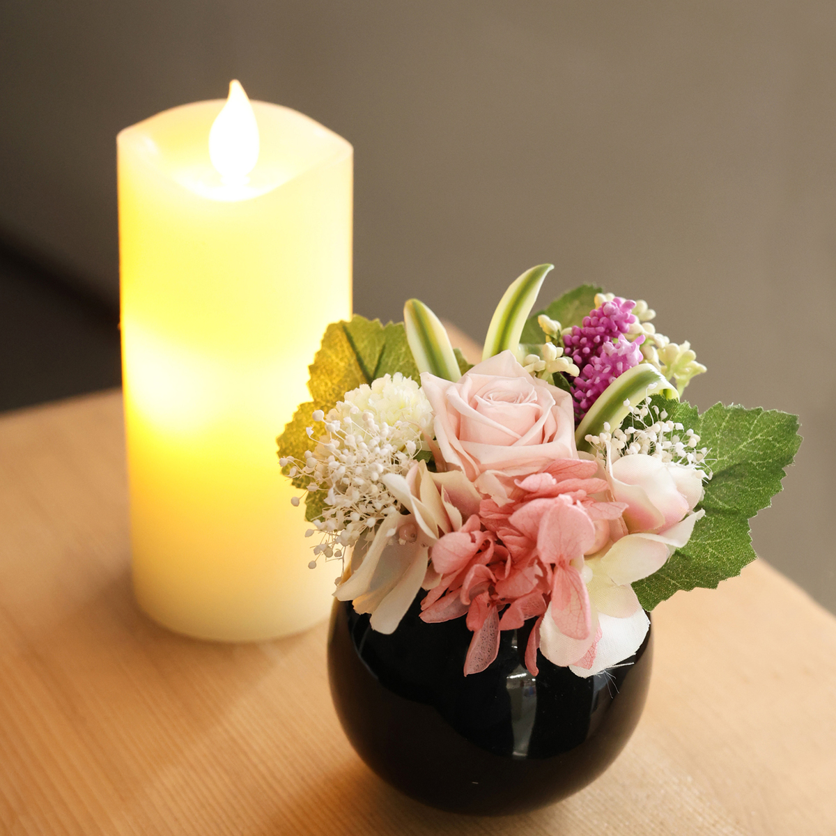 プリザーブドフラワーと造花を組合せたミニサイズの現代仏壇用仏花。本物のロウを使用し、自然な炎の揺らぎを再現したLEDローソクとセットにしました
