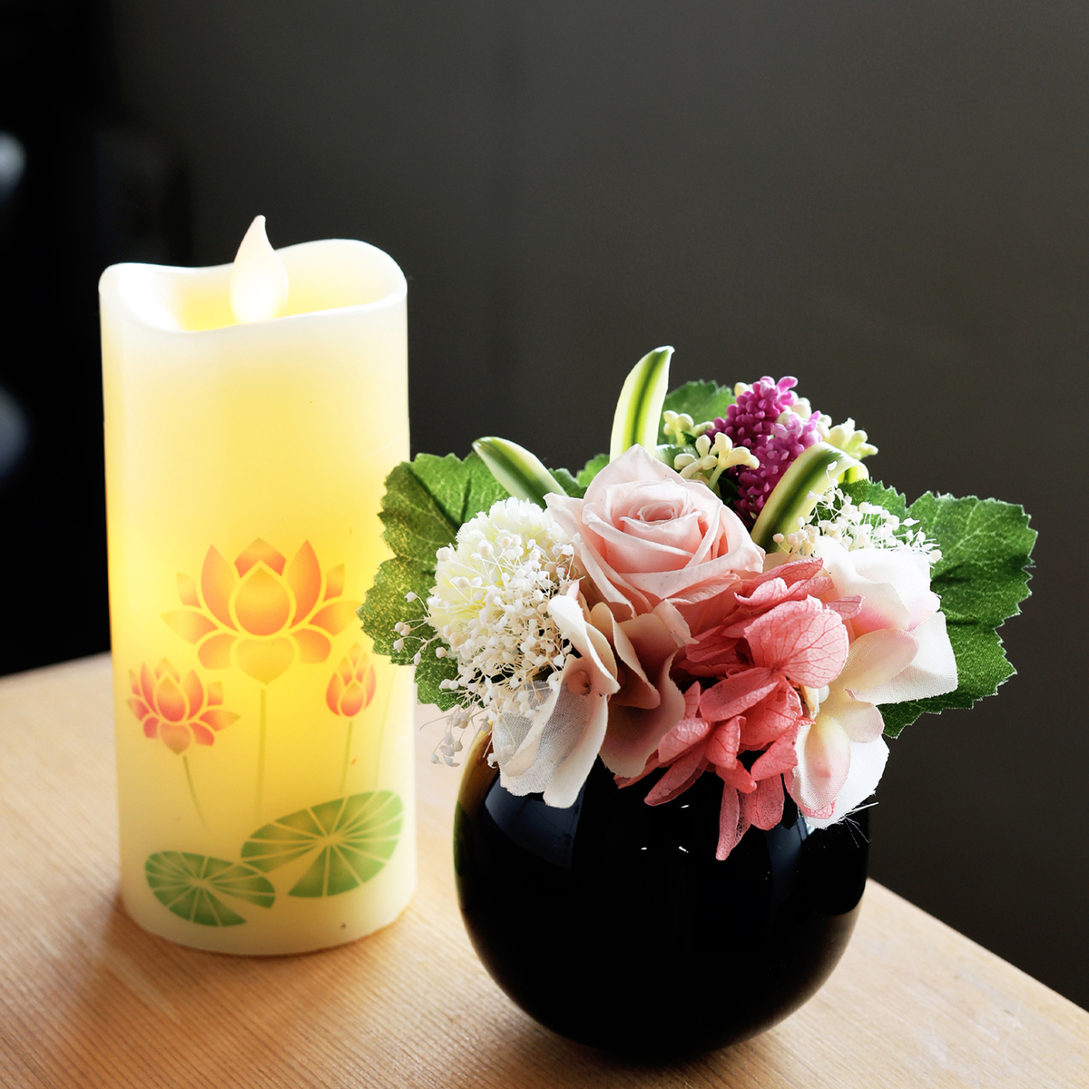 プリザーブドフラワーと造花を組み合わせたミニサイズの仏花と、蓮模様が美しいLEDローソクのセットです
