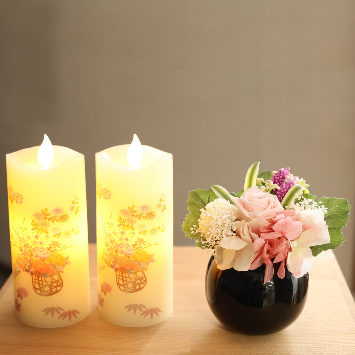 本物のロウを使用したリアルな質感と、自然な炎の揺らぎを再現したLEDローソク。幻想的に絵柄が浮かび辺りをやさしく照らします。プリザーブドフラワーと造花を使用した、ミニサイズの現代仏壇用仏花とセットでお届けします