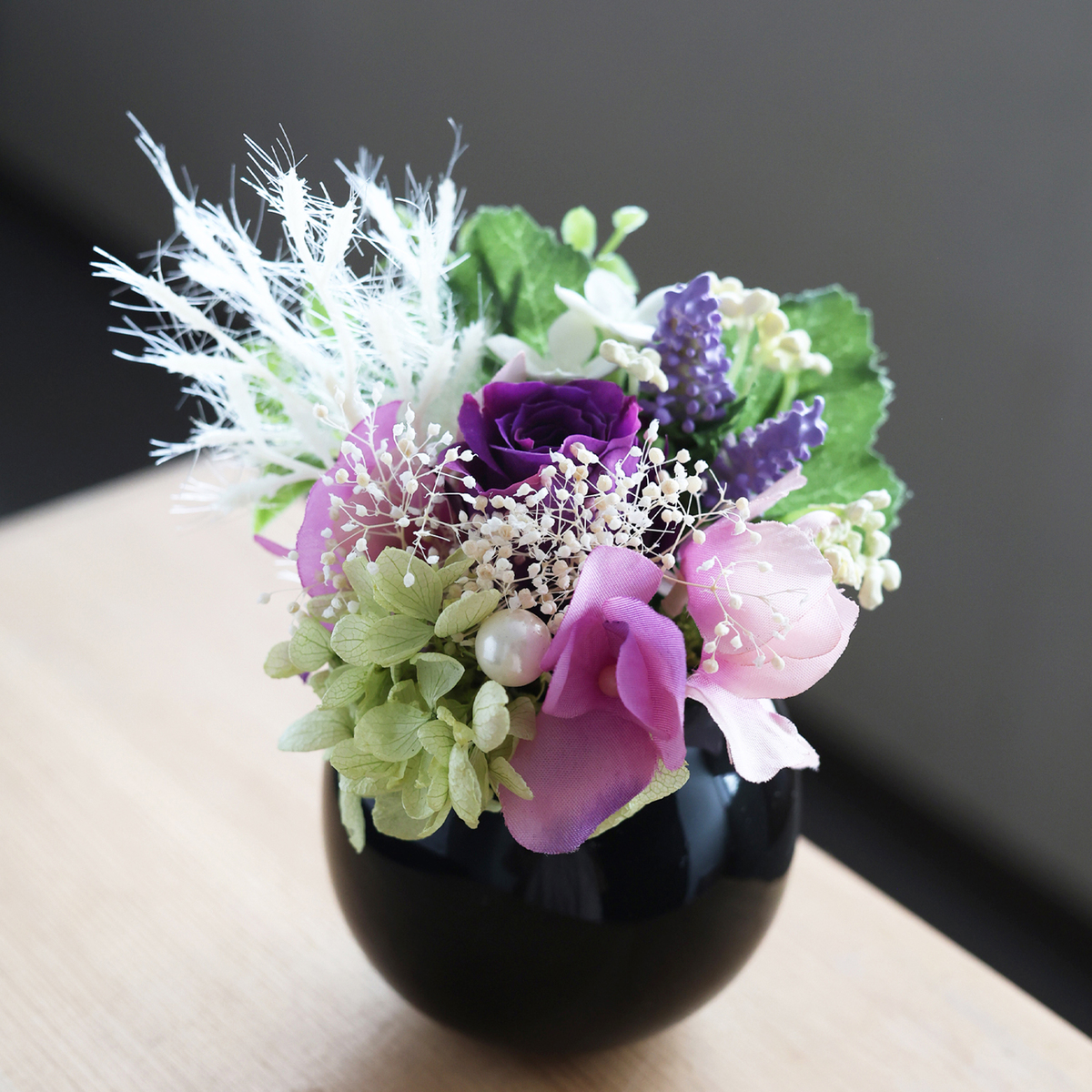 プリザーブドフラワーと造花を組合わせた仏花です。現代仏壇など限られたスペースにも飾りやすいミニサイズ。水を与える必要がなく、手軽にインテリアとして飾ることができます