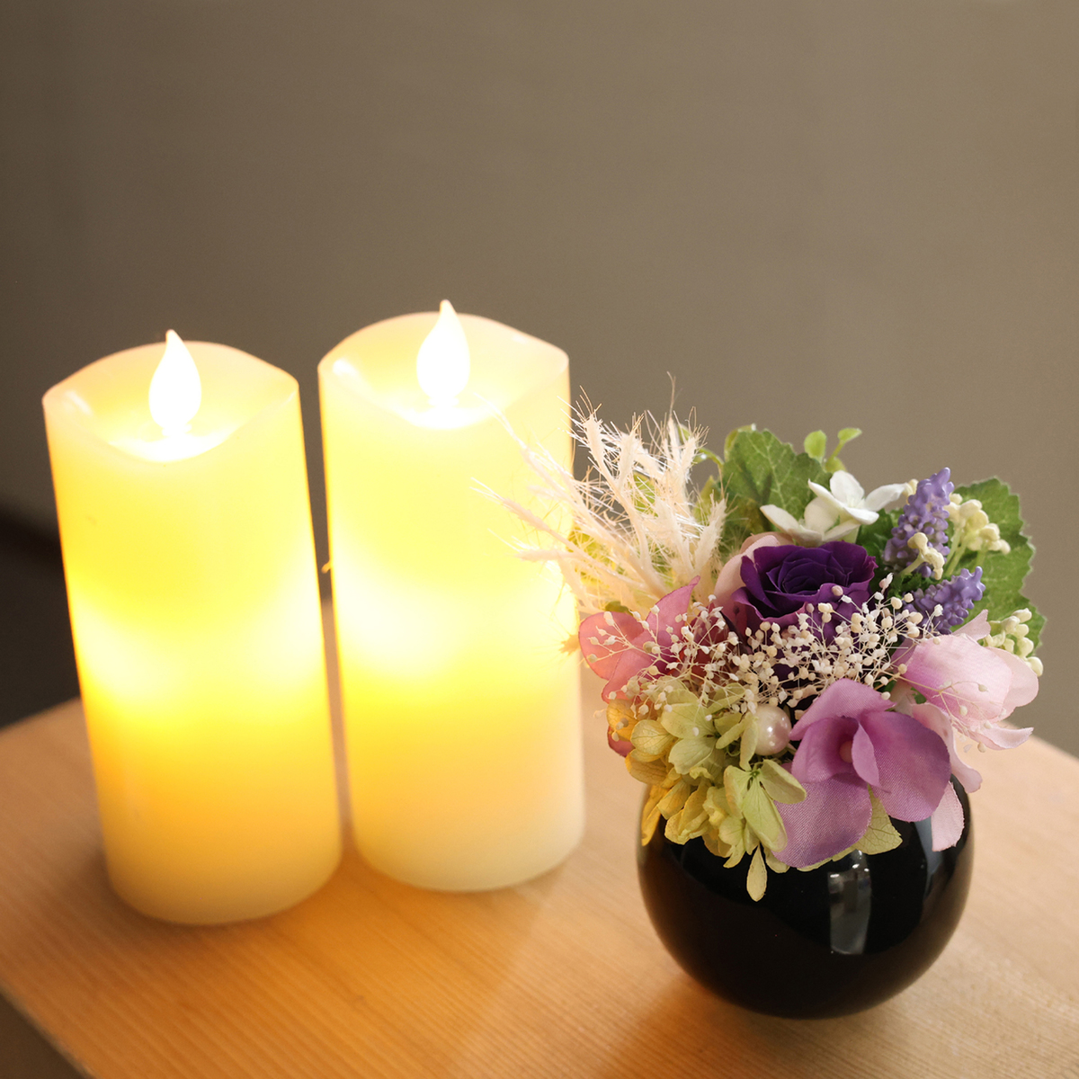 プリザーブドフラワーと造花を組み合わせたミニサイズの仏花に、本物のロウを使い自然な炎の揺らぎを再現したLEDローソクを組み合わせたセットです