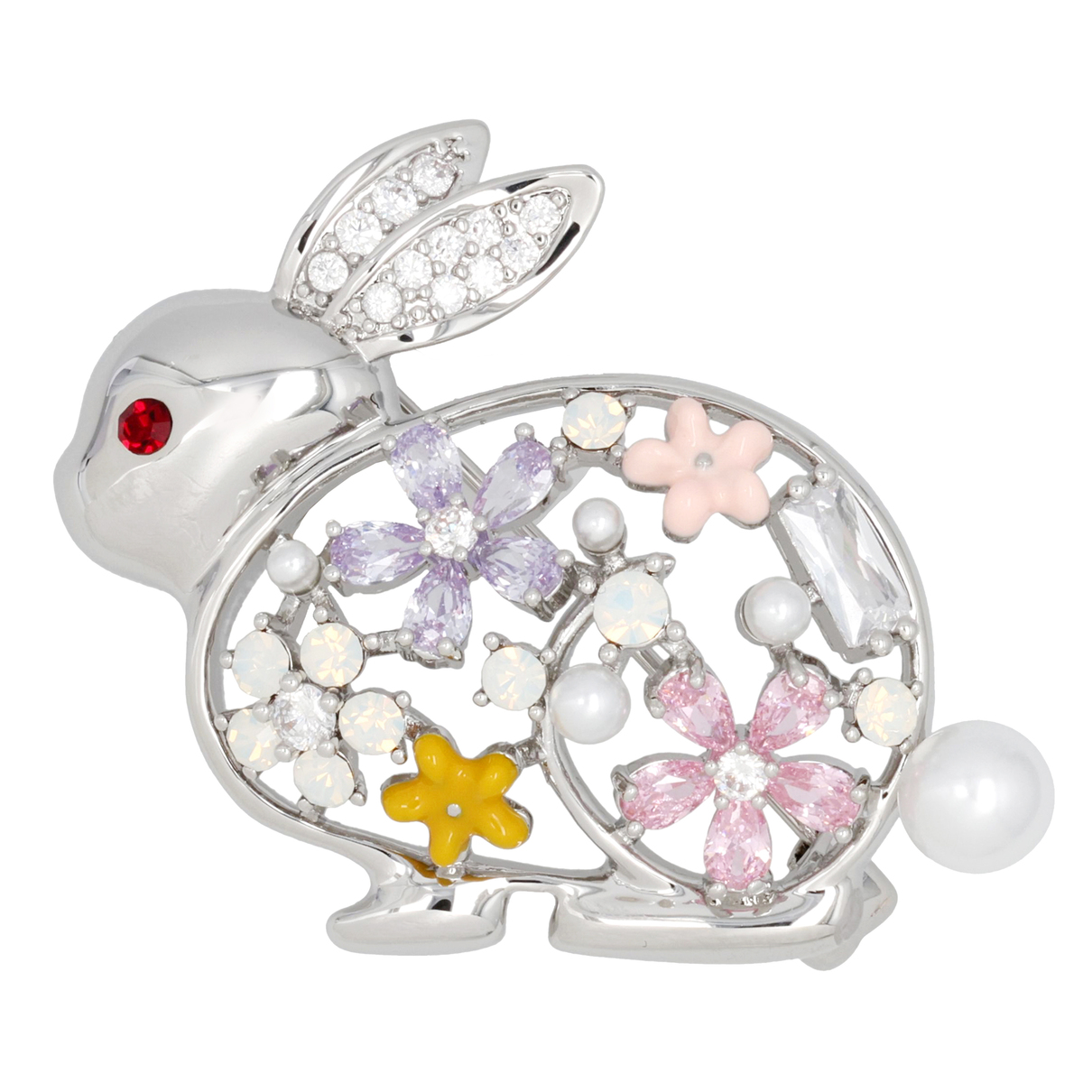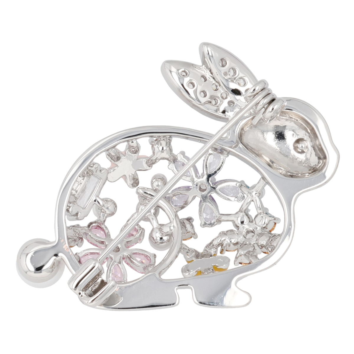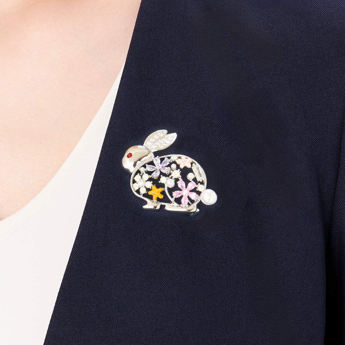お花模様をあしらったラビットブローチ。小振りなサイズながら、お花のきらめきが目を引き、装いにアクセントを添えます