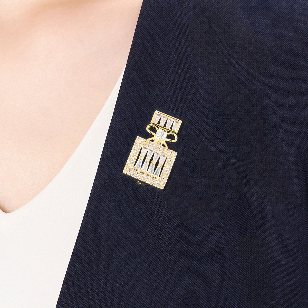 パフュームボトルをモチーフにしたブローチ。身につけるだけで華やかな印象に。芳しい香りが広がってきそうなデザインです