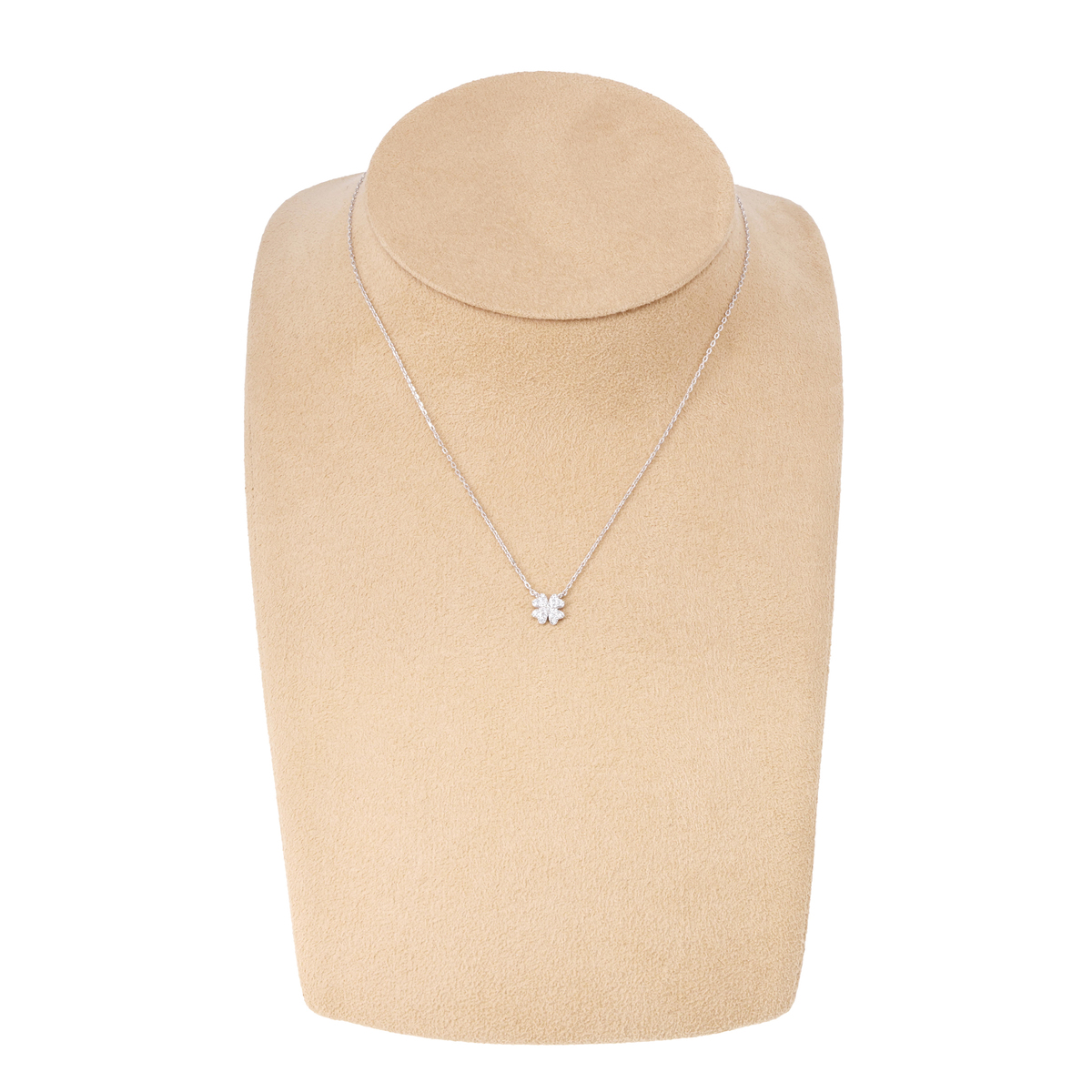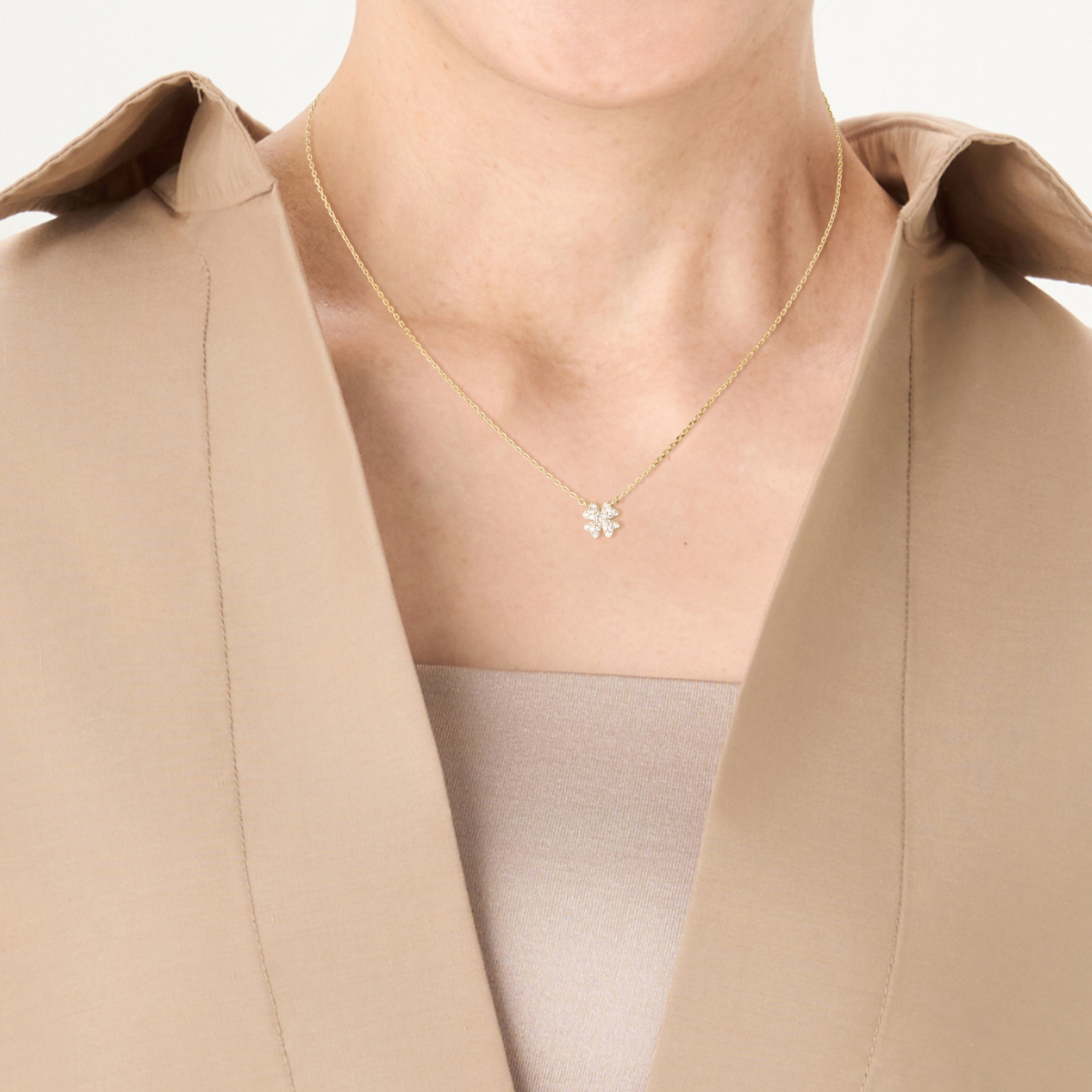 クローバーモチーフが煌めくペンダント。愛と幸運を象徴するクローバーをモチーフにした優美なデザインです。繊細なディテールが胸元に上品な輝きを添え、装いにロマンチックな雰囲気をプラスします