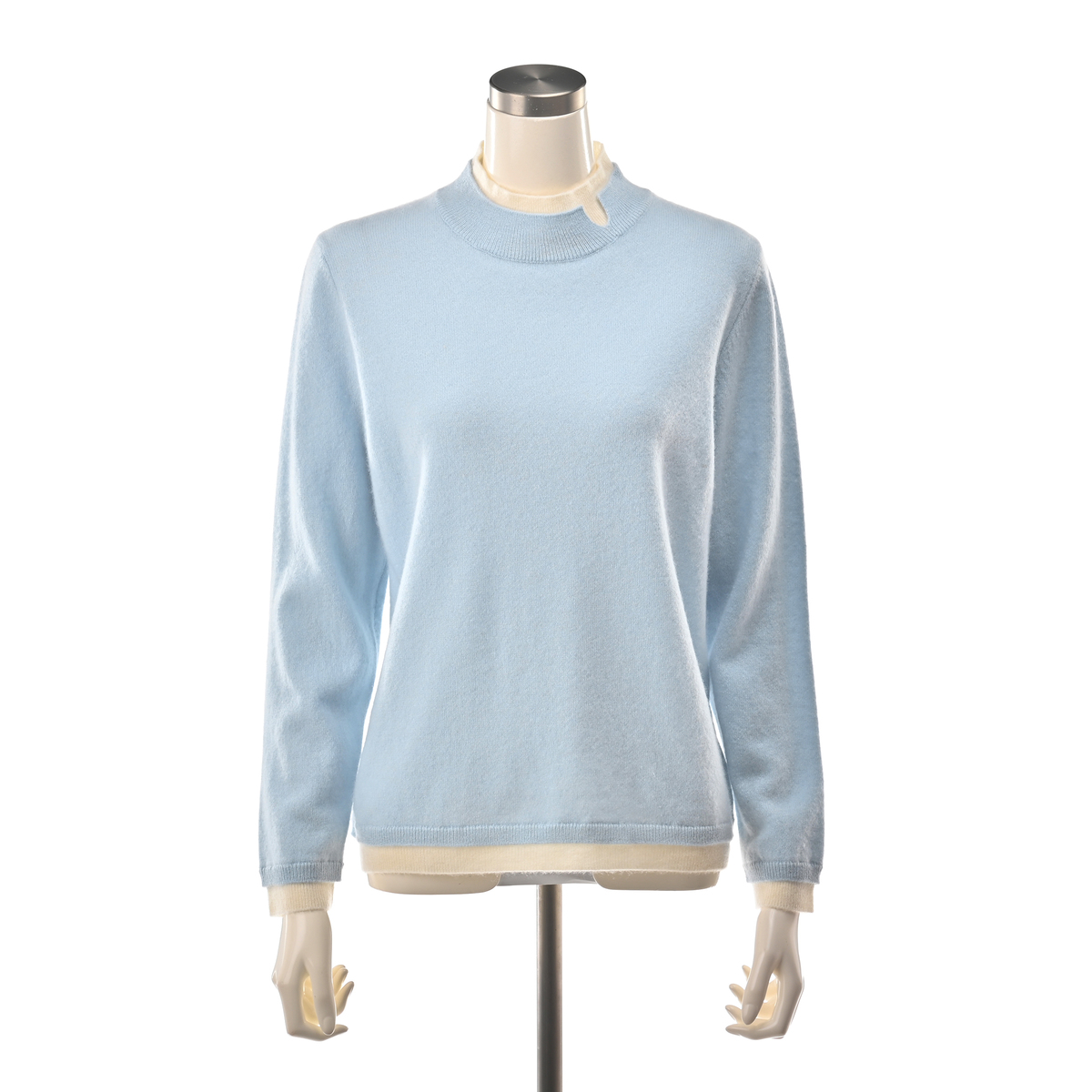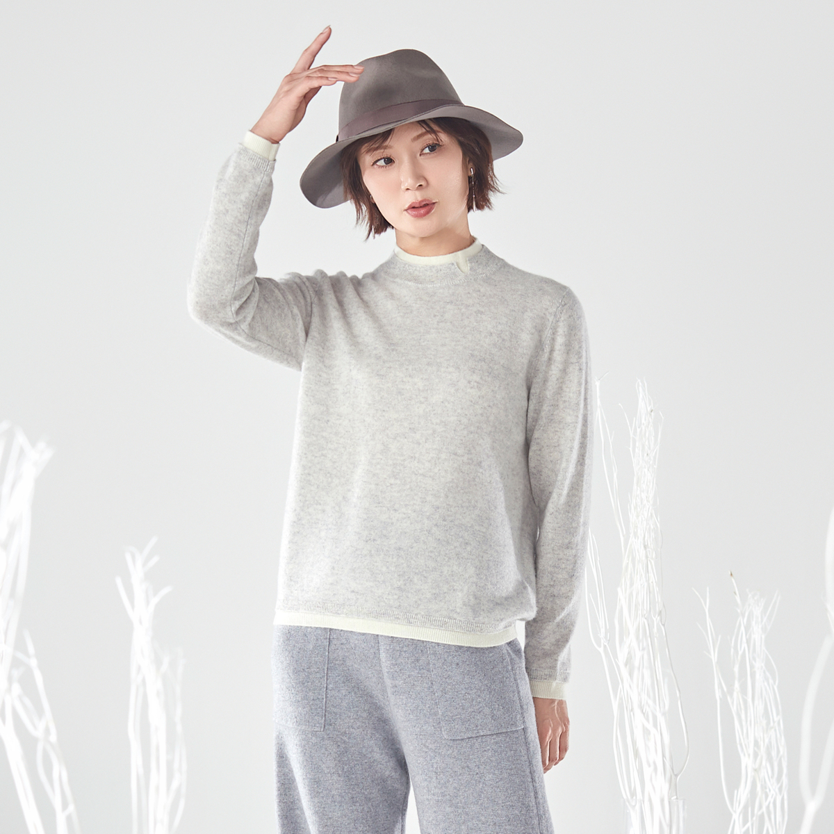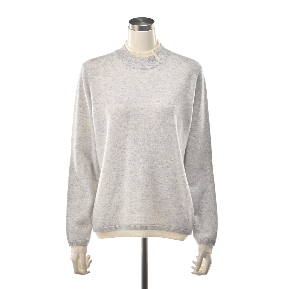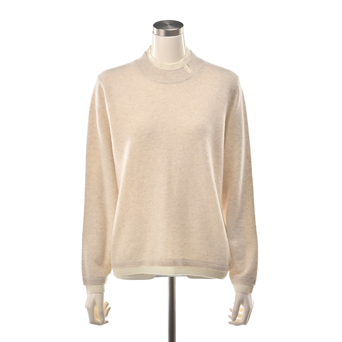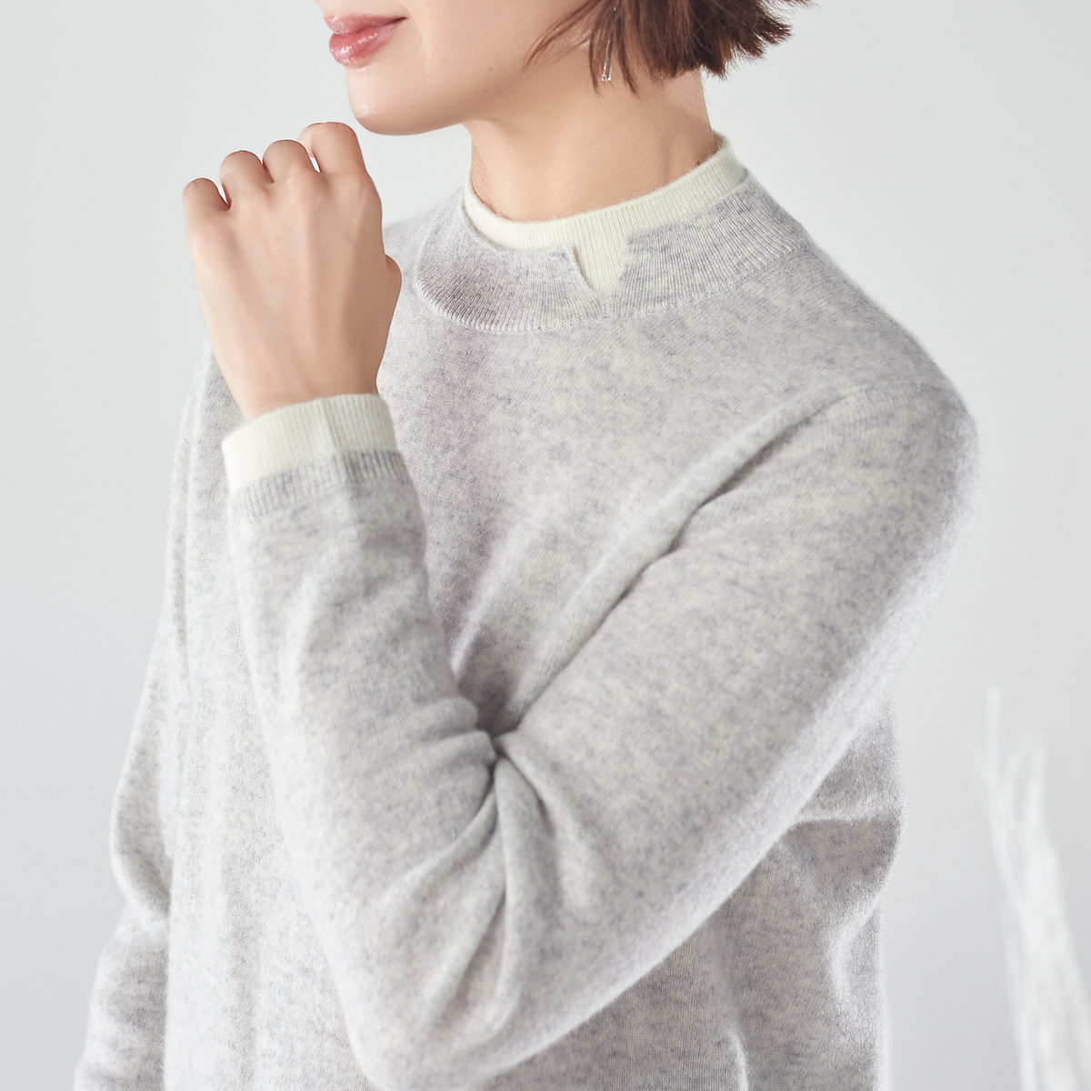 内モンゴル産ホワイトカシミヤを使用した贅沢なプルオーバーです。発色の良さも特長の、ホワイトカシミヤならではの色合いに。シンプルなレイヤード風デザインに、減らし目でシルエットを入れています