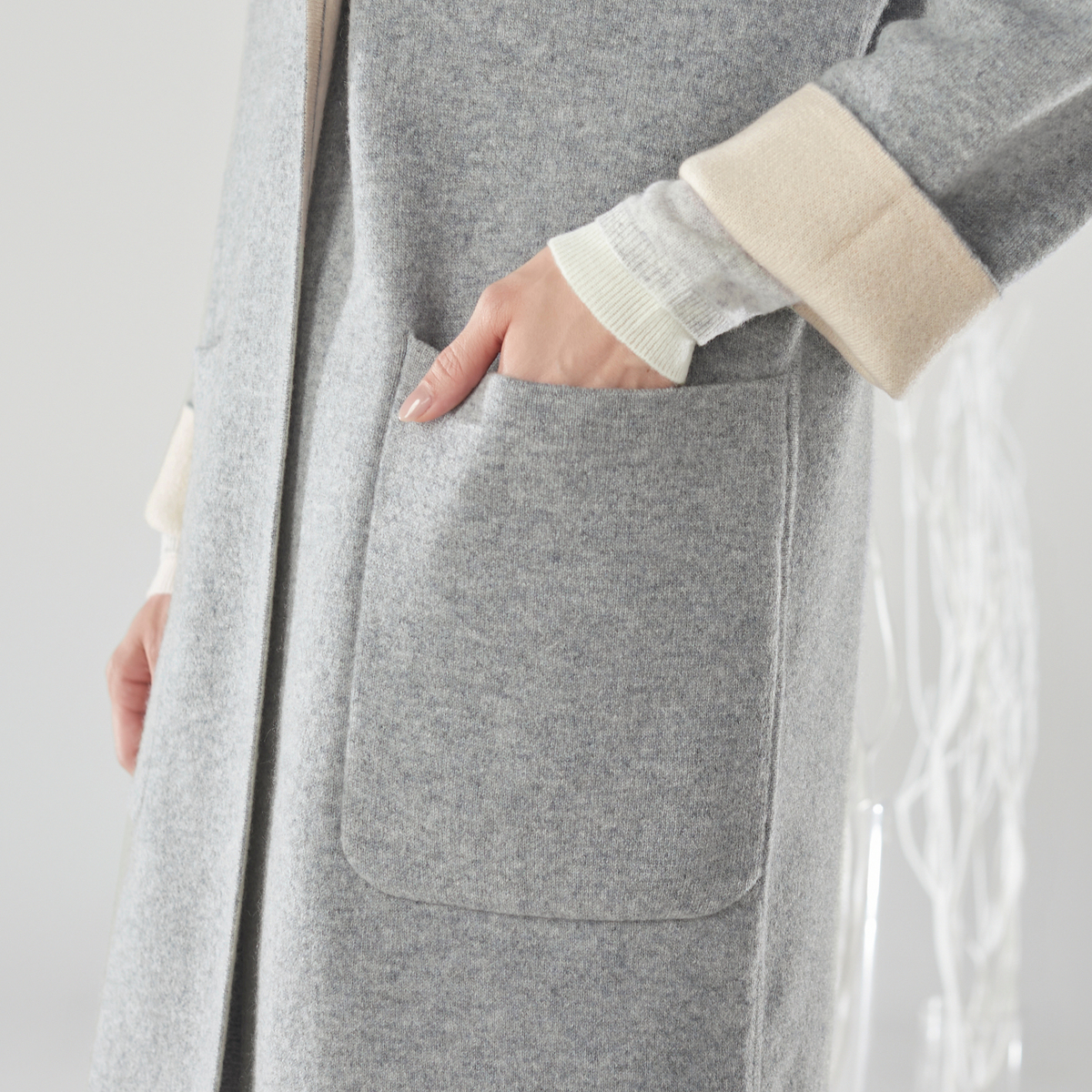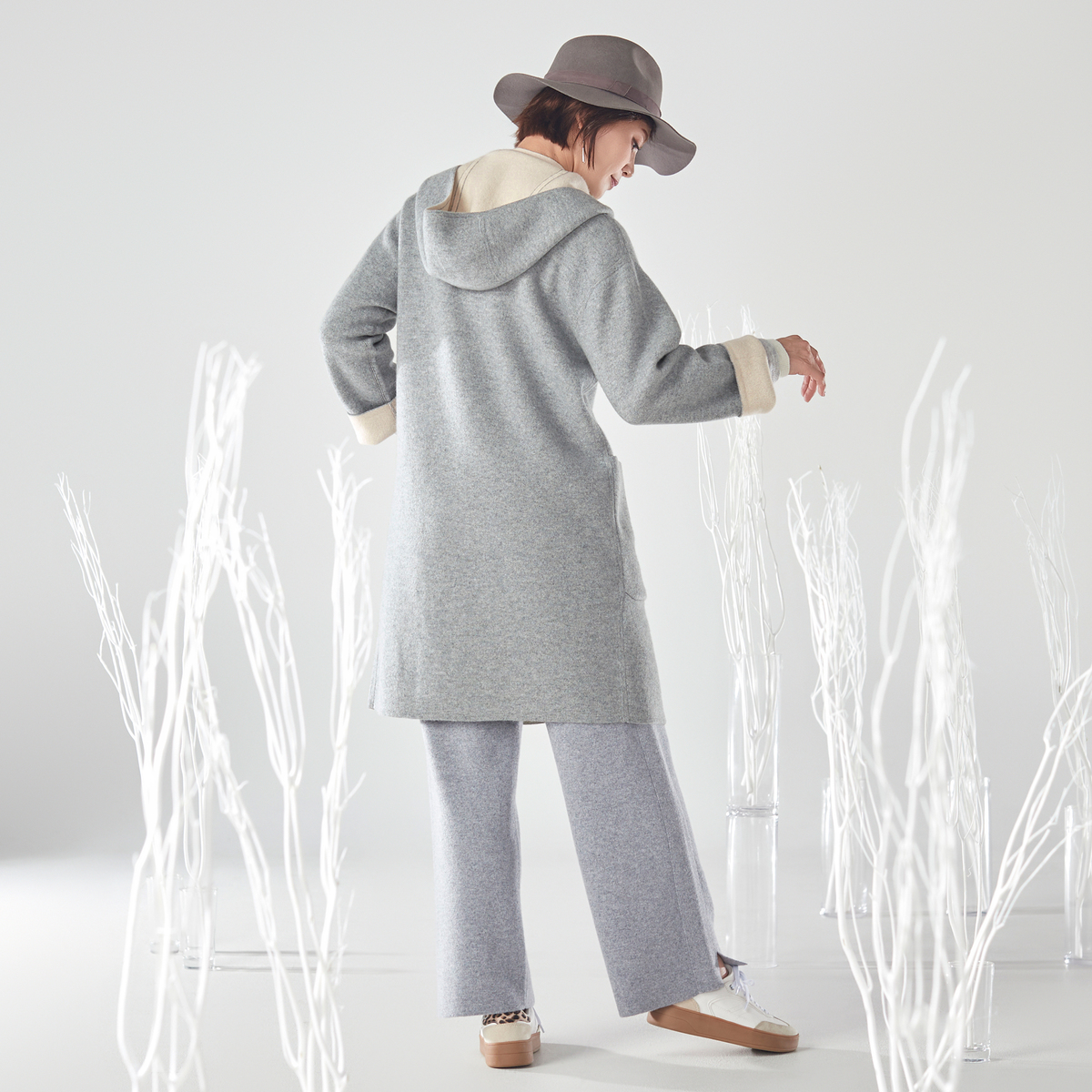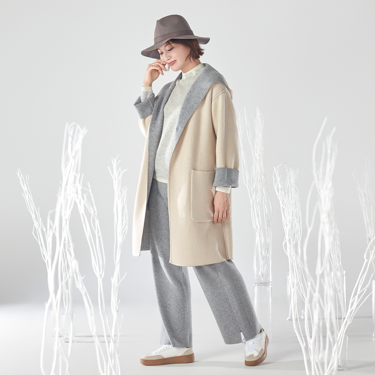 内モンゴル産ホワイトカシミヤを使用したリバーシブルコートです。ホワイトカシミヤは発色が良く、柔らかな手触りが、毎日の装いを格上げ。グラデーション配色や大きめポケットなど細部までこだわり、オーバーサイズのシルエットが、抜け感と落ち感を生みます
