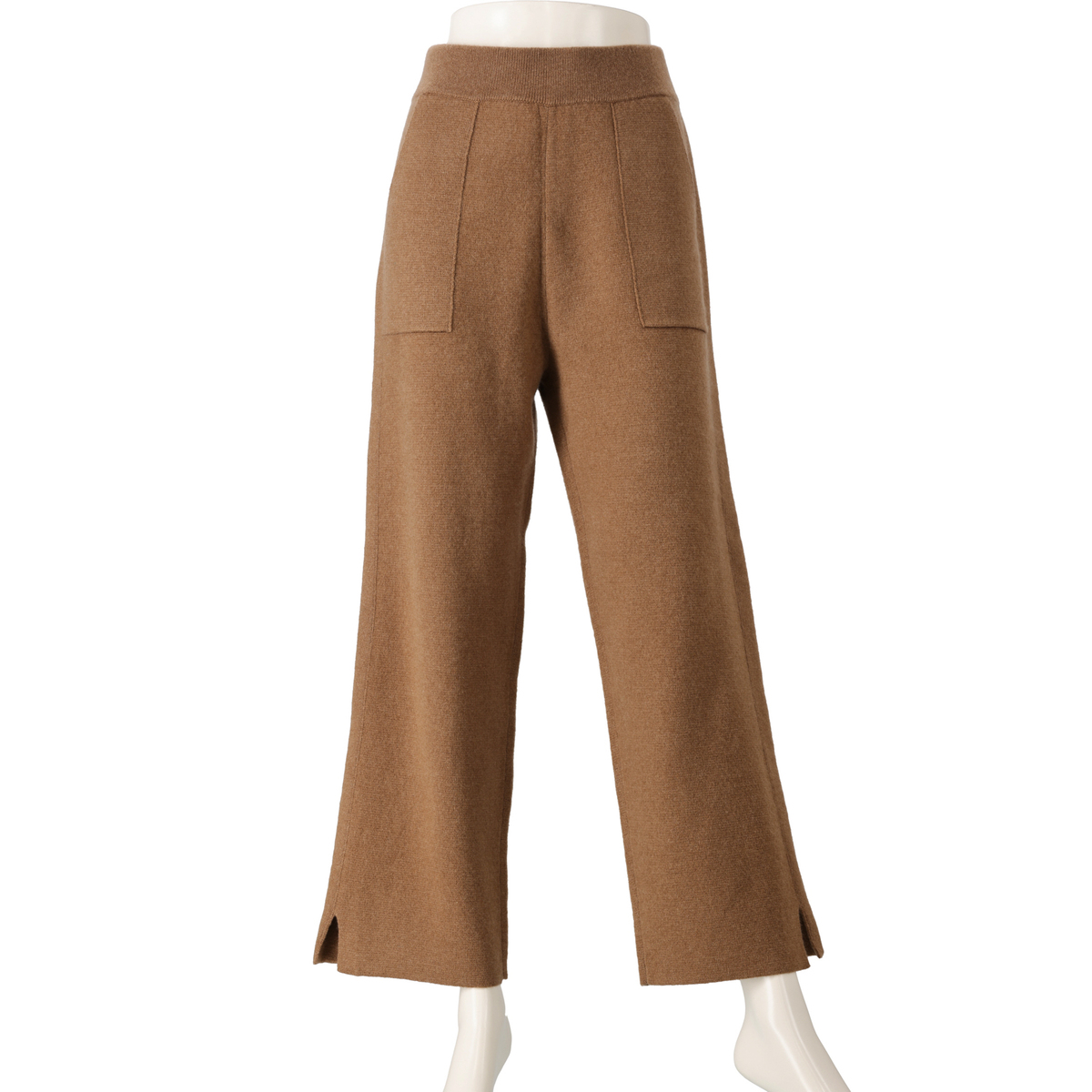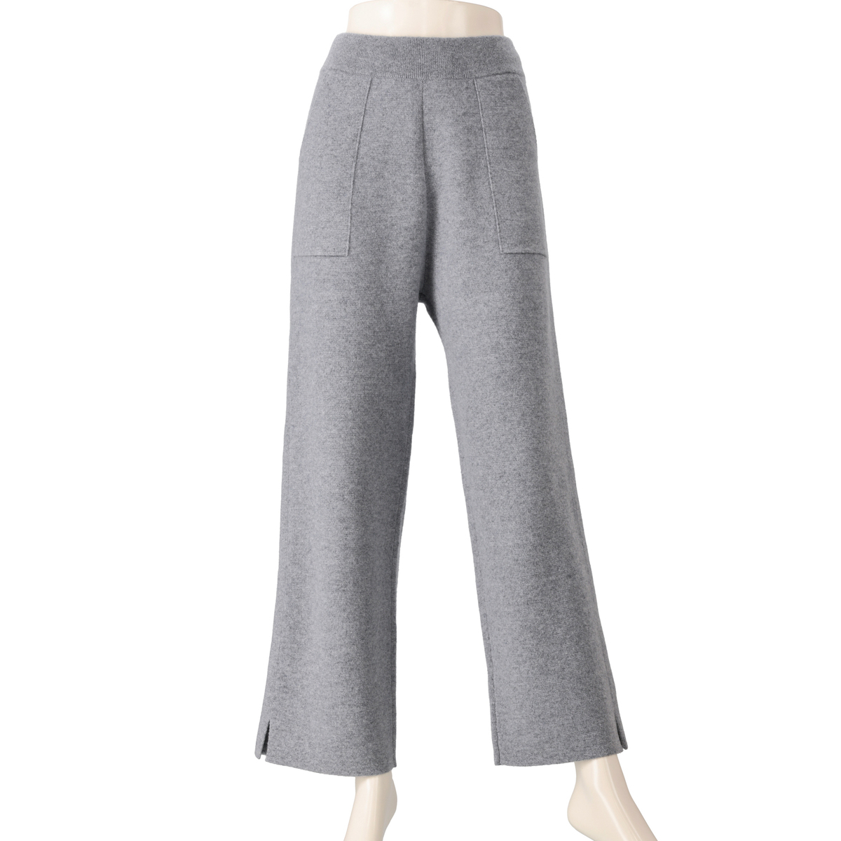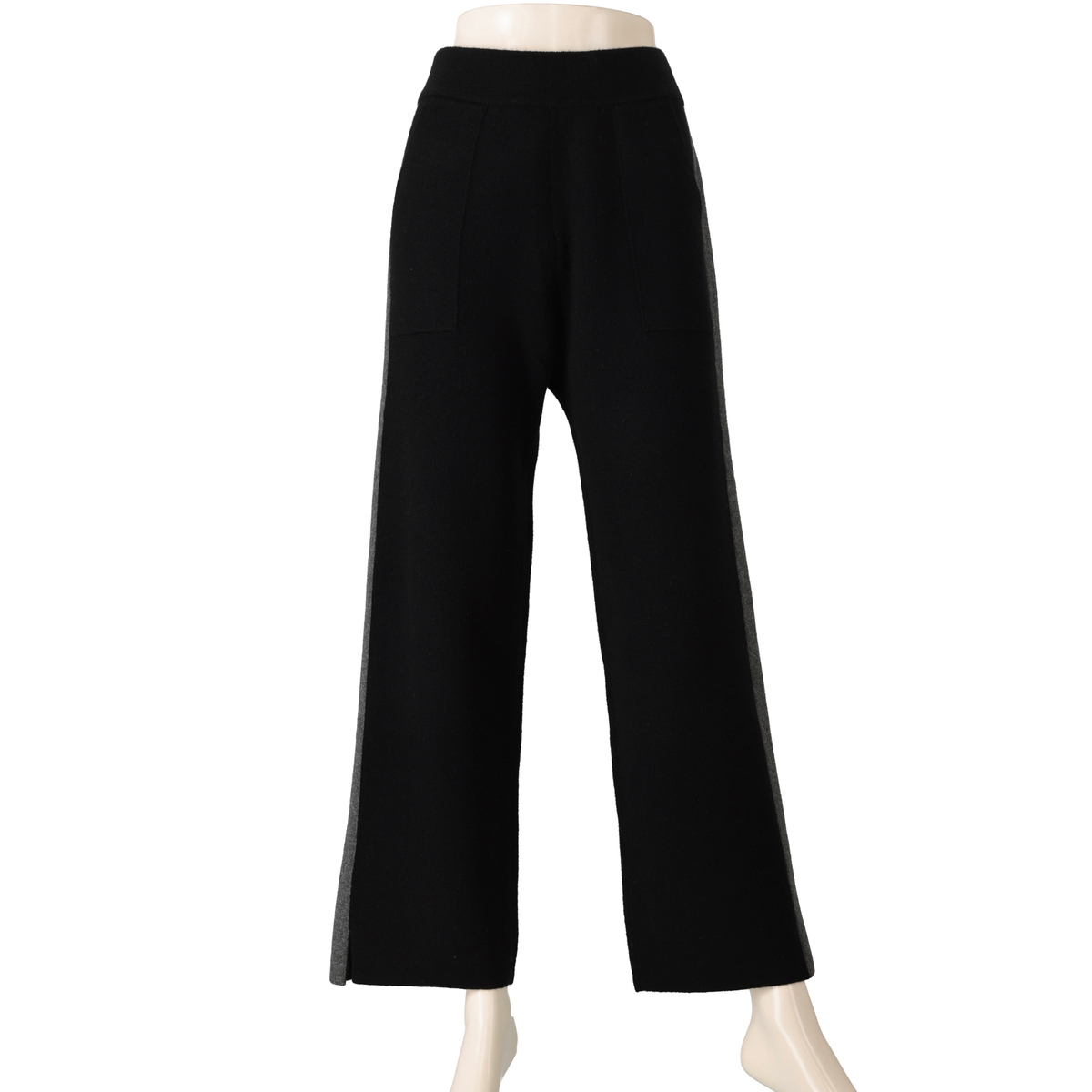 内モンゴル産ホワイトカシミヤを贅沢に使ったパンツです。サイドには脚長に見える総針ラインを施し、ブラックは配色、他は同色ラインに。ミラノリブ編みで膝ができにくく、後ろの飾りポケットでヒップアップ効果も期待できます