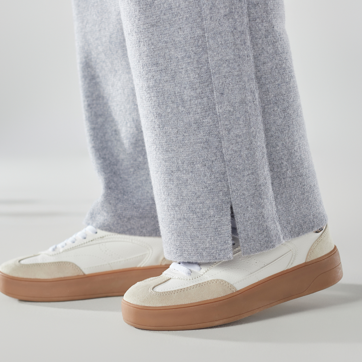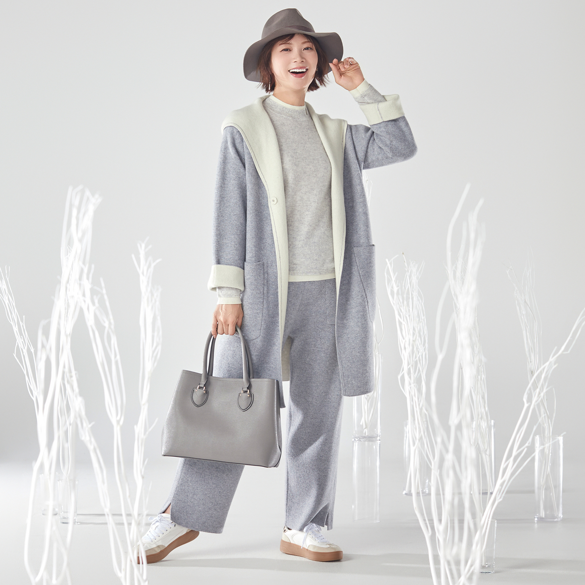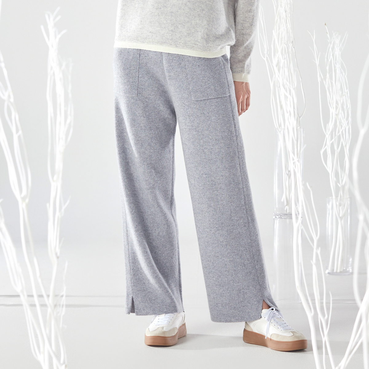 内モンゴル産ホワイトカシミヤを贅沢に使ったパンツです。サイドには脚長に見える総針ラインを施し、ブラックは配色、他は同色ラインに。ミラノリブ編みで膝ができにくく、後ろの飾りポケットでヒップアップ効果も期待できます