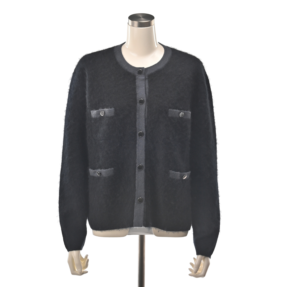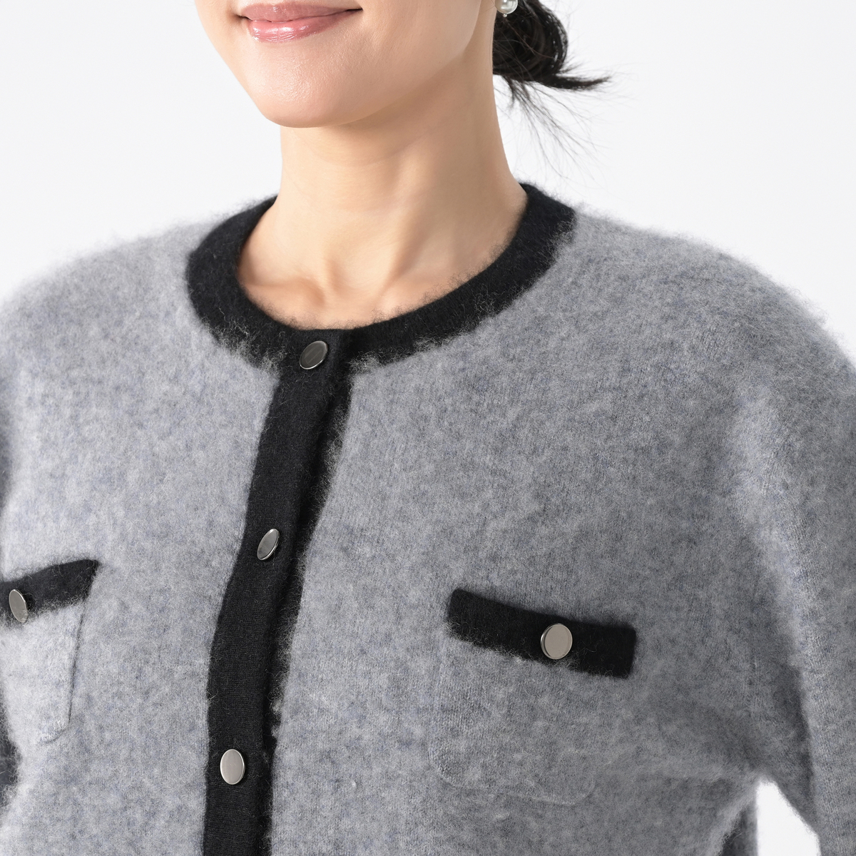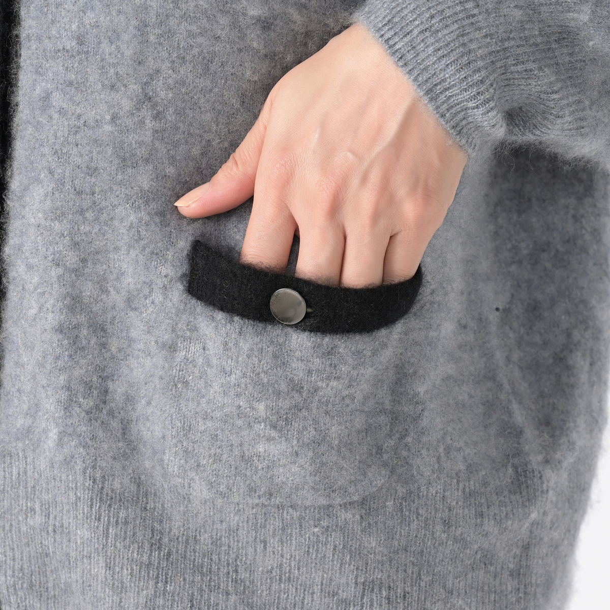 ラグジュアリーな素材感を引き立てるデザイン性を重視。無地ではなくバイカラー仕立てで洗練された印象に。両胸と前裾にポケットを備え、機能性も兼ね備えています