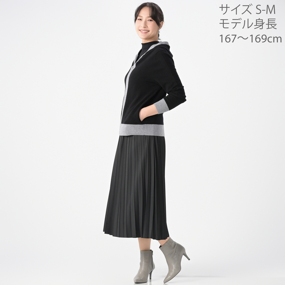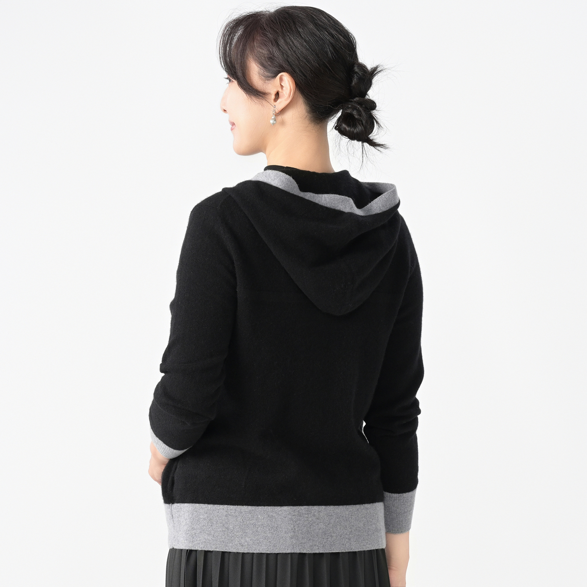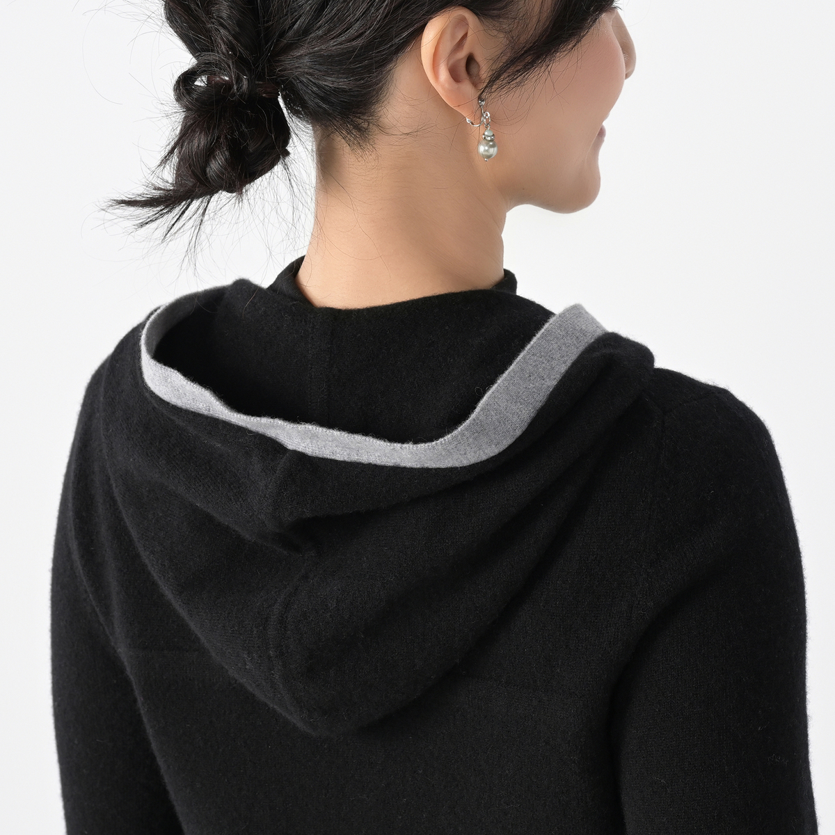 配色の総針ラインをポイントに、両サイドのカシミヤ100%ポケットや後ろ身頃のヨーク、縫い代を見せないWリンキングによる美しいフード仕立てを備えています。さらに縮絨仕上げで柔らかさとヌメリ感を引き出し、スポーティーさとエレガントさを兼ね備えたデザインです