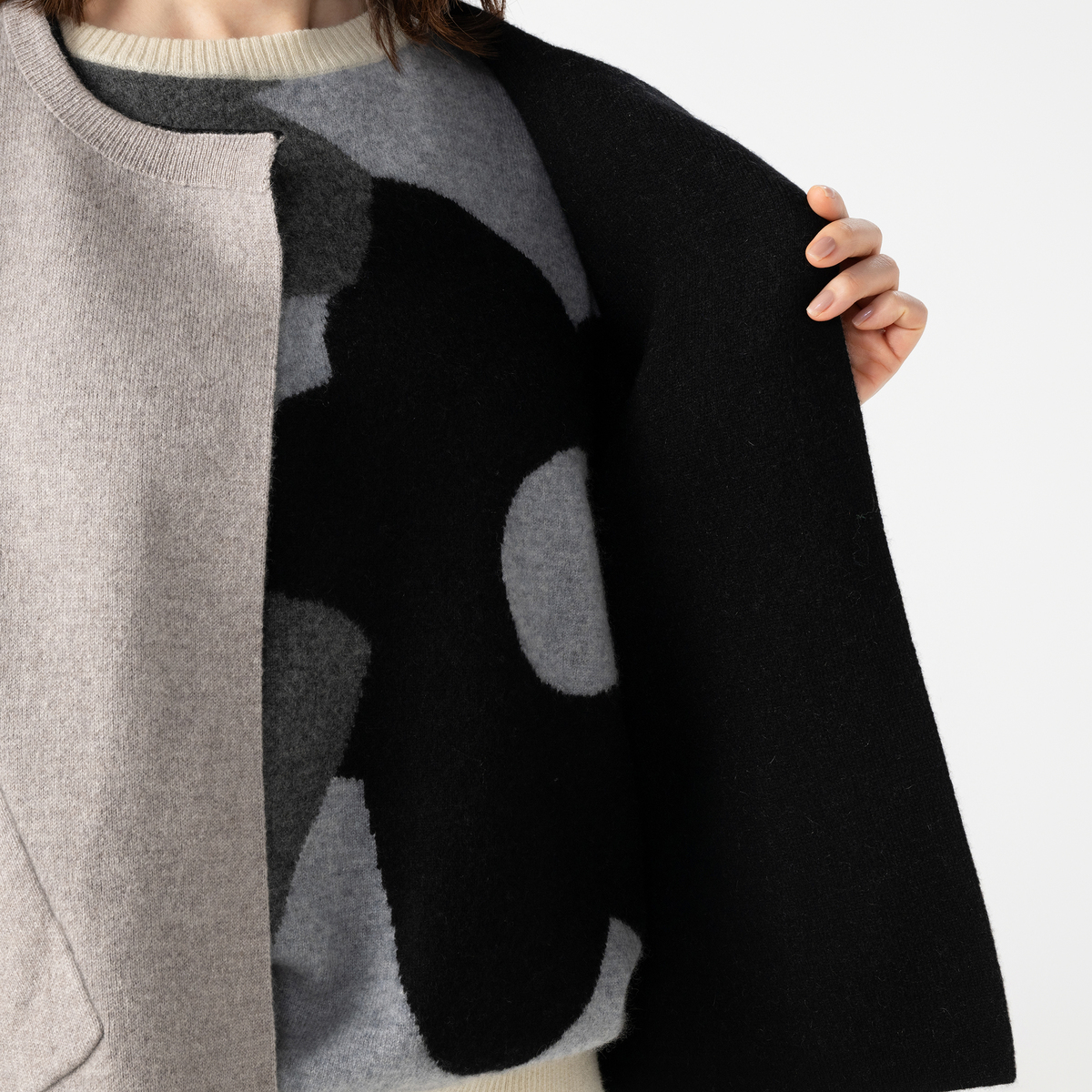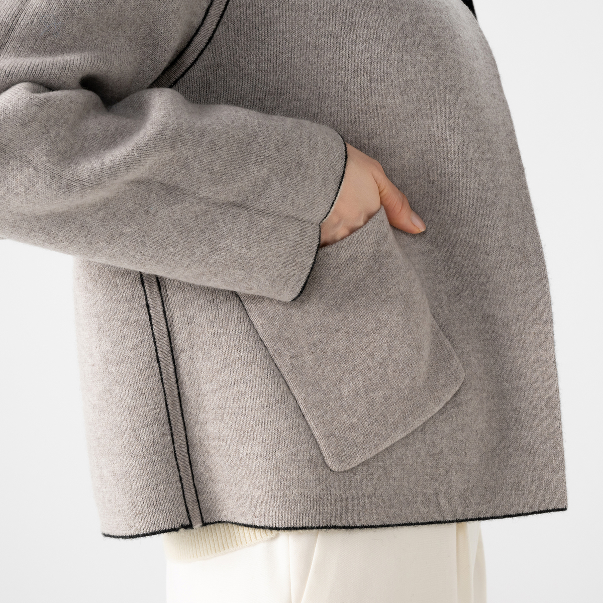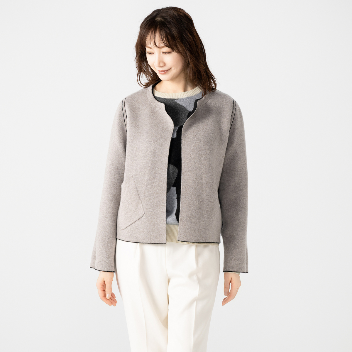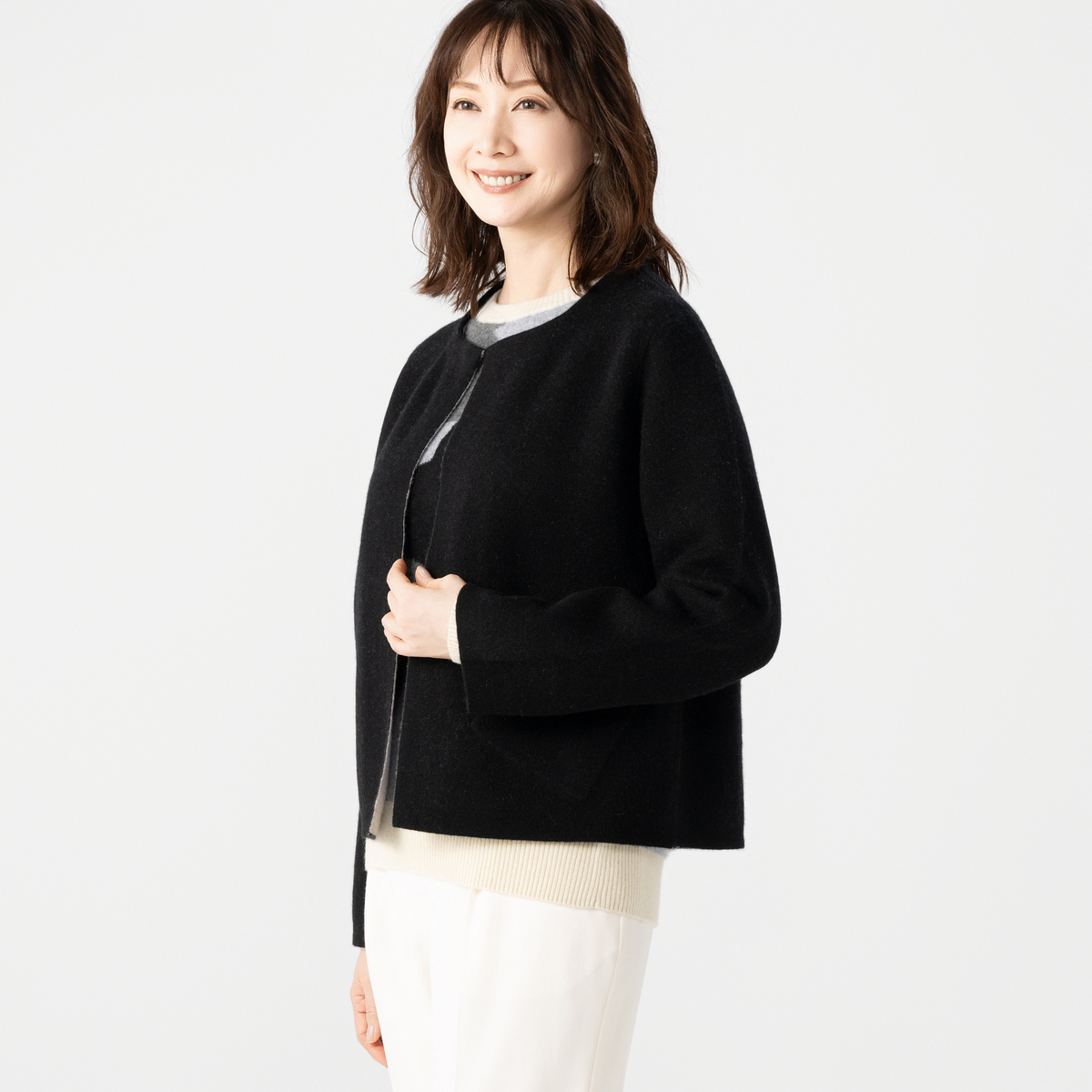 リバーシブルで楽しめる、カシミヤ素材を使用したジャケット。世界でも有数の産地として知られる内モンゴル産ホワイトカシミヤを使用しました。1枚あたり約4〜5頭分(目安)のカシミヤを贅沢に使用しています