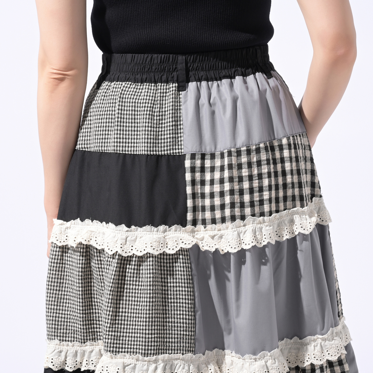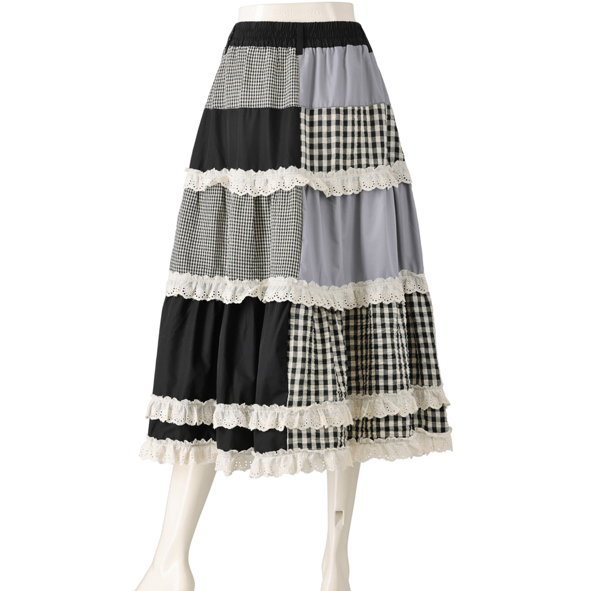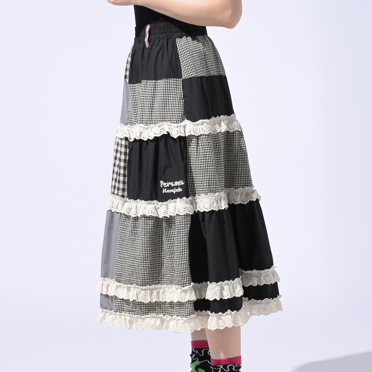 3種類の生地を組合せたティアードスカート。レースをあしらい華やかなデザインに仕上げました
