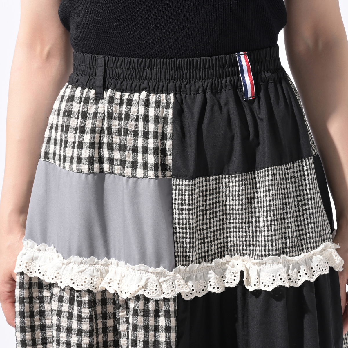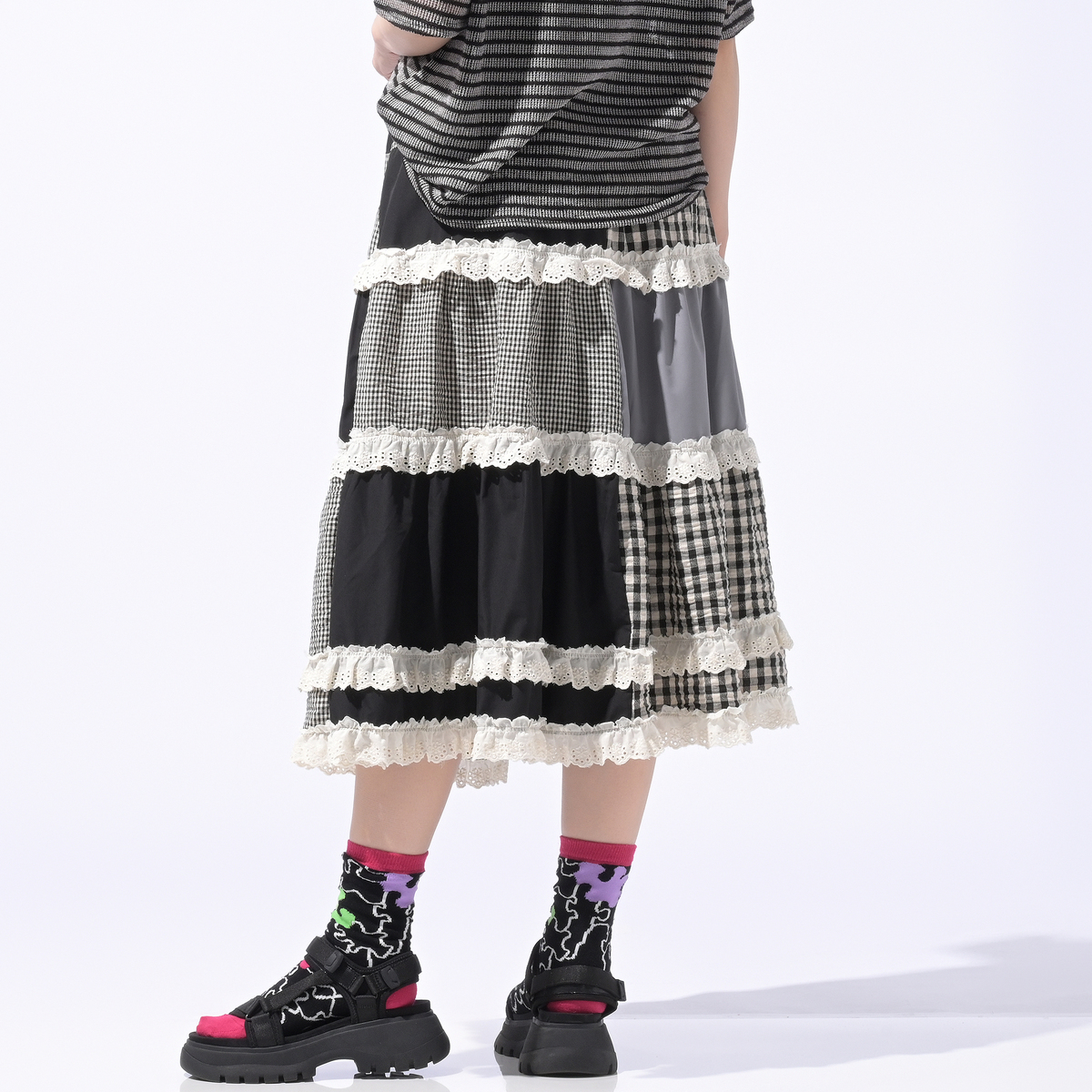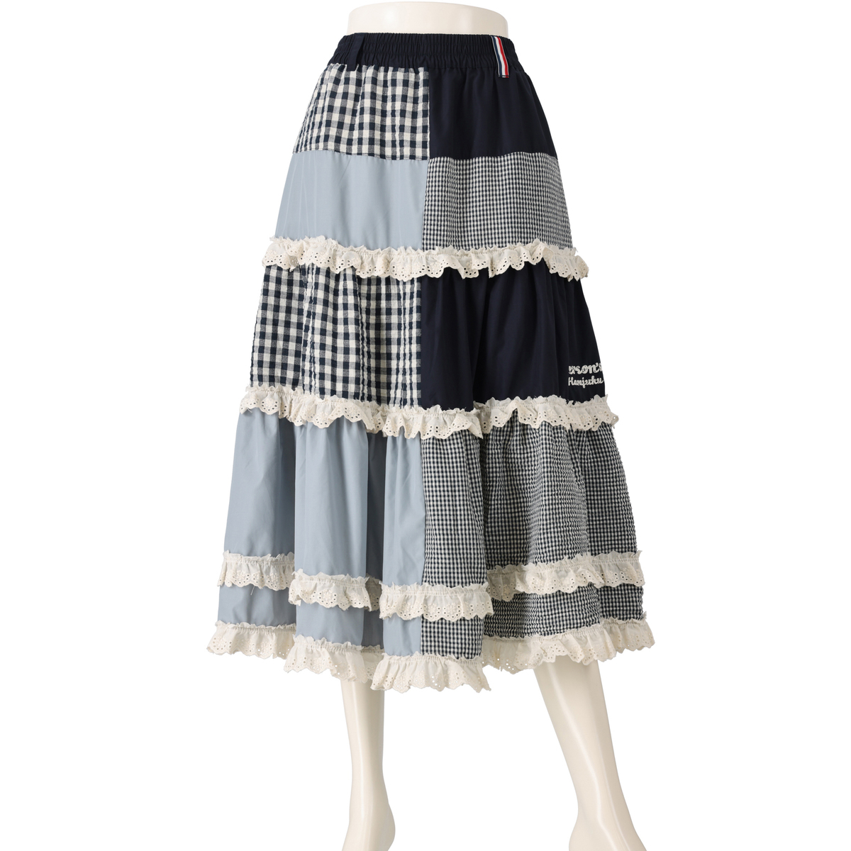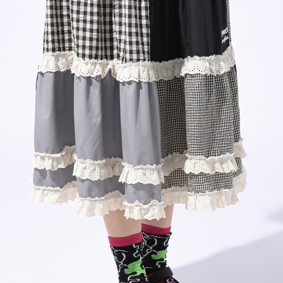 3種類の生地を組合せたティアードスカート。レースをあしらい華やかなデザインに仕上げました