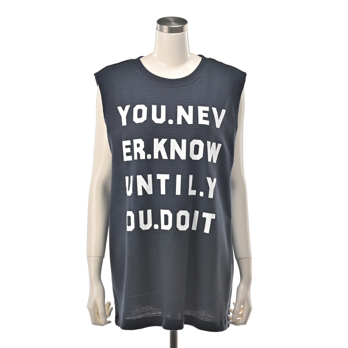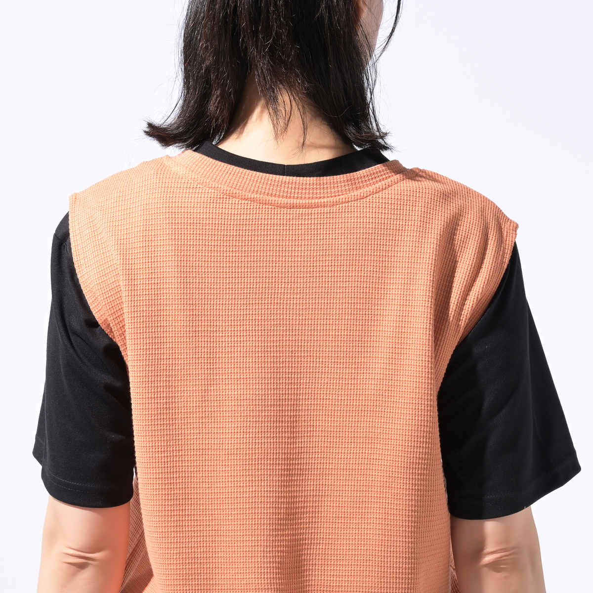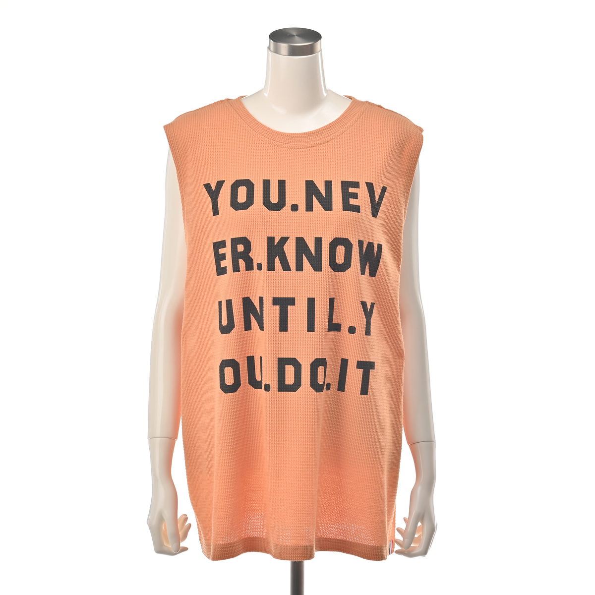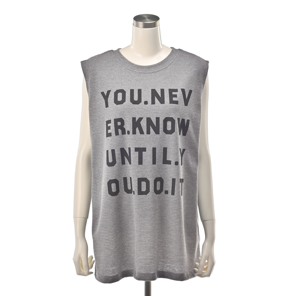 ワッフル素材のノースリーブTシャツ。ゆったりしたサイズ感で、腋の下部分にマチが付いており、肩先まで長さのあるノースリーブデザインです