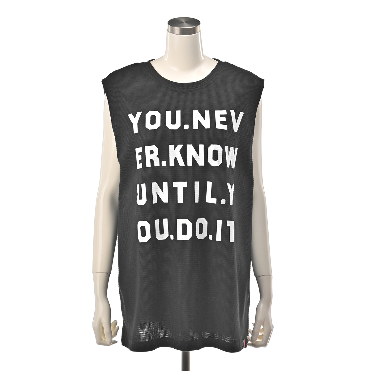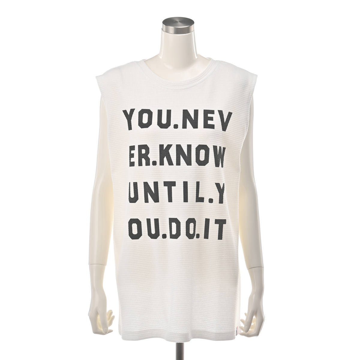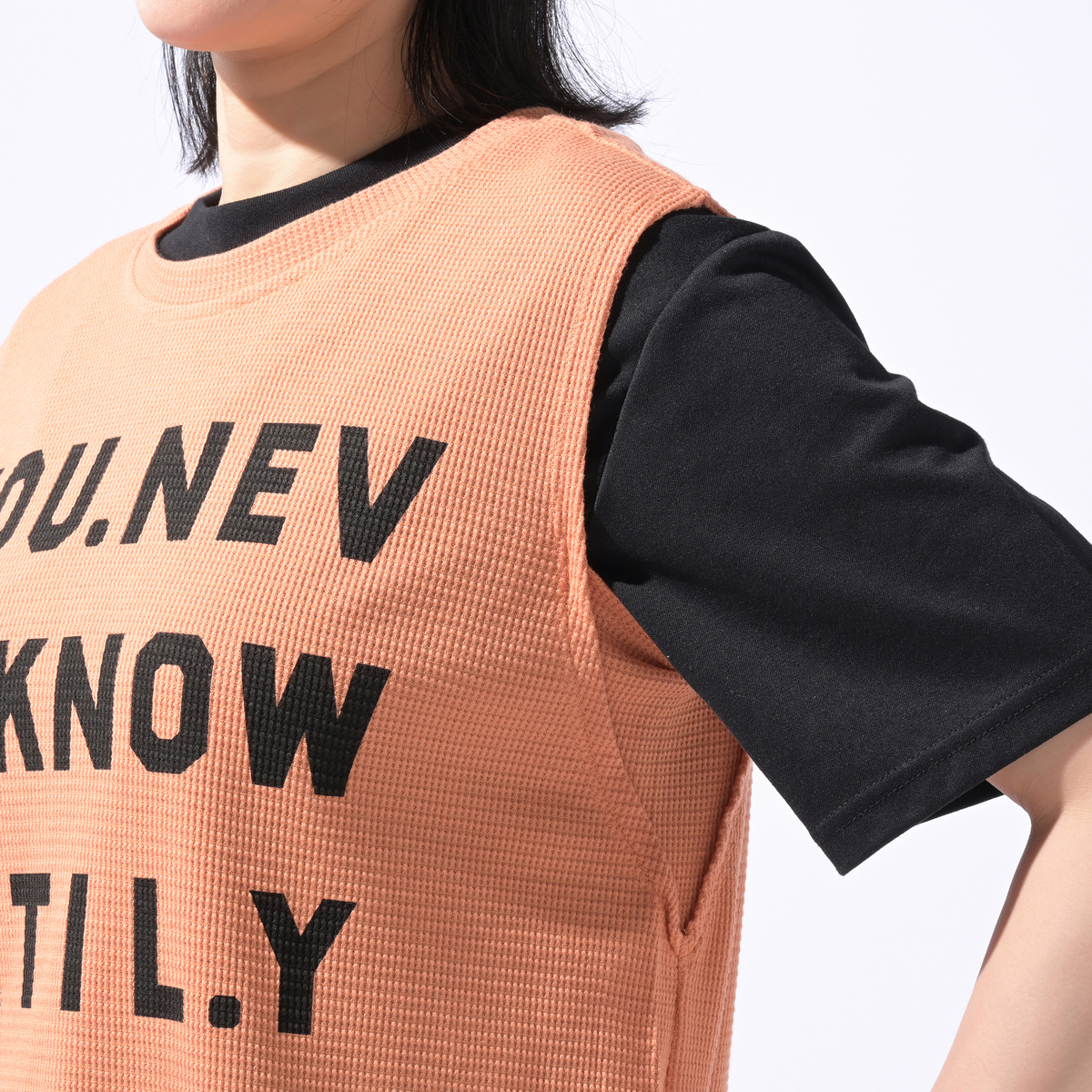 ワッフル素材のノースリーブTシャツ。ゆったりしたサイズ感で、腋の下部分にマチが付いており、肩先まで長さのあるノースリーブデザインです
