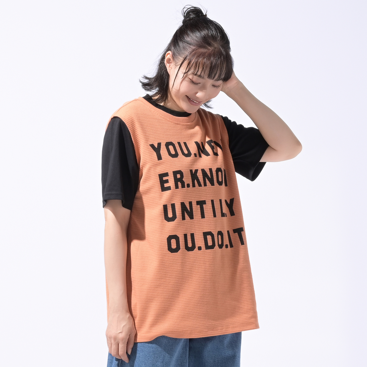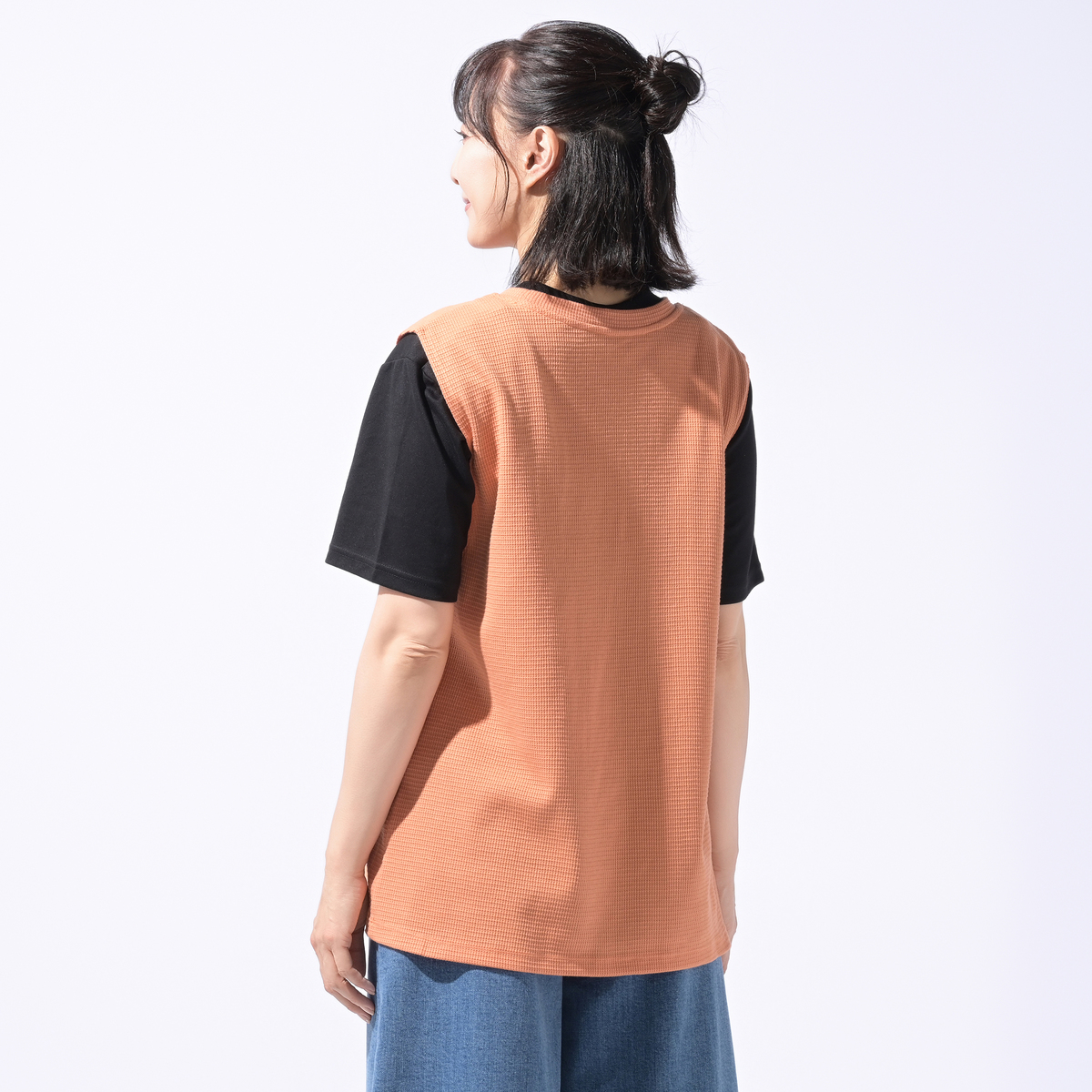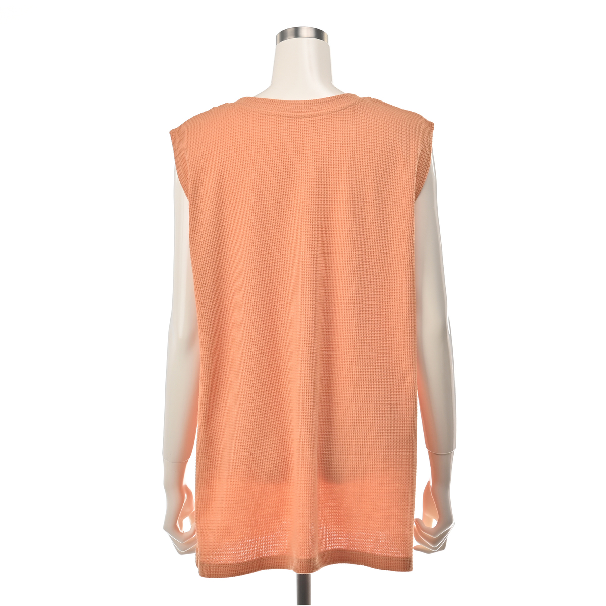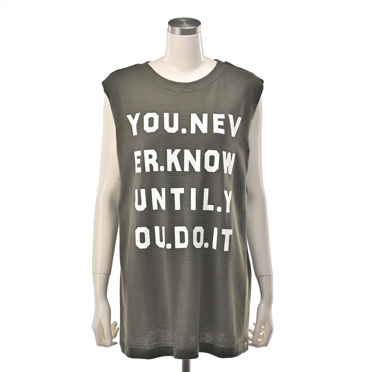 ワッフル素材のノースリーブTシャツ。ゆったりしたサイズ感で、腋の下部分にマチが付いており、肩先まで長さのあるノースリーブデザインです