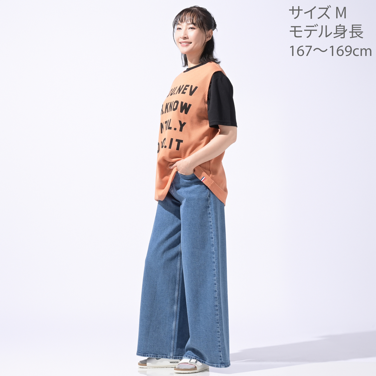せっかく長めのTシャツでヒップ周りがきつかったらどうしようと思っていましたが、 いつものSサイズで余裕でした。 着やすい素材ですし、中に何かもう一点着てベスト風にも着られるし単体でもいける というデザインが良いです。カーキは少し暗めかな。 ただ、正面の文字が主張しすぎなのがちょっと残念でした。