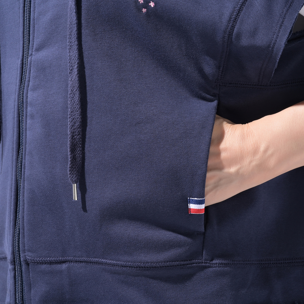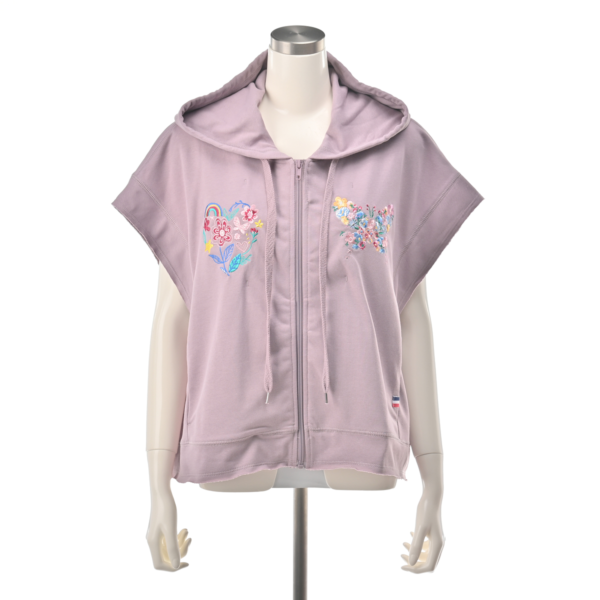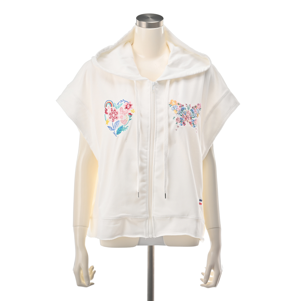 ノースリーブの前開きパーカー。薄手の裏毛素材で仕立てました。ドロップショルダーが腕まわりをさりげなくカバーし、カラフルなフラワー刺繍が着こなしに明るさをプラスします