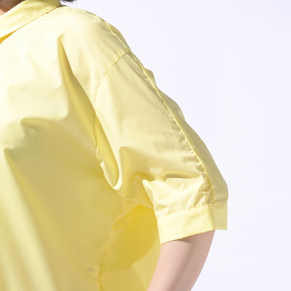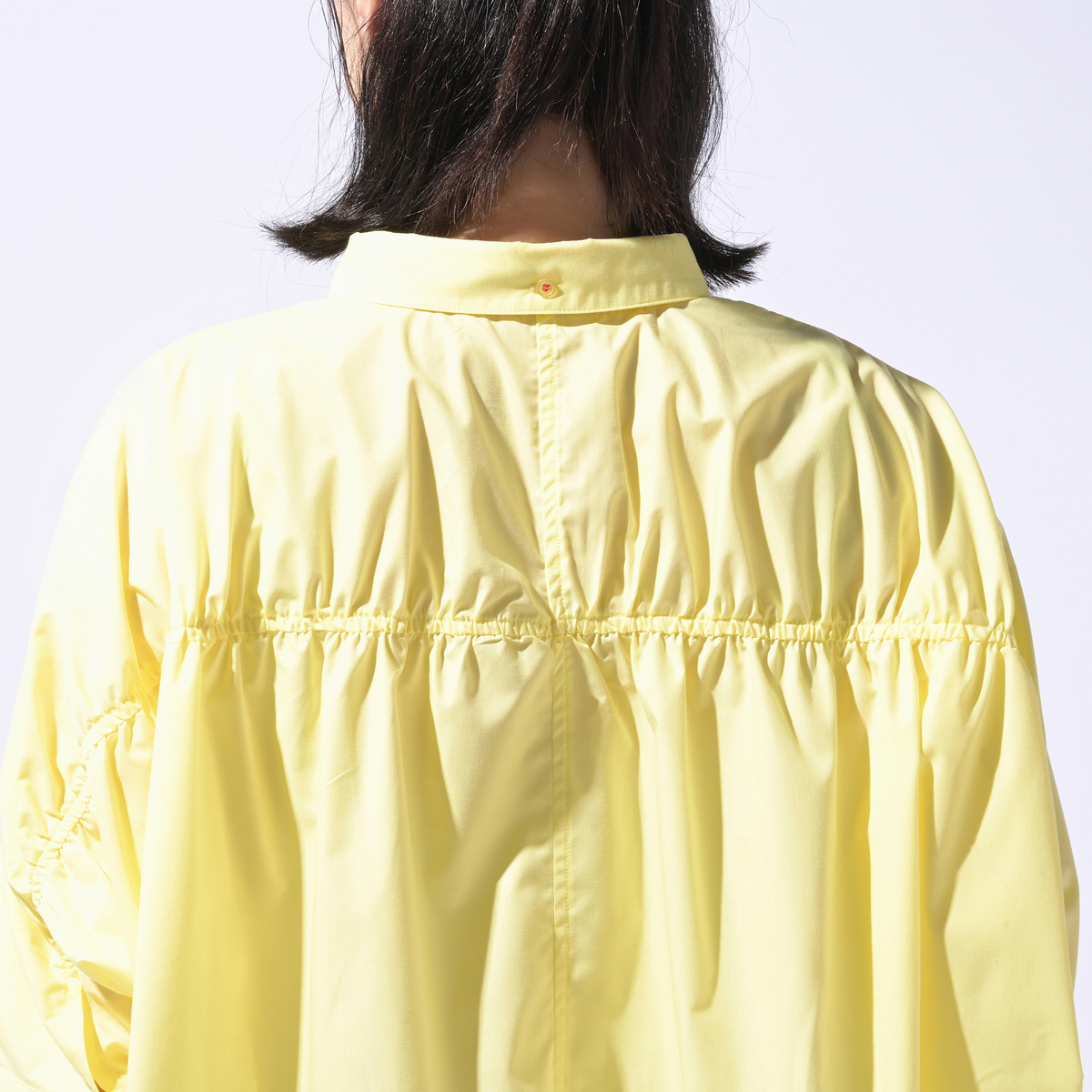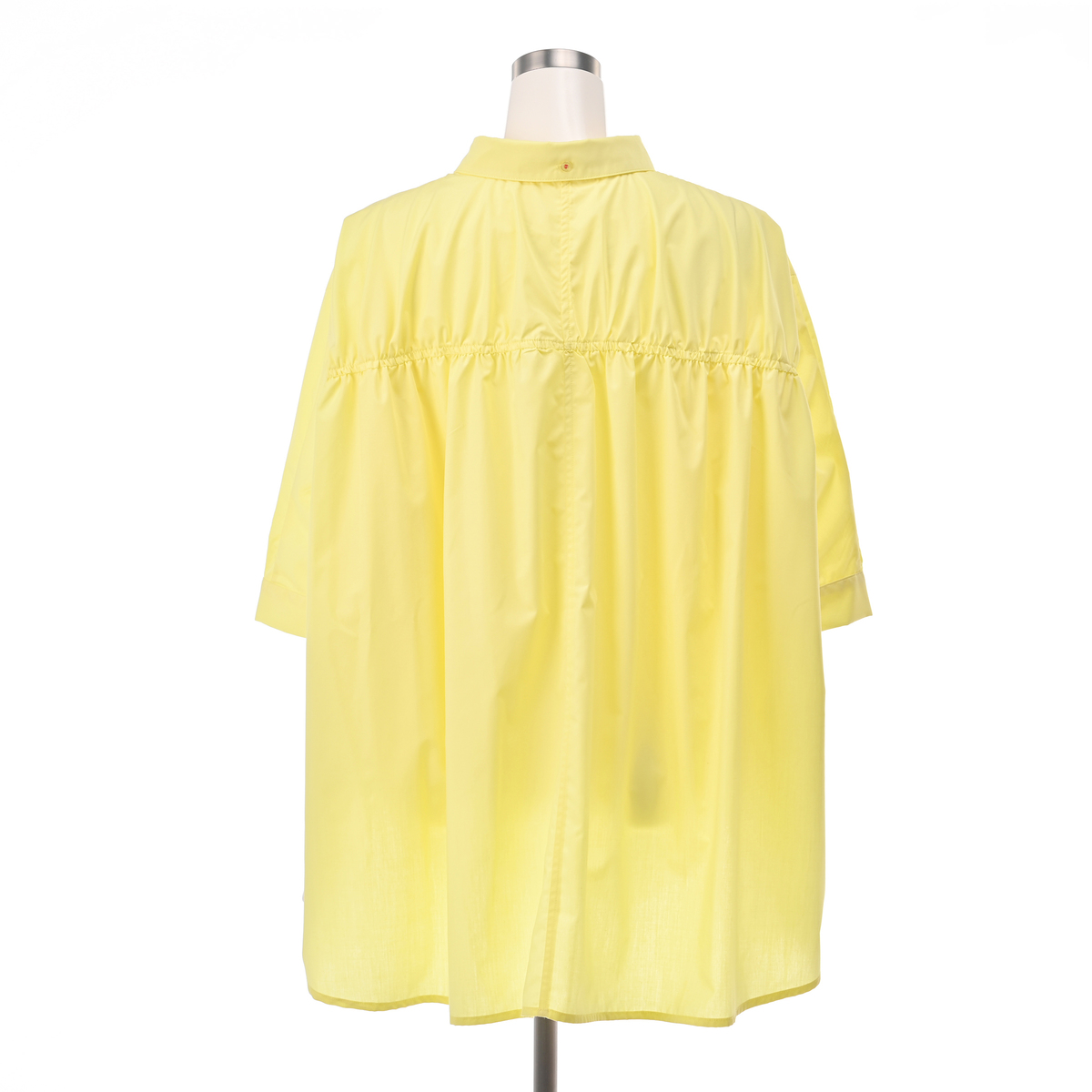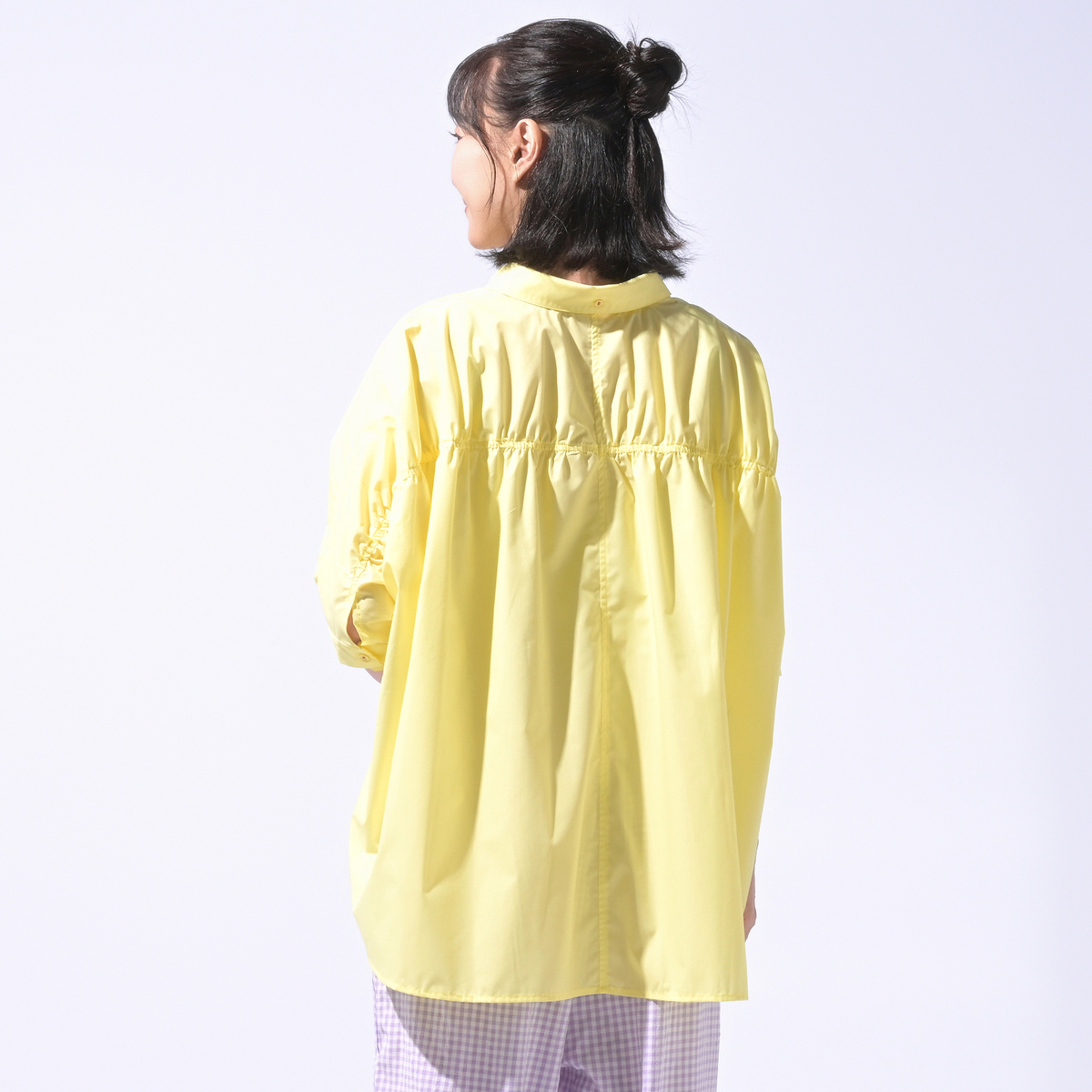 ゆったりシルエットの半袖シャツ。背中のギャザーが目を引く大人可愛い一枚です。長めの袖が、二の腕まわりを自然にカバーします