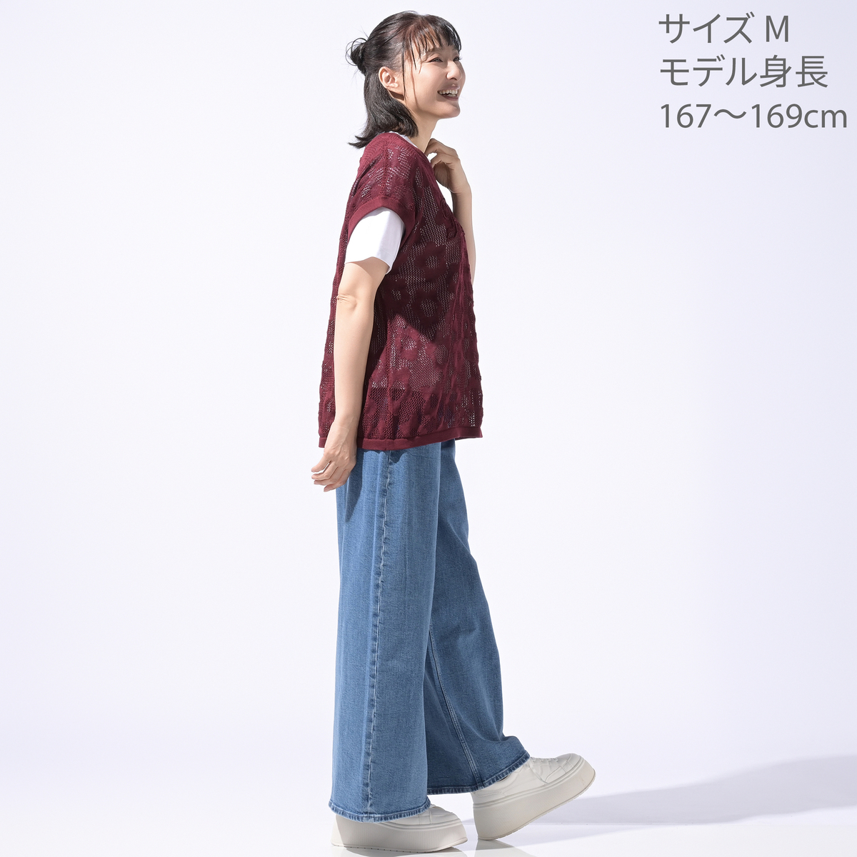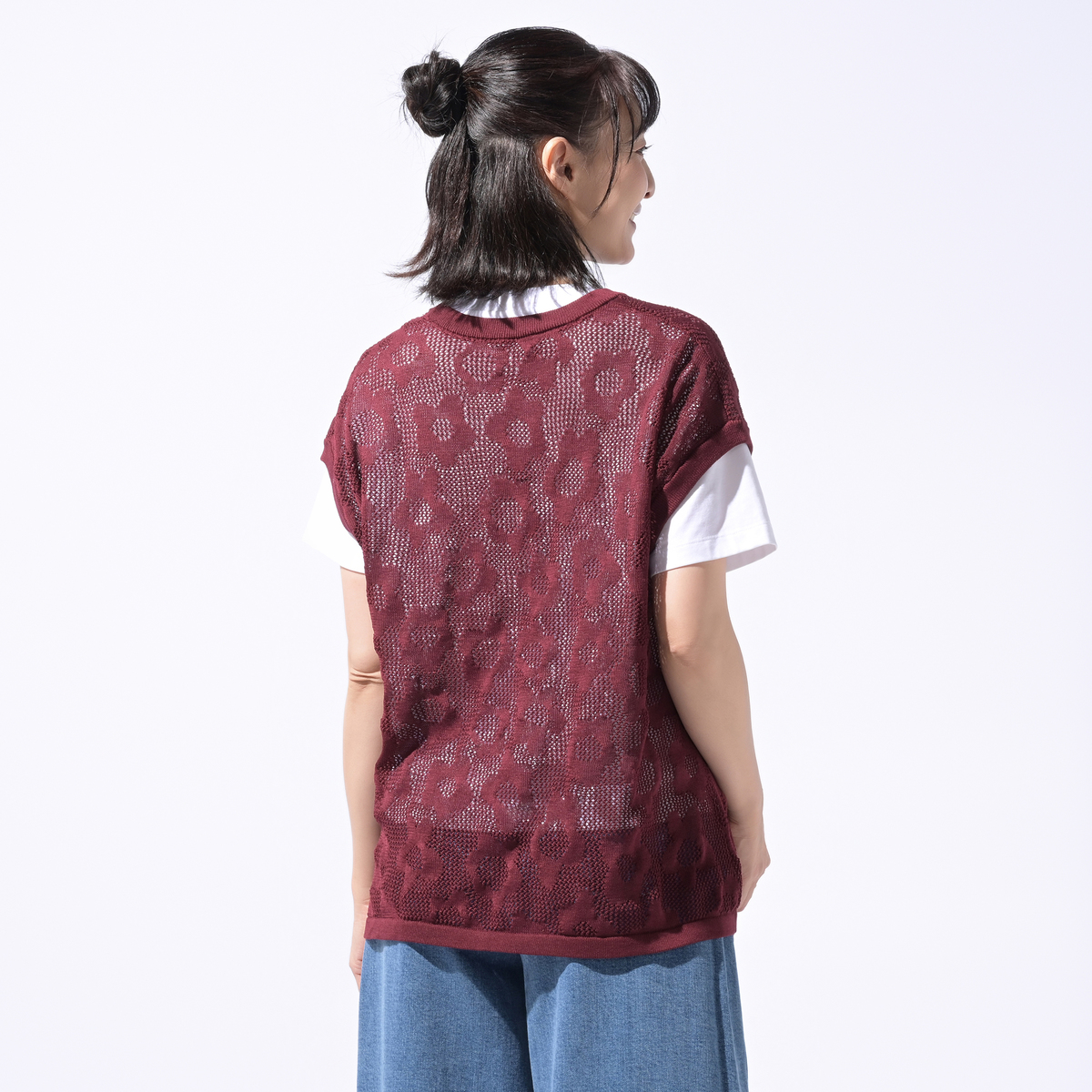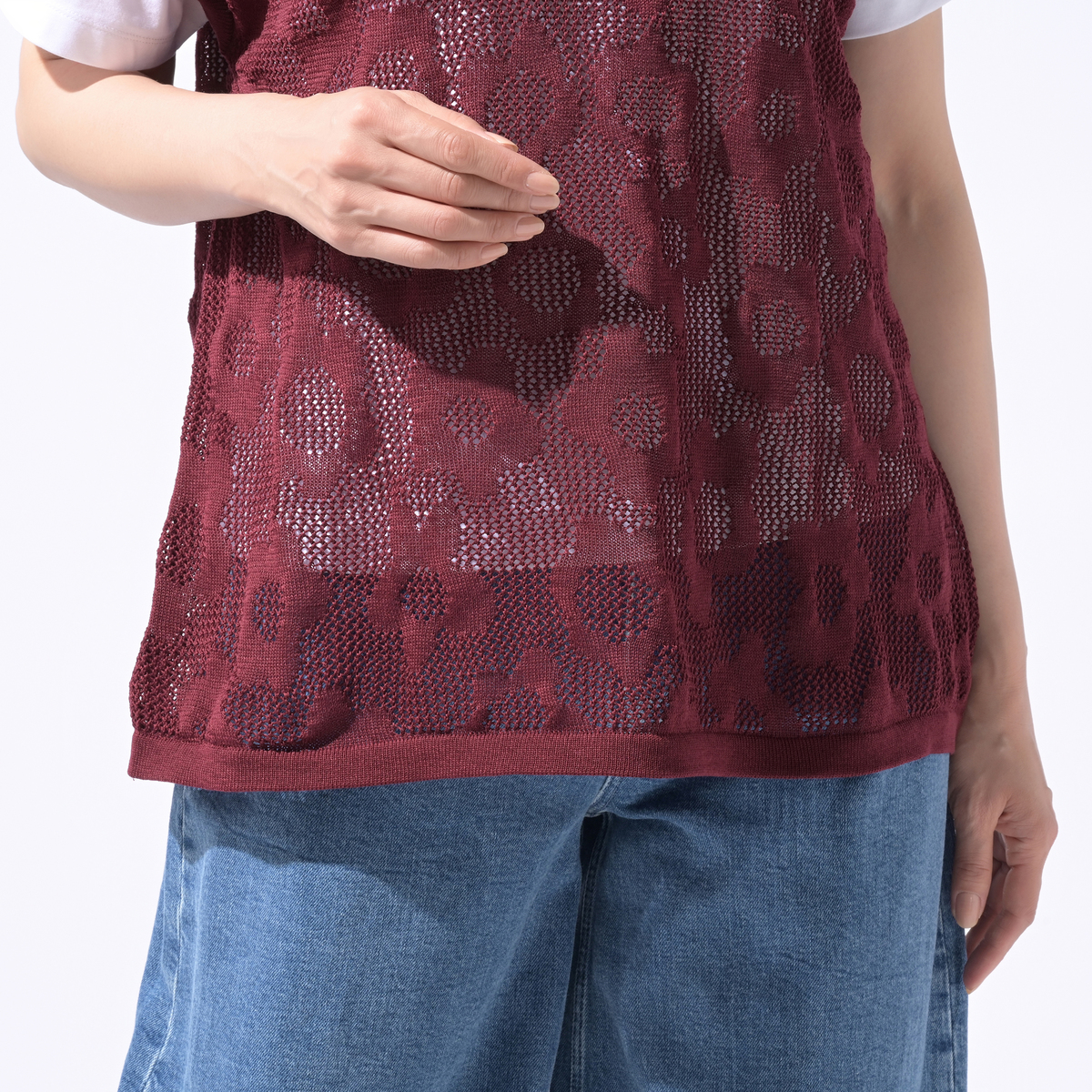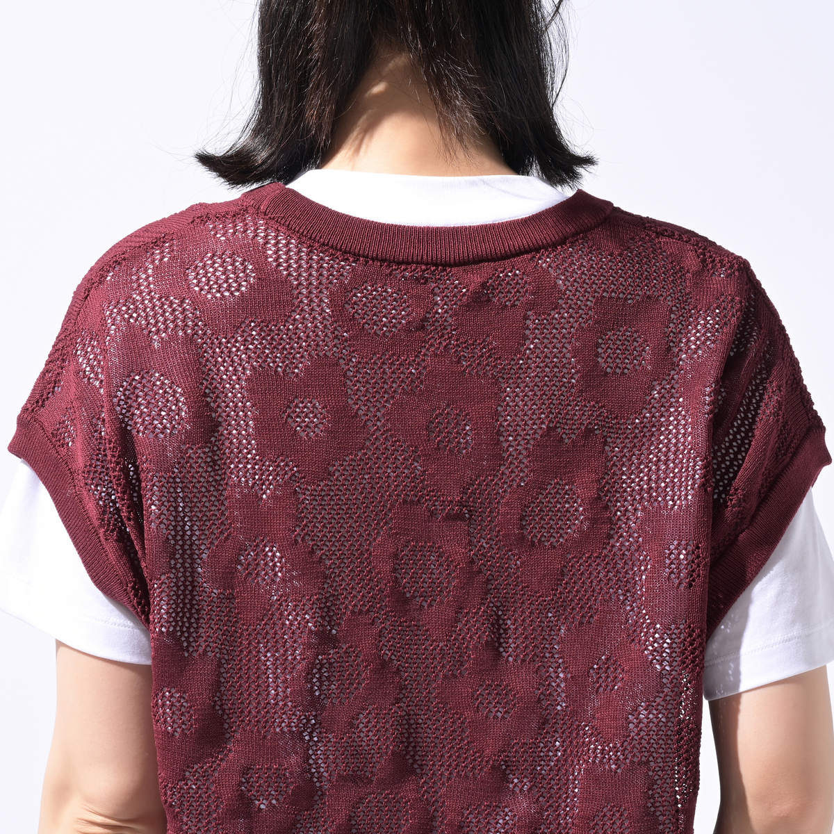 総柄のフラワージャガードが映えるメッシュニットベスト。通気性のある薄手素材で、ワンピースやブラウス、タンクトップとのレイヤードが楽しめます。軽くコンパクトに畳めるため、旅行にも便利です