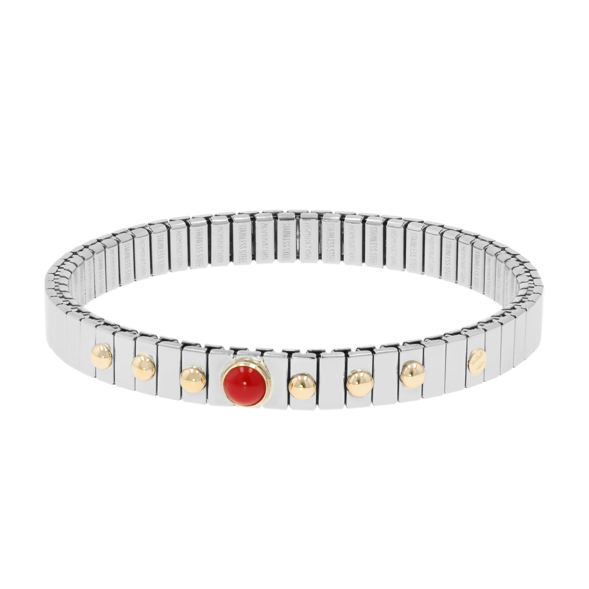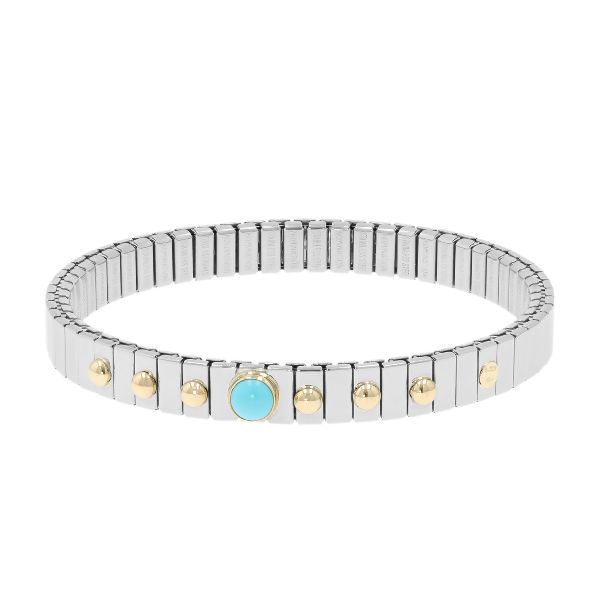 伸縮性のあるデザインで留め具がなく、着脱のしやすさが魅力。ポイントのパーツとセンターストーンの石座には18Kを使用しました。イエローゴールドの輝きがステンレスに映え、高級感を添えます