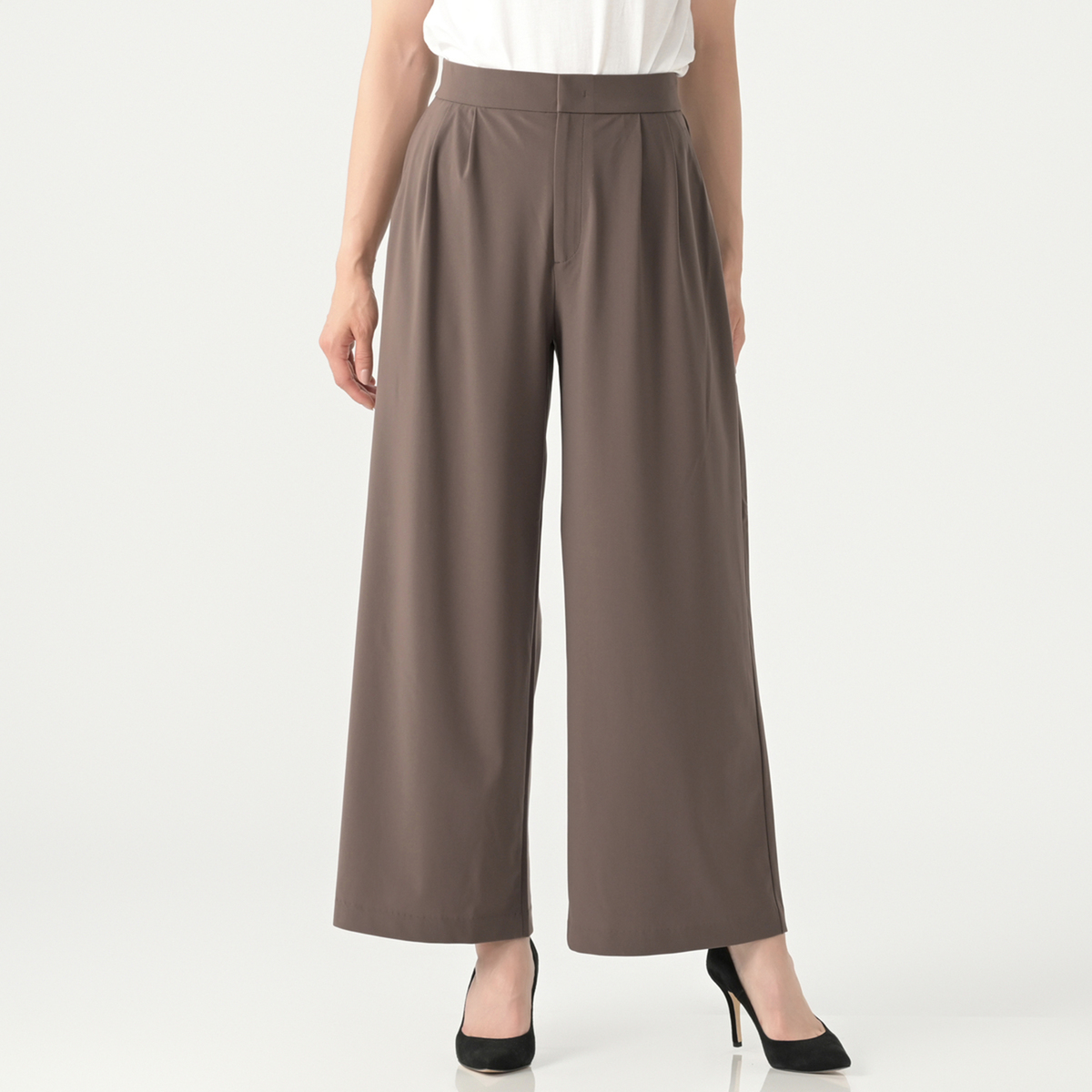 穿き心地やシルエットを追求して仕立てたワイドパンツ。前に左右2本の折り目(タック)を入れることで腰まわりとヒップにゆとりができ、気になる下腹を目立ちにくいようにカバー。座ったときも窮屈さが減り、快適に過ごせるゆったりとしたシルエットです