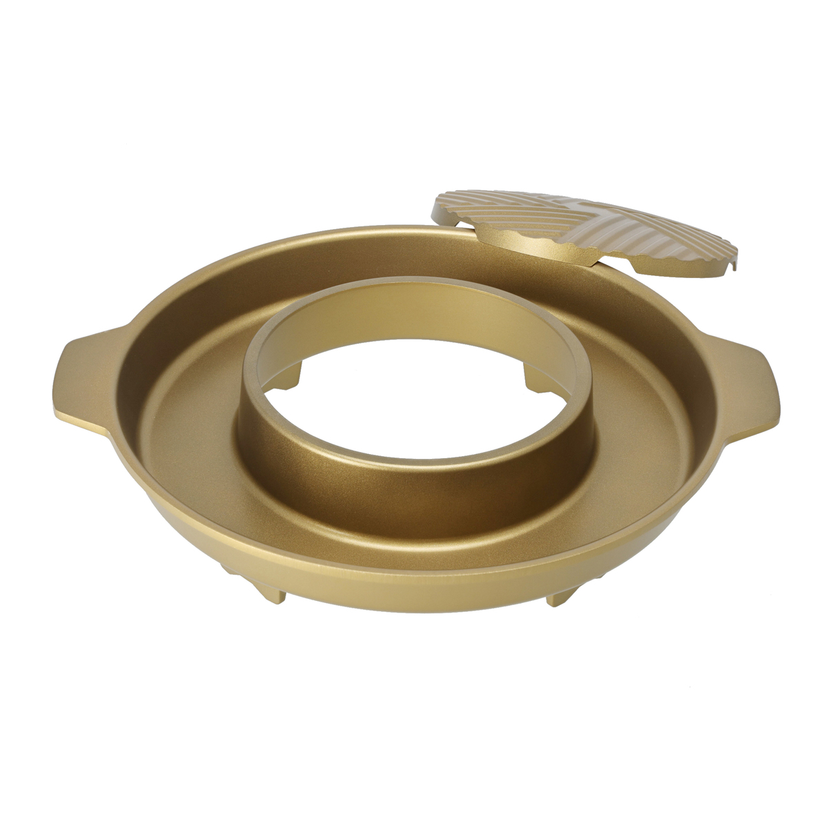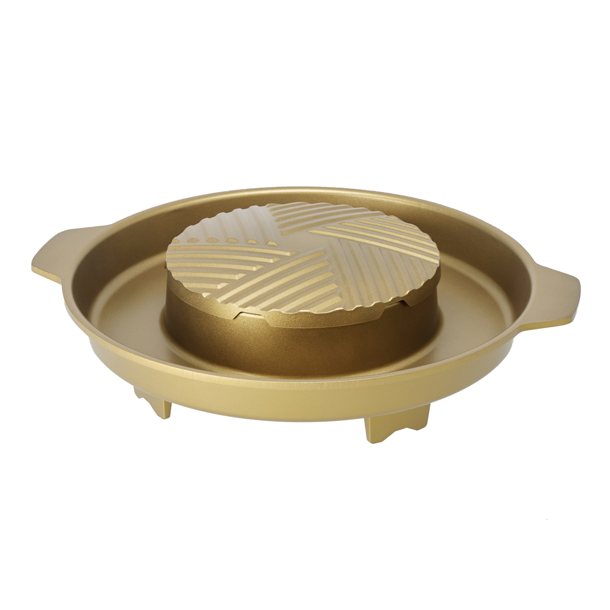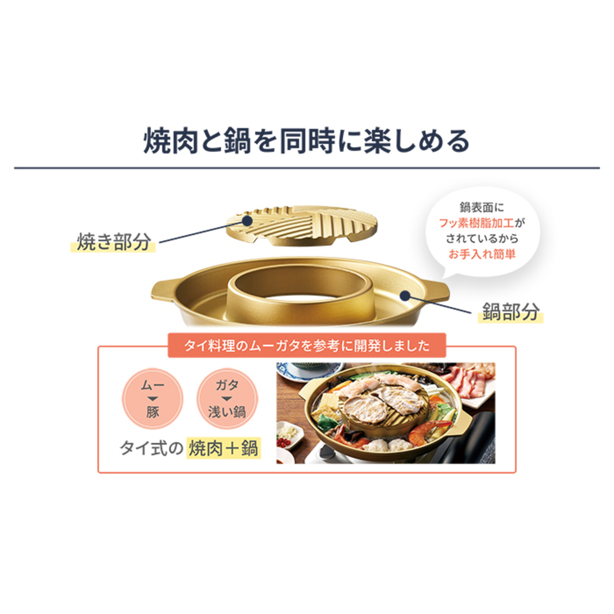 焼き部分と鍋部分が分かれている構造。"焼き部分"で肉やシーフードなどを、"鍋部分"で野菜や豆腐などを煮込むことができるよくばり鍋です。表面にはフッ素樹脂加工を施しています
