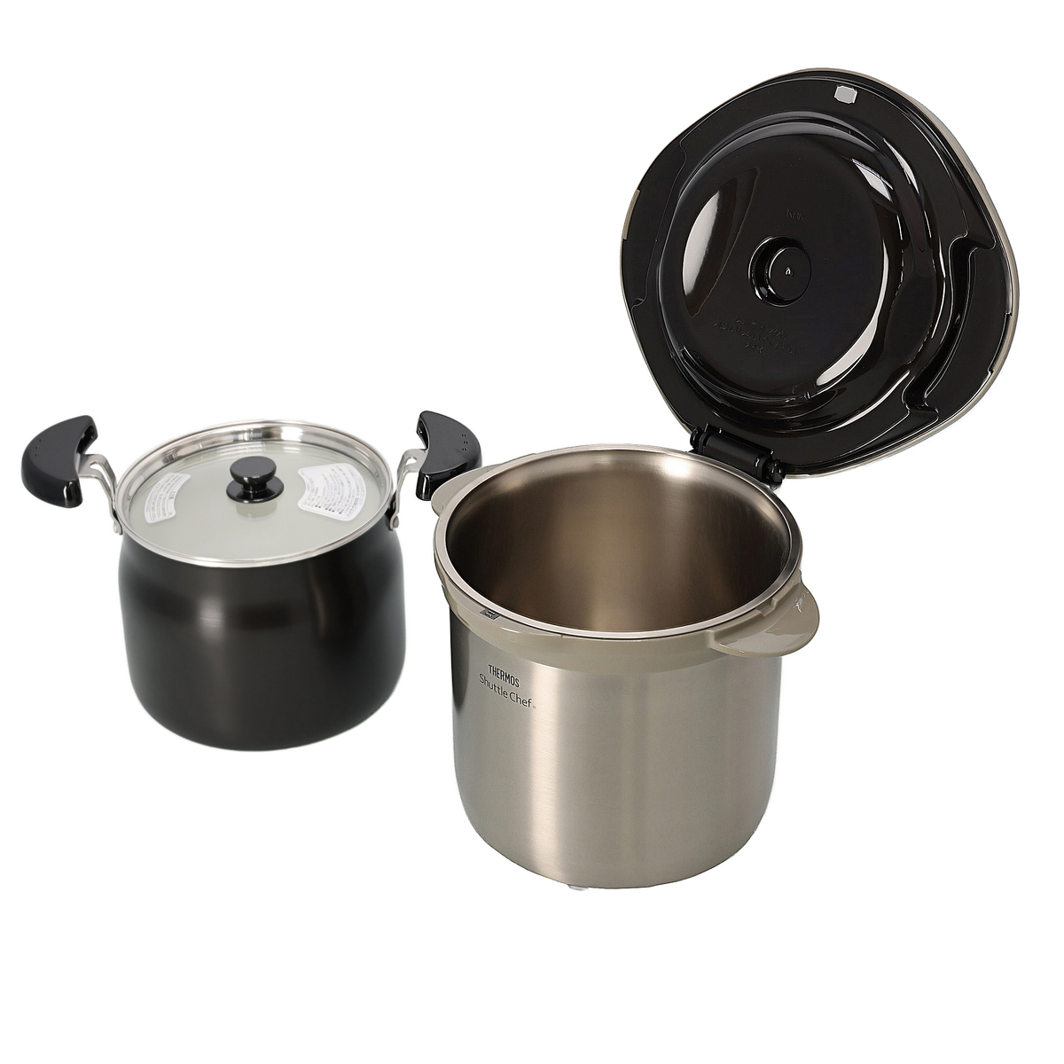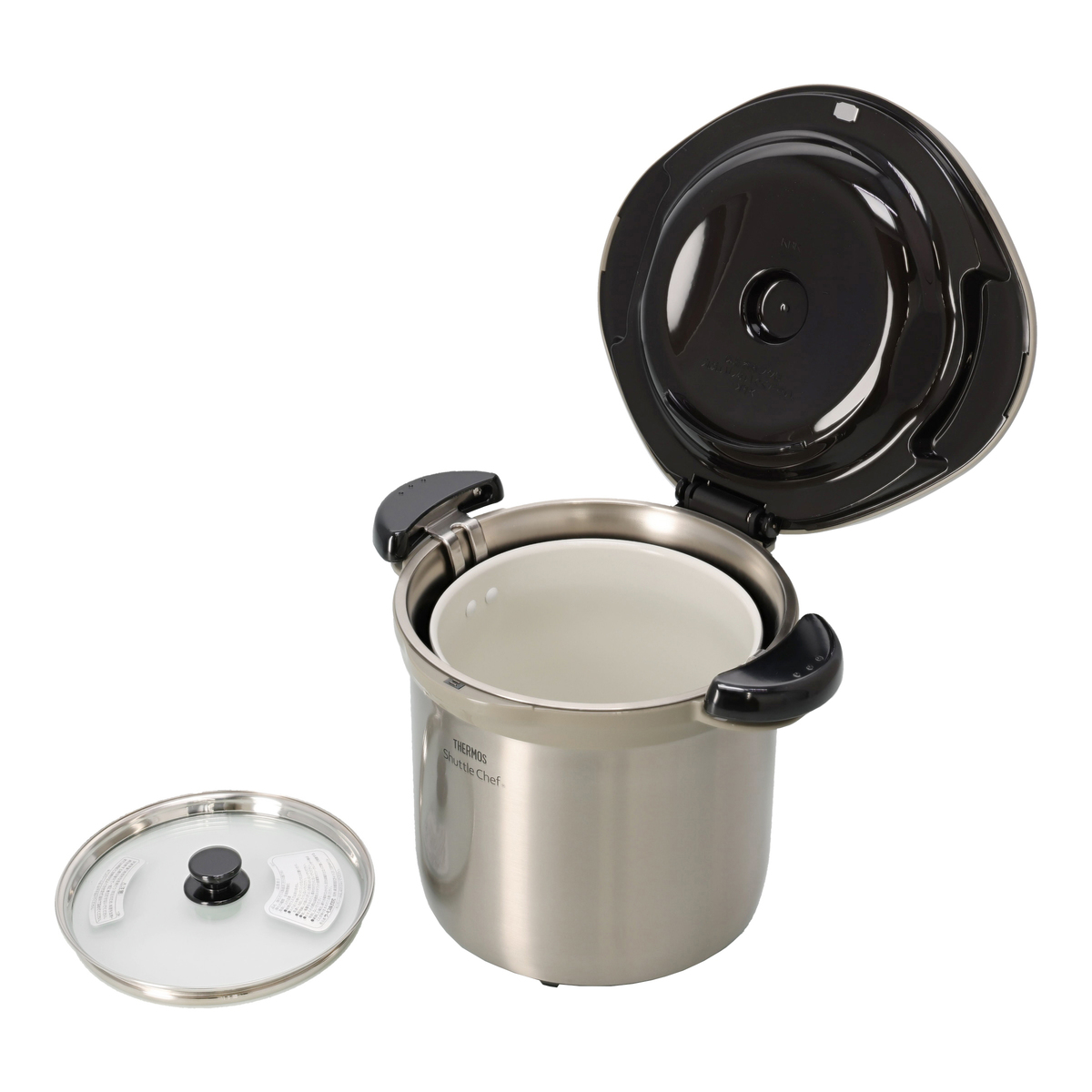 食材を調理鍋で調理し、所定の時間煮立てたら保温容器に入れるだけ。真空断熱構造の保温容器が調理鍋ごと長時間高温に保ち、とろ火にかけたようにじっくり煮込んでくれる“サーモス 真空保温調理器 シャトルシェフ”です