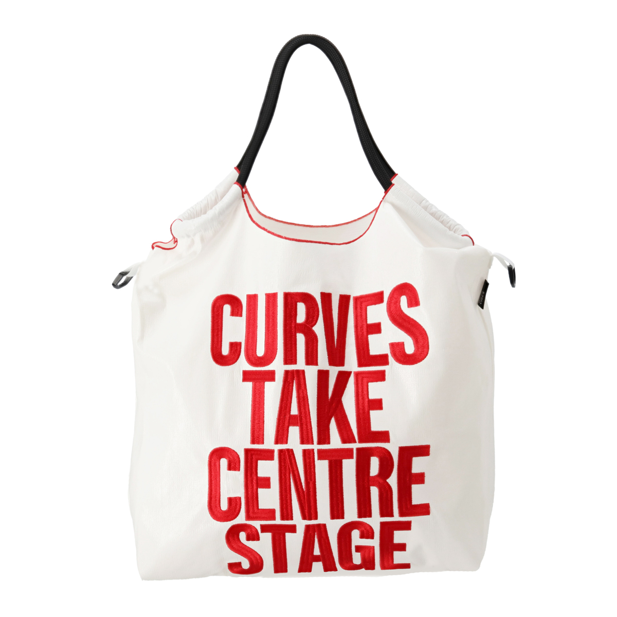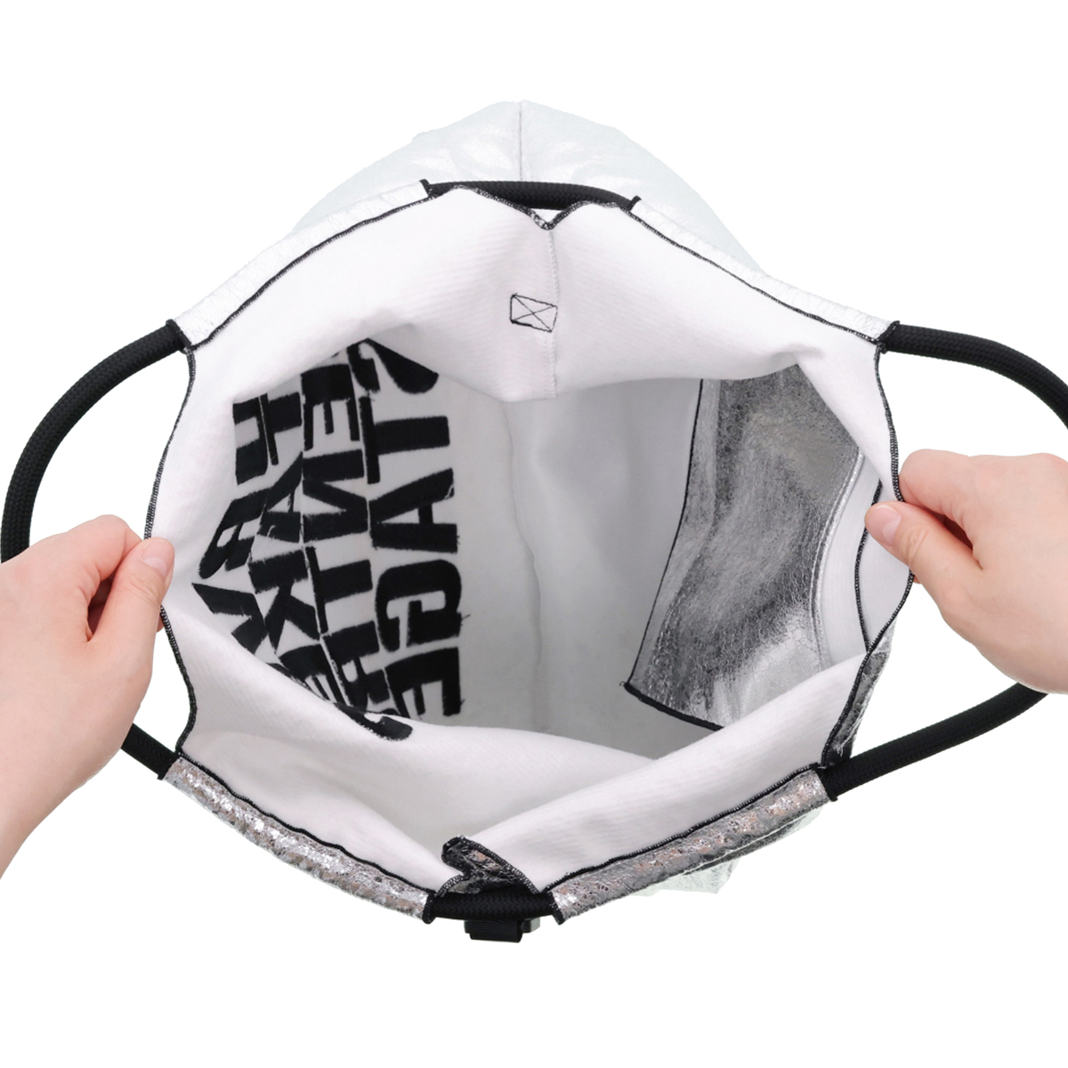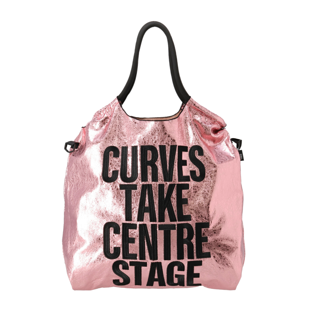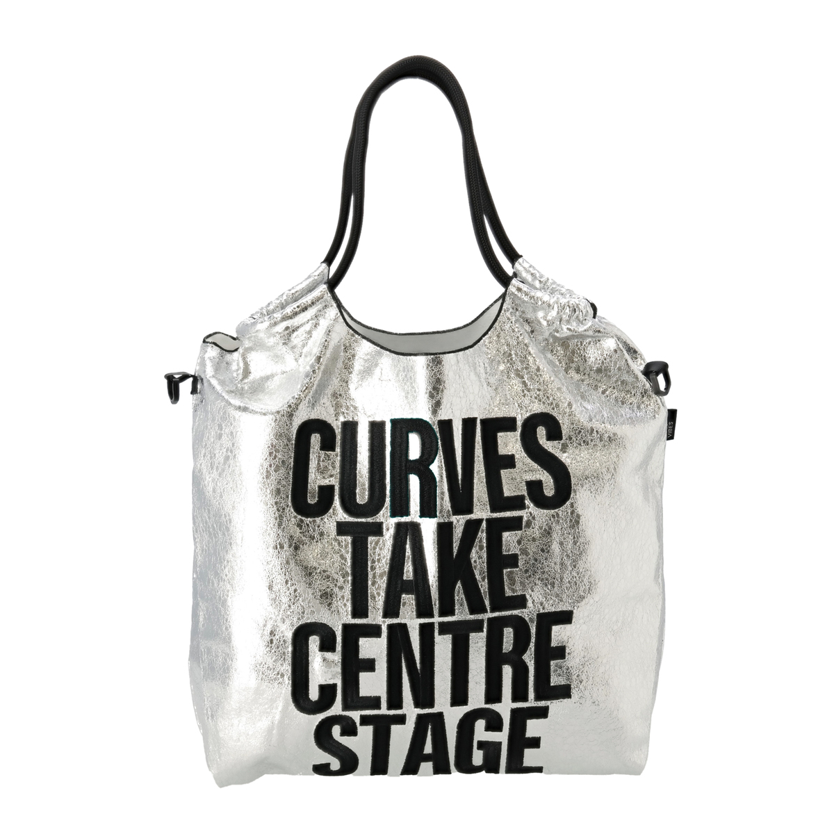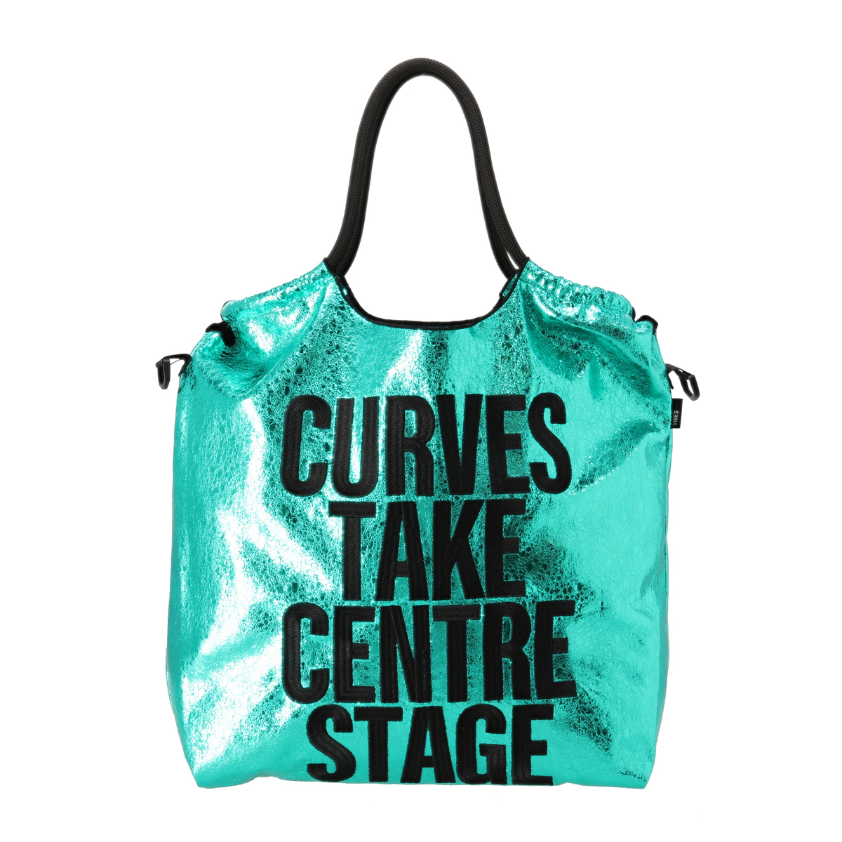 メタリックな素材感とメッセージ刺繍が目を惹くエコバッグ。コーデのポイントになってくれるスタイリッシュなデザインです